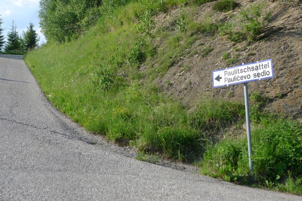 17:41 Uhr: eine lange Abfahrt über mehrere Serpentinen ist der Lohn für die Mühen des Aufstiegs. Nun stehen wir am Abzweig zum Paulitschsattel. Eine schmale Straße führt uns wieder zurück nach Slowenien. Nachdem der tiefste Punkt durchfahren ist wird es auch gleich wieder richtig steil. Die nächsten fünf Kilometer können mit einer anstrengenden 10% Durchschnittssteigung aufwarten, in Spitzen bis 14 Prozent.
