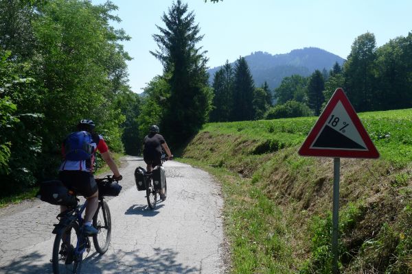 10:42 Uhr: wir erreichen mit Vuzenica eine größere Stadt uns sind wieder auf Flussniveau. Am Ortsausgang schockt uns ein Schild, das 18% Steigung anzeigt. Die ist aber weitaus harmloser als angekündigt, hat vielleicht 12% und ist auch nicht sehr lang. So sind wir aber wieder „auf der Höhe“ und fahren weiter durch eine schöne Landschaft mit Wäldern, Wiesen und verträumten Bauernhöfen.