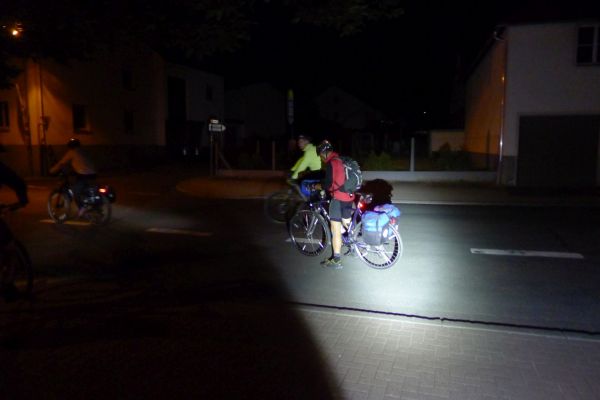 4:24 Uhr: in Vollnkirchen ist es noch stockdunkel, kein Mensch „uff de gass“, bis auf 6 dunkle Gestalten, die sich mit Rad, Packtaschen und Rucksäcken bepackt am Dorfplatz eingefunden haben. Das Projekt „AlpenX Nr 6“ kann beginnen…..