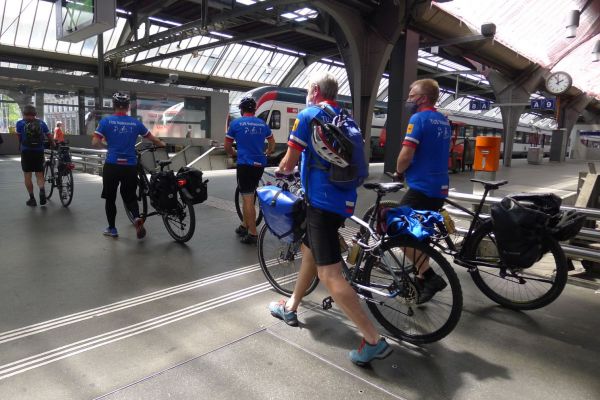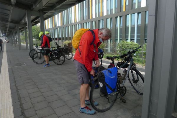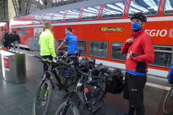 6:55 Uhr: Dank dem großartigen Engagement der Zugführerin stehen unsere Räder nun in der ersten Klasse, je zwei Räder pro Abteil. Der Corona-Abstand muss auch hier eingehalten werden….. Wir verlassen Frankfurt Richtung Stuttgart.