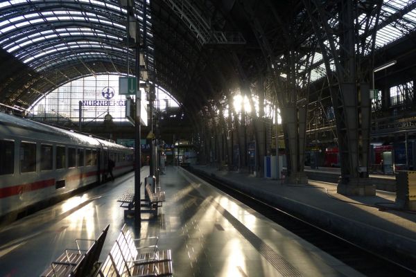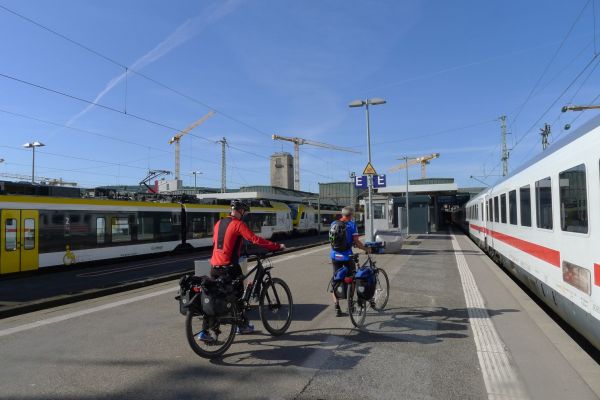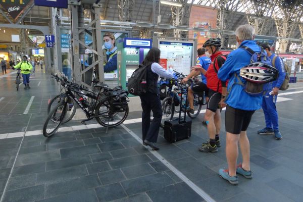 6:20 Uhr: Ankunft in Frankfurt, wir positionieren uns mit den Rädern am Bahnsteig, während Klaus unterwegs zum Infoschalter ist. Da kommt auch schon die Zugführerin auf uns zu und fragt „Sie sind angemeldete Radgruppe ? ich weiss noch nicht genau wie, aber ich nehme sie alle mit“.