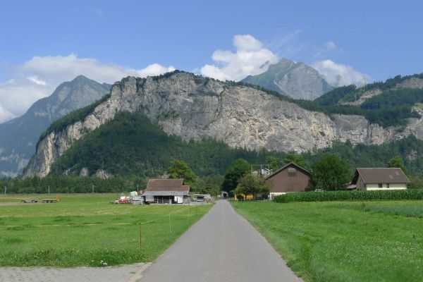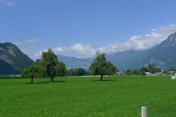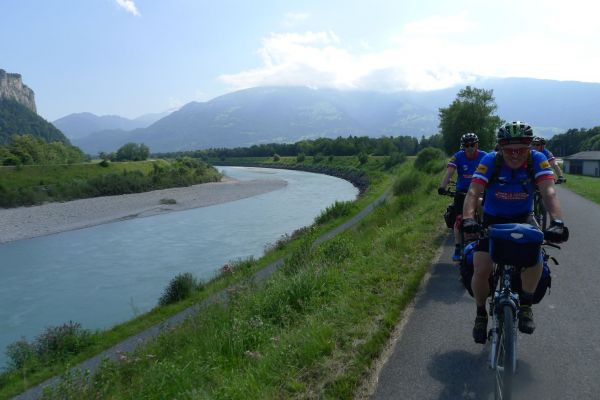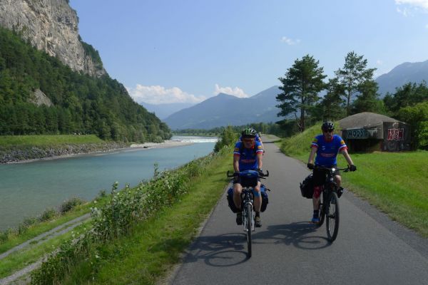 15:21 Uhr: Ankunft in Sargans mit gut einstündiger Verspätung. Die Sonne brennt vom Himmel, wir legen Sonnencreme auf und fahren los. Durch Felder und Wiesen geht es auf den Rhein zu, vor uns erhebt sich der markante Gipfel des Ellhorn, was für ein Panorama…. Der Rheindamm ist erreicht. Grünblau leuchtet das Wasser, wir folgen dem Fluss abwärts nach Norden. Nur der Wind bläst uns unaufhörlich ins Gesicht.