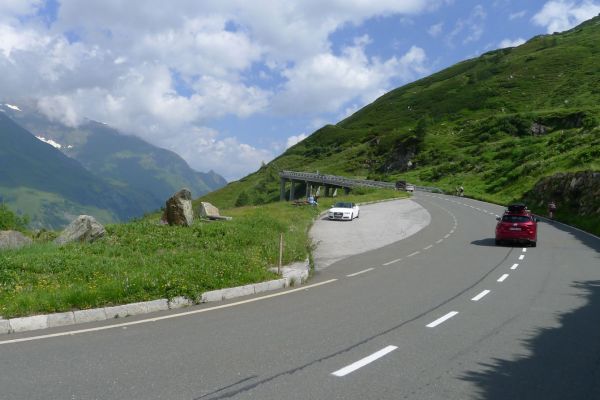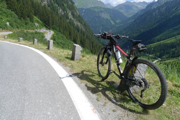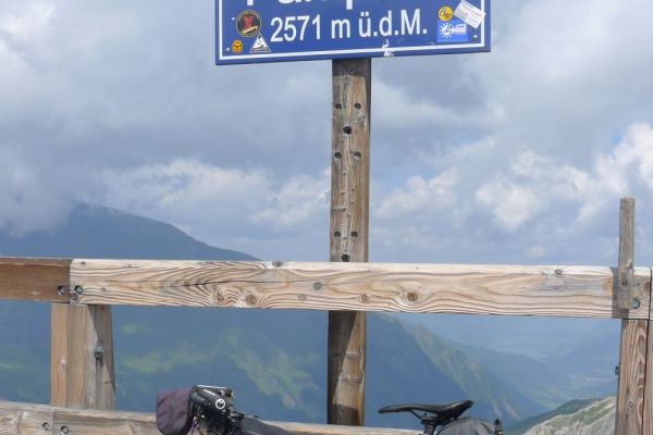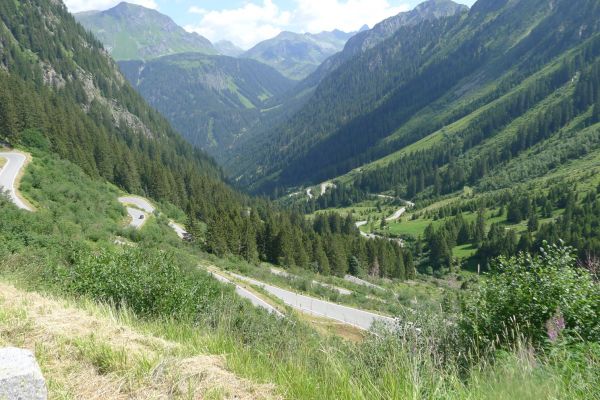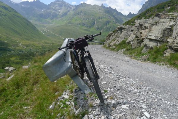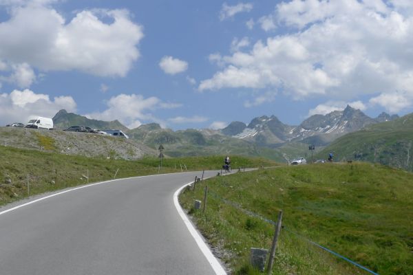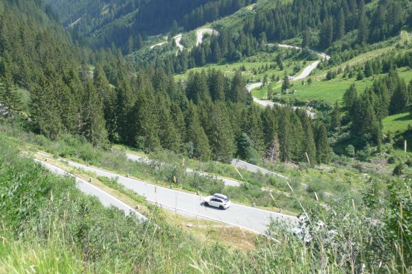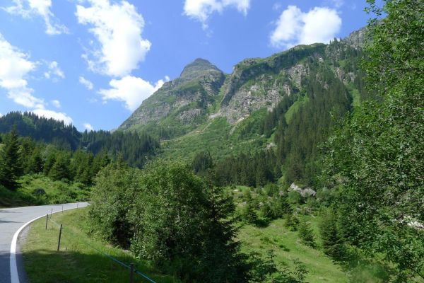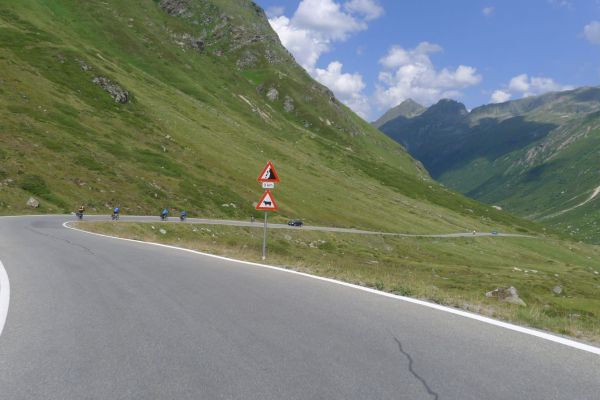10:54 Uhr: kurz hinter Partenen erreichen wir den Einstieg der Silvretta Hochalpenstraße. Über 31 Kehren auf 15km Länge windet sich der Anstieg hinauf auf die Bieler Höhe. 980 Höhenmeter erscheinen erstmal nicht allzuviel, aber die Rampen zwischen den Kehren sind mit 9-12% recht steil, die Kehren selbst eng und bieten wenig Zeit zur Erholung. Hinzu kommen Temperaturen von 30°C und das Gewicht des Gepäcks am Rad oder auf dem Rücken.