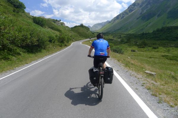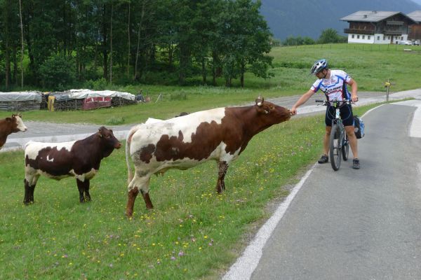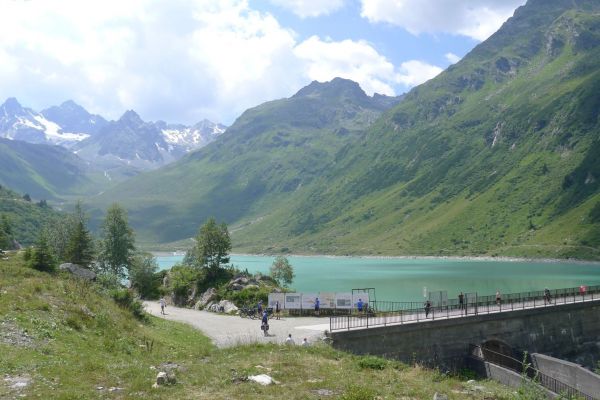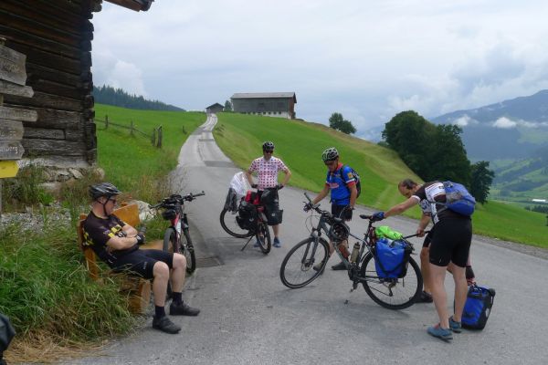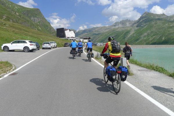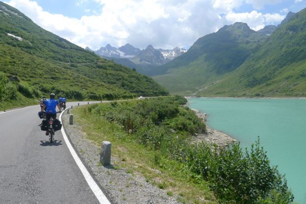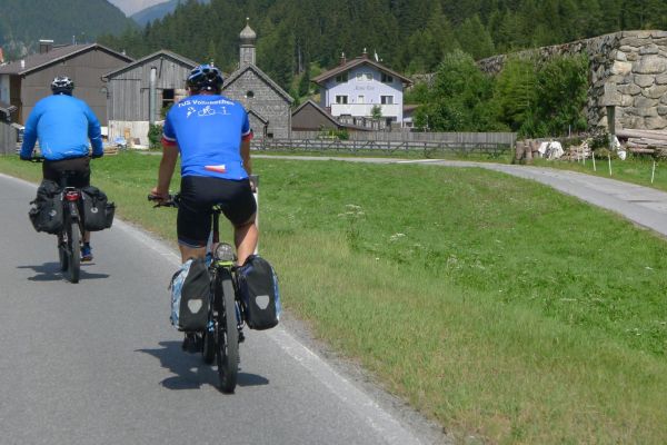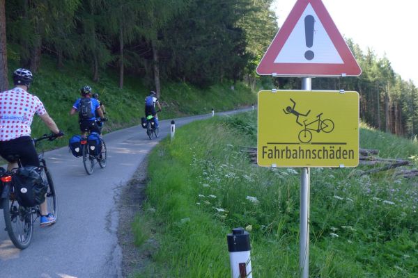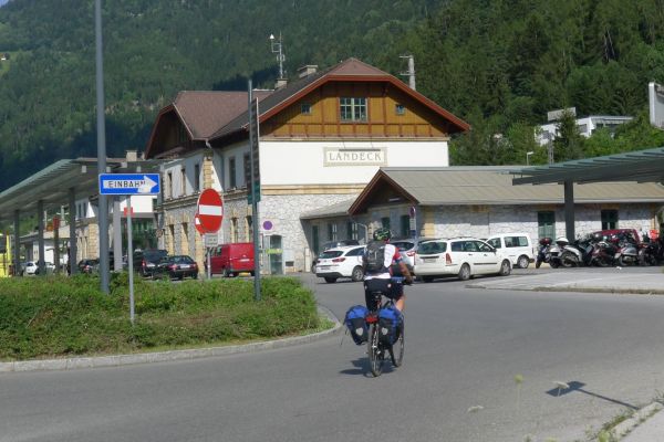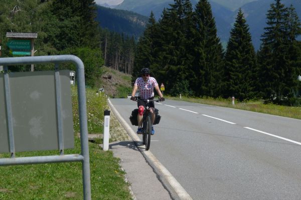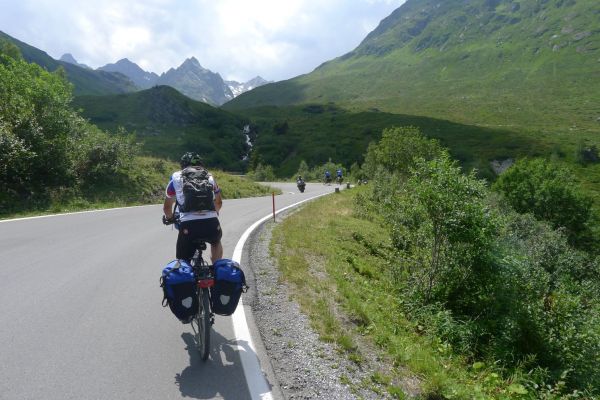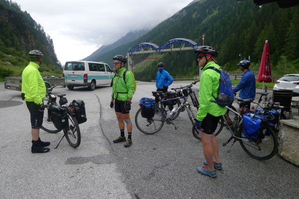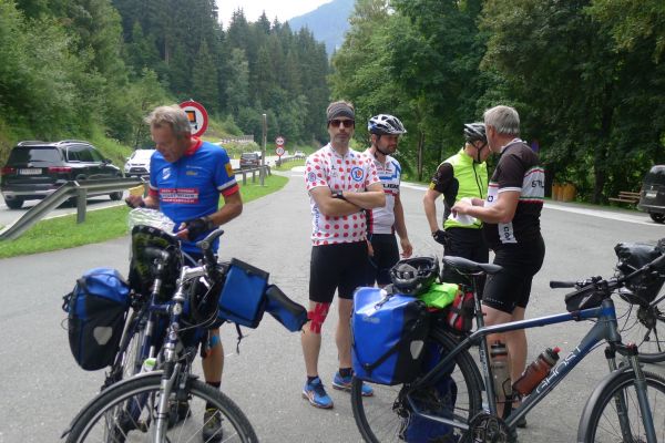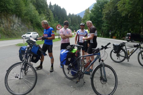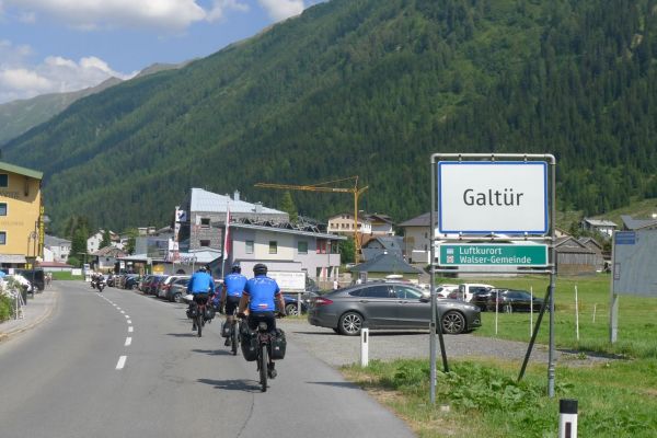 15:00 Uhr nach einem Gruppenbild vor dem Silvretta-Stausee geht es auf die Abfahrt. Noch 53 km bis nach Landeck und wir müssen den Zug erreichen, der uns zum nächsten Etappenort bringen soll. Um Zeit zu sparen bleiben wir auf der Bundesstrasse und rauschen mit hoher Geschwindigkeit durch das Paznauntal. Dörfer wie Galtür und Ischgl durchfahren wir im Eiltempo. Kurz vor Landeck kommt nochmal ein Anstieg und das Erreichen des Zuges schein in weite Ferne zu rücken.
