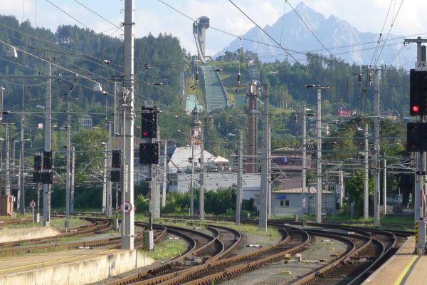 16:50 Uhr: Punktlandung. Wir treffen auf dem Bahnsteig des Bahnhofes Landeck-Zams ein. In 10 min fährt der Zug ab. Der bringt uns aber nur bis Innsbruck, wo wir 1h 20 min Aufenthalt haben. An einer heißen Theke bei einem Supermarkt fassen wir etwas zu essen, ehe es mit einem weiteren Umstieg in Wörgl nach Zell am See geht.