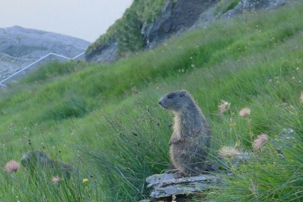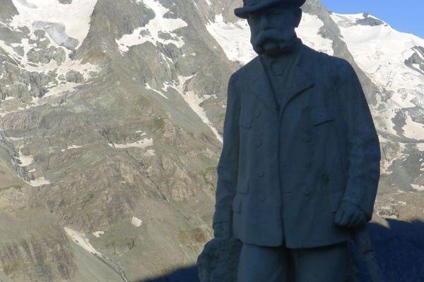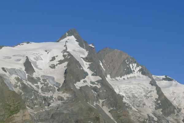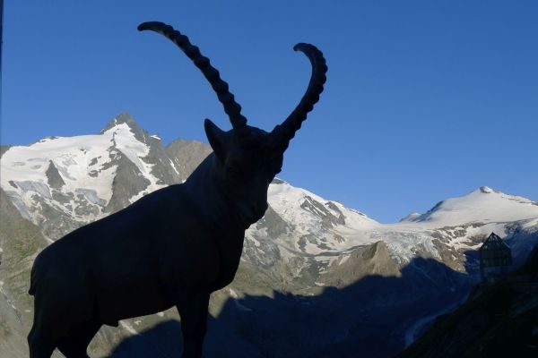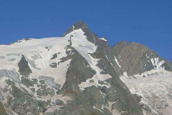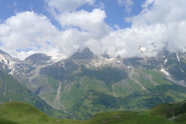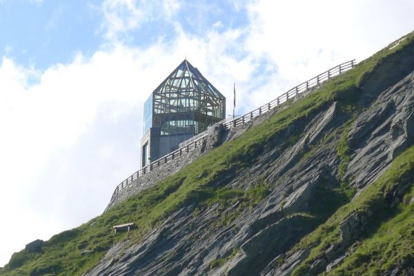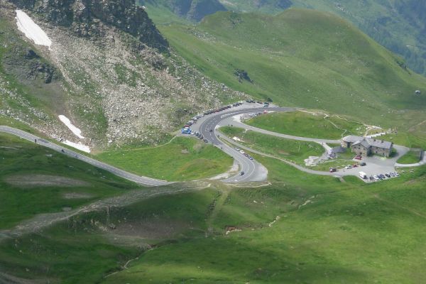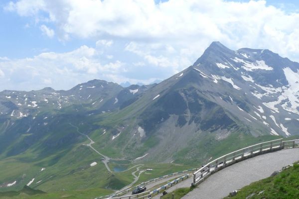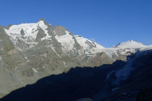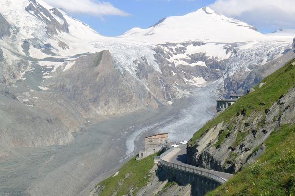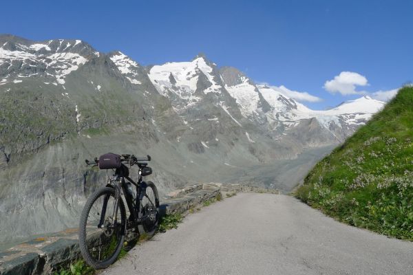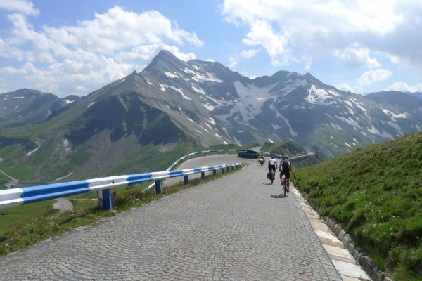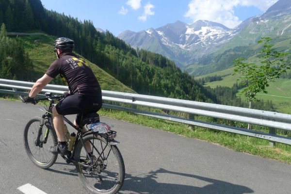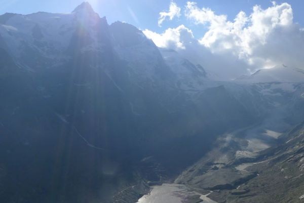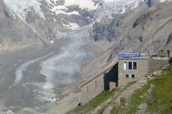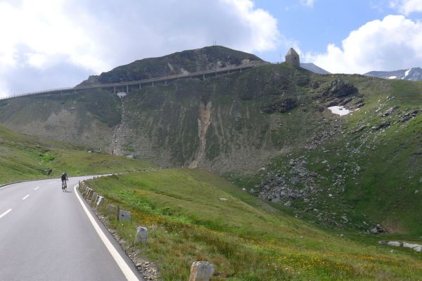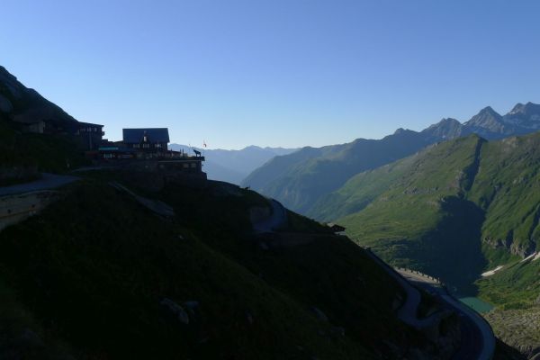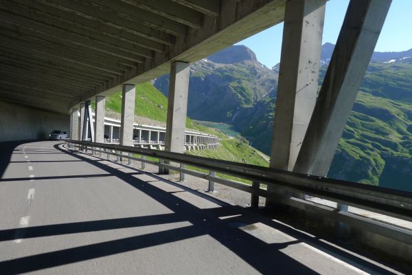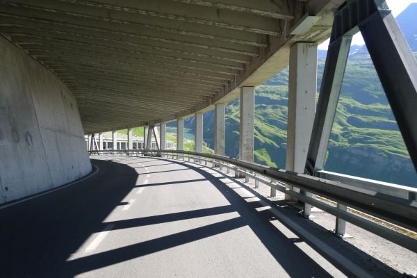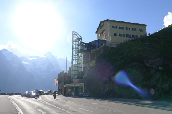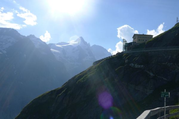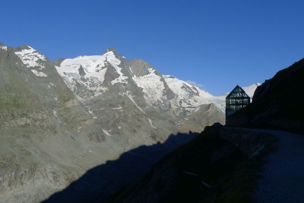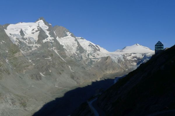 16:40 Uhr: der Kreisverkehr vor Heiligenblut ist erreicht, 650 der mühsam erstrampelten Höhenmeter sind wir bergab gefahren. Wieder unterhalb der Baumgrenze auf 1859m beginnt nun der letzte Anstieg des Tages zur Kaiser Franz Josef Höhe. 8,5km und 510 Höhenmeter sind noch einmal zu stemmen. Nach einer Kurve öffnet sich der Blick auf den 3798m hohen Großglockner und den Pasterzengletscher zu seinen Füßen. Was für ein Anblick ! das setzt noch einmal letzte Reserven frei und die brauchen wir auch. Nach einem vergleichsweise flachen Stück vor dem Glocknerhaus wird es nochmal steil. Nach 3 Kehren ist der Naßfeldspeicher Stausee erreicht und dann geht es in die lange Galerie. 11% Steigung zum Abschluss. Am Ende des Tunnels taucht nach einer Kurve das Kaiser Franz Josef Haus, unsere Herberge für die Nacht, auf. Nun haben wir das Plateau erreicht und radeln gemütlich bis zur Gletscherbahn am Ende der Straße.