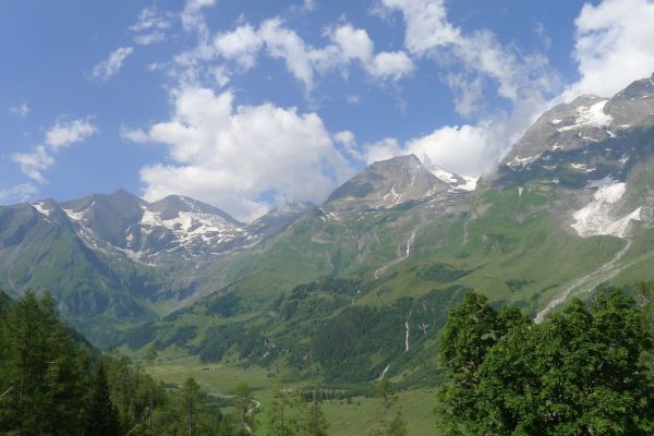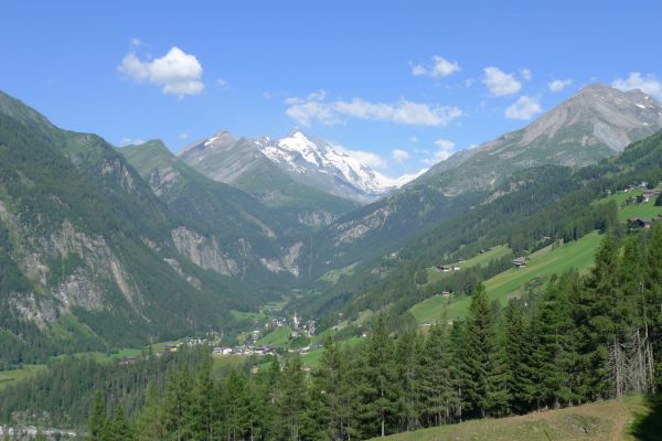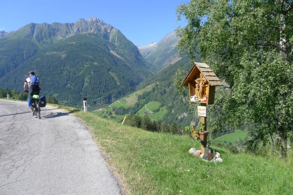 9:20 Uhr: Start zur 4. Etappe. Nach einem Foto vorm Großglockner begeben wir uns auf eine 8,5km lange Abfahrt. Kurz vor Heiligenblut zweigen wir von der Bundesstraße auf eine kleine Seitenstraße ab und fahren auf einem Höhenweg mit tollem Ausblick ins Tal weiter bergab. Hier und da geht es auch mal wieder bergauf, aber dafür entgehen wir dem Verkehr auf der Großglocknerstraße.