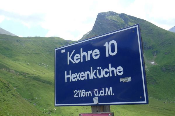 11:31 Uhr: Kehre 10, 2116m, wir sind mitten in der „Hexenküche“, überall liegen riesige Felsbrocken auf den grünen Bergmatten verstreut. Eingerahmt wird das ganze durch hochaufragende Felswände der zahlreichen Dreitausender.