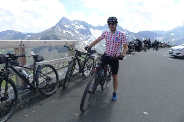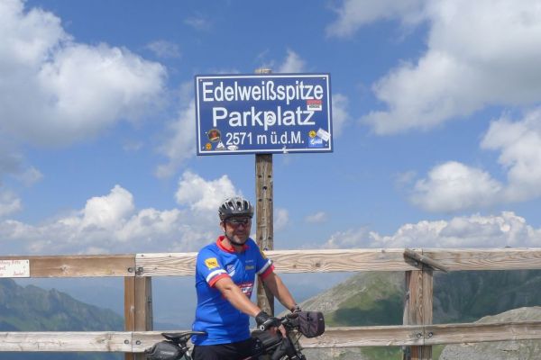 15:08 Uhr Klaus und Andi erreichen die Edelweißspitze. Nach einem Foto geht es auch gleich wieder auf die Abfahrt, noch liegen 24km und zwei weitere Anstiege vor uns. Am Fuscher Törl sammeln wir Armin ein, der dort Mittag gemacht hat.