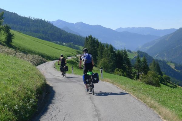 12:20 Uhr: Nach einem Stück entlang der Salzach ist der tiefste Punkt erreicht und der nächste Anstieg mit 500 Höhenmetern zum Pass Thurn steht vor uns. Da wir nicht die Bundesstraße von Mittersill mit gemütlichen 5% genommen haben, sondern eine Abkürzung, wird es wieder steil. Über einen Güterweg mit 9-11% geht es nach oben. Dafür ist der Weg so gut wie autofrei, und nachdem die Bundesstraße erreicht ist wird es auch wieder flacher.