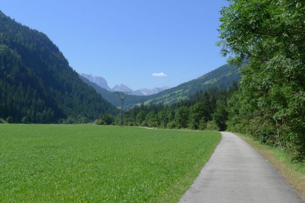 10:40 Uhr: Nach 28km ist die Talsohle erreicht. Wir rollen weiter auf einem Fahrradweg entlang der Möll und können in der Ferne schon die Lienzer Dolomiten erblicken.