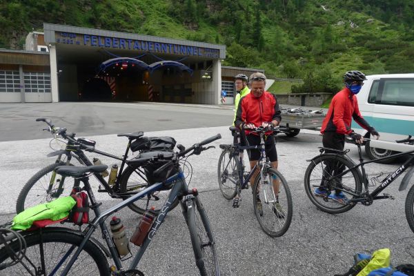10:36 Uhr: mit Armin erreicht der letzte der Gruppe den Tunnel. Wir machen das Bike-Shuttle klar und verstauen unsere Räder auf dem Anhänger. Die nächsten 5km werden wir durch den Tunnel chauffiert.