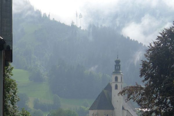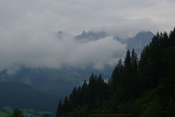 16:28 Uhr: der Regen hat aufgehört und die Wetter-App sagt ein regenfreies Zeitfenster von etwa 2 h voraus. Wir machen uns wieder auf den Weg. Über St Johann in Tirol und Ellmau umrunden wir das Kaisergebirge. Vom Wilden Kaiser ist leider nichts zu sehen, die Wolken hängen zu tief.