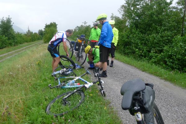 10:25 Uhr: wir fahren meist auf einer Schotterpiste direkt am Inn entlang. Der ist leider nicht grün, sondern genauso grau wie die Berge und der Himmel um uns herum. Thomas fährt in ne Scherbe und wir haben einen technischen Halt. Immerhin hört es während der Reparatur auf zu regnen.