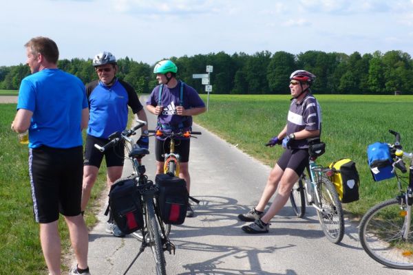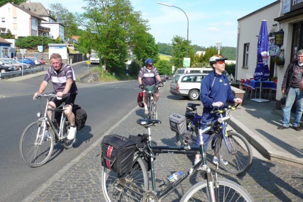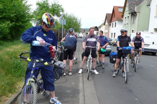 Gestartet wurde am Samstag um 11.00 Uhr am Bürgerhaus Vollnkirchen, von wo aus sich ein siebenköpfiges Team unter Leitung von Kapitän und Organisator Didi in Bewegung setzte. In Lützellinden wurde mit Helmut der Achte im Bunde aufgesammelt. Weiter ging über Giessen an der Wieseck entlang bis zu deren Quelle in Sassen. Kurz darauf war auch schon die Ohm erreicht. Unterwegs kam mehr und mehr die Sonne zum Vorschein, so dass sich die Truppe in Nieder-Ohmen eine Erfrischung in der örtlichen Eisdiele genehmigte. Wer nun glaubte den Rest der Fahrt gemütlich im Tal flußabwärts rollend bis Homberg hinter sich zu bringen, sah sich eines Besseren belehrt. Nach Gemünden war ein ca 3 km langer, nicht enden wollender Anstieg zu bewältigen. Die Mühen wurden jedoch mit einer grossartigen Aussicht auf die Höhen des Vogelsberges belohnt. Nach 67 km war das Etappenziel Homberg erreicht. Doch bevor die Radfahrer das ersehnte Weizenbier zu sich nehmen konnten, galt es noch einmal eine ca 1km lange Steigung zum Hotel zu bewältigen.