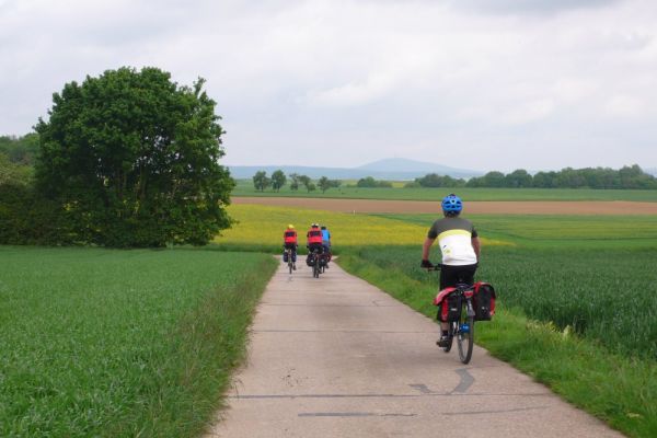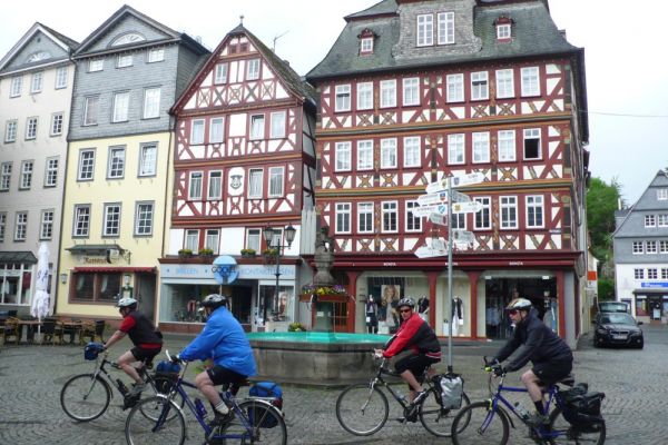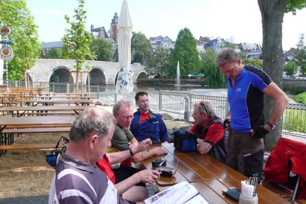 Am nächsten Morgen stand kurz nach dem Start eine Bergwertung auf dem Programm. Über 150 Höhenmeter mussten bis zum Salzbödepass überwunden werden. Danach ging es in rasanter Schussfahrt durch das Siegbachtal und das Aartal nach Herborn. In der Altstadt von Herborn kam dann auch eine Kaffeepause wie gelegen, um das Ende des Dauernieselregelns abzuwarten, der uns schon fast den ganzen Morgen begleitete. Weiter ging es durch das Dilltal und punktlich zur Mittagsrast im Biergarten an der Lahn in Wetzlar schien auch wieder die Sonne. Eine letzte Bergwertung hinauf Richtung Stoppelberg musste noch überwunden werden, ehe wir nach insgesamt 125km am Sonntag Nachmittag wieder in Vollnkirchen angekommen sind