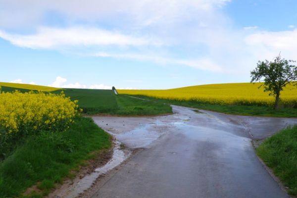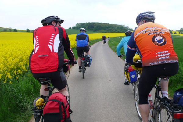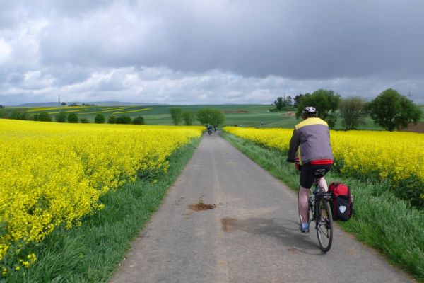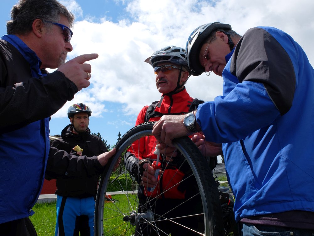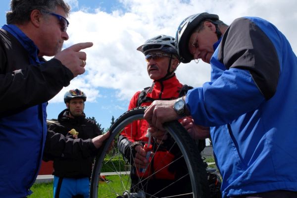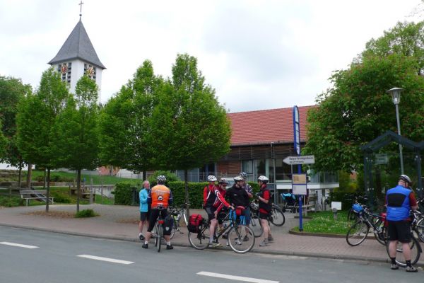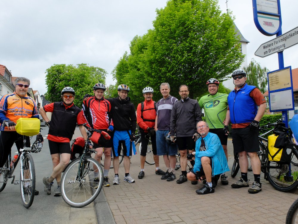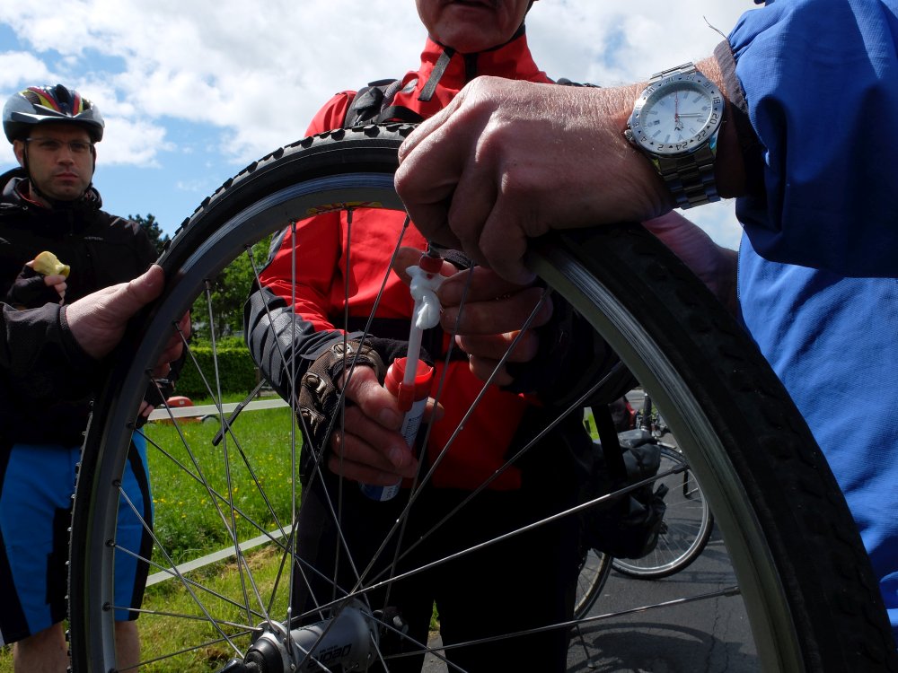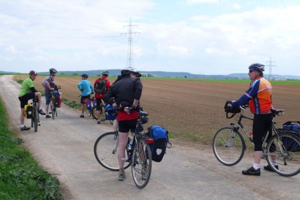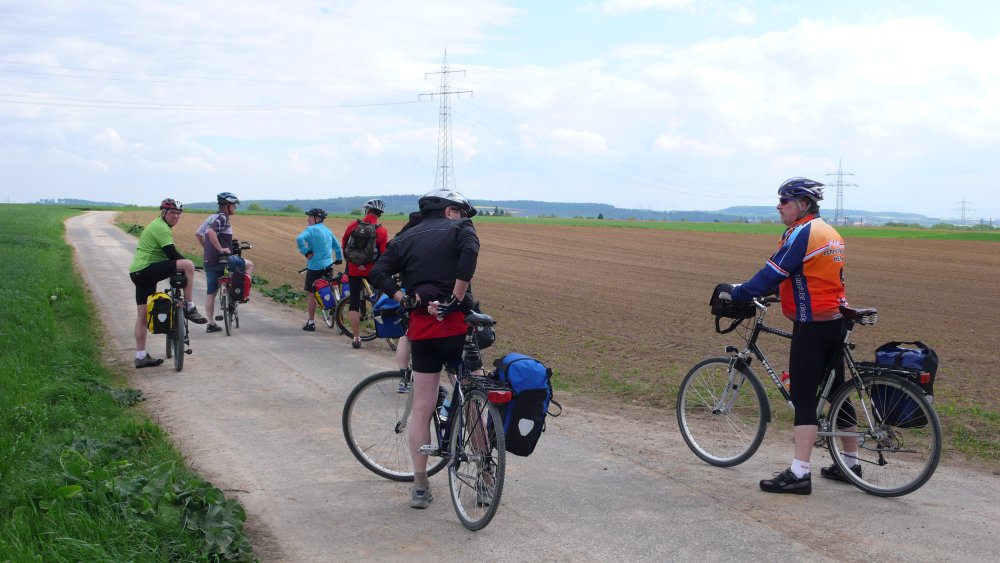 Der Blick aus dem Fenster am nächsten Morgen verhieß nichts Gutes. Grauer Himmel und Regen. Pünktlich zum Start hörte der Regen aber auf und so konnte bei nasskalten 10°C die zweite Etappe in Angriff genommen werden. Die Strecke führte diesmal links der A5 am Fusse des Taunus entlang über Sossenheim, Eschborn, Oberursel nach Bad Homburg, um dann auf die andere Seite der A5 Richtung Friedberg zu wechseln. Unterwegs wurde eine Reifenpanne mit "Bauschaum" geflickt und nach einem Zwischenstopp in Bad Nauheim, um die Kohlenhydratspeicher wieder aufzufüllen gings über Ober-Mörlen, Butzbach, Langgöns nach Hochelheim, wo auf dem Maimarkt der Abschluss stattfand.