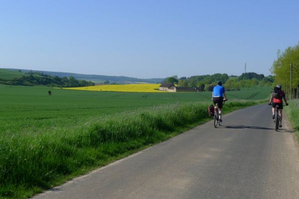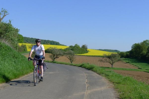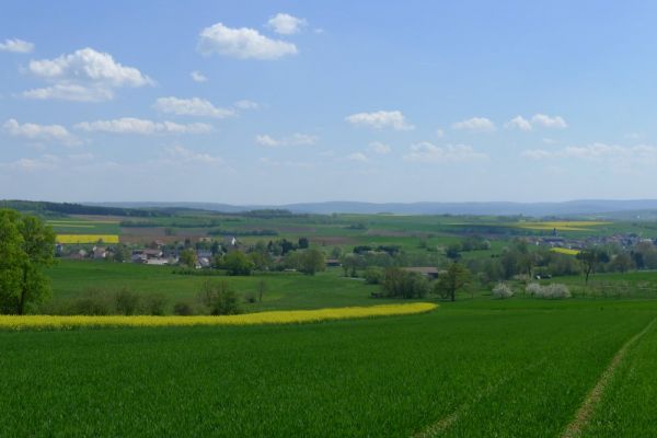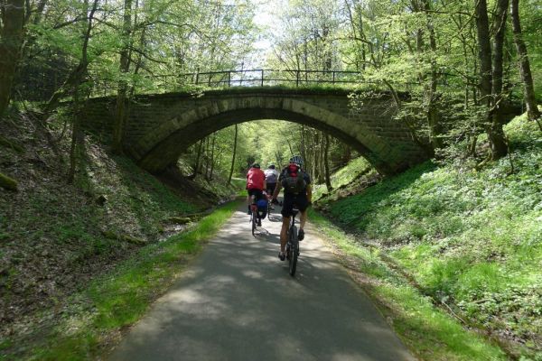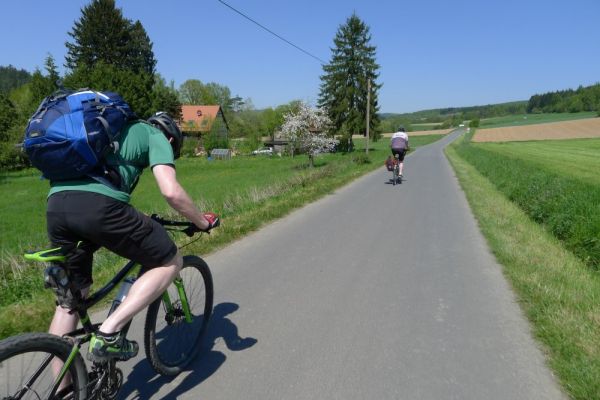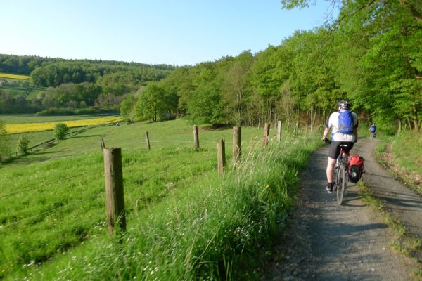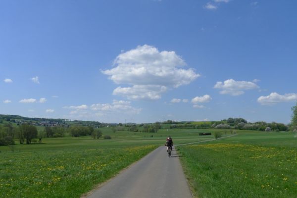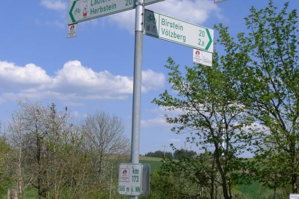 Dort beginnt der Südbahnradweg, der entlang der ehemaligen Bahntrasse hinauf in den Vogelsberg führt. Nach einer kurzem Einrollphase auf flachem Terrain wurde es hinter Brachttal deutlich steiler. Der erste steile Abschnitt führte uns über Birstein und Fischborn auf etwa 400 m Höhe. Zeit zum Verschnaufen und geniessen der schönen Landschaft blieb kaum. Auf der weiteren Strecke über Wettges, Sangmühle und Lichenroth gab es zwar immer mal wieder kleine Abfahrten, aber danach auch schon wieder den nächsten Berg, ehe nach Völzberg der Schlussanstieg zur Hartmannshainer Höhe folgte. Hier war mit 565m über NHN der höchste Punkt der Tour erreicht. Es folgte eine 14km lange Abfahrt auf dem Vulkanradweg nach Gedern.