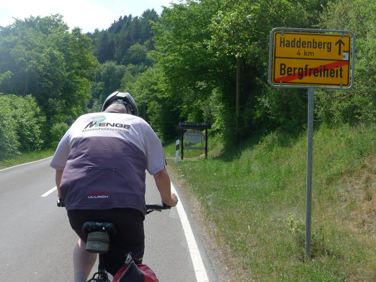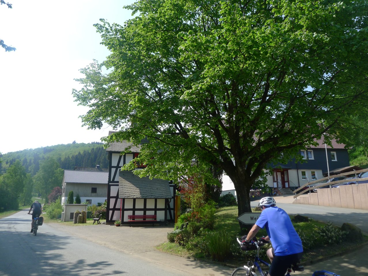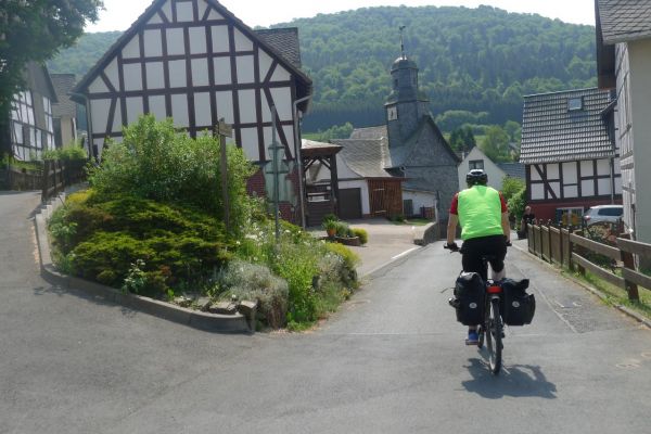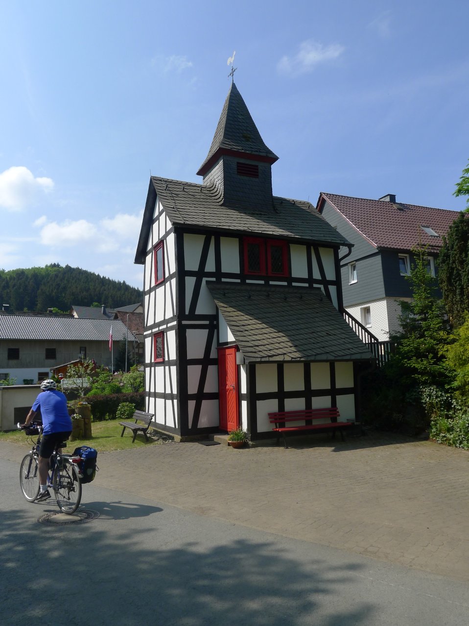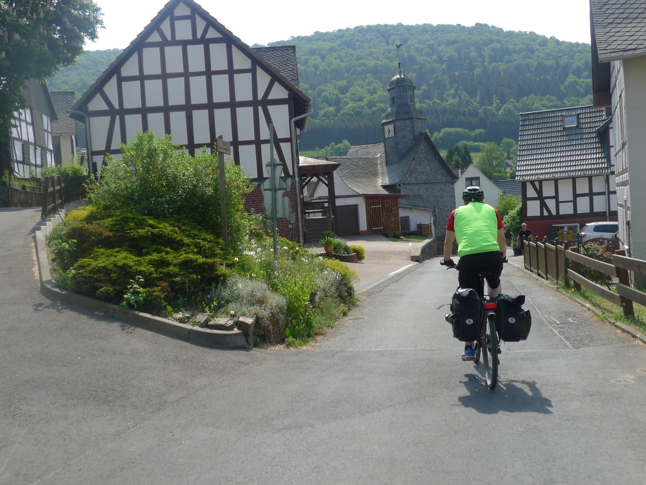 Pünktlich um 9:00 Uhr sassen wir wieder auf dem Rad. Die Wetterprognosen für den 2. Tag waren nicht so gut und wir wollten vor den für den Nachmittag angekündigten Gewittern das Zwischenziel Dillenburg erreichen. Entsprechend wurde von Beginn an auch ein hohes Tempo angeschlagen. Auf weitgehend flacher Strecke durch die Ederauen war das auch kein Problem. Höhepunkt war der Abschnitt von Battenberg nach Hatzfeld auf einer alten Bahnstrecke mit einem Tunnel bei Reddighausen. In Hatzfeld, etwa 30km nach dem Start, zweigte der Weg nach Süden ab. Nun ging es hinein ins Rothaargebirge. Die Sackpfeife haben wir zwar -im wahrsten Sinne des Wortes- links liegen gelassen, aber vor und hinter Lindenhof mussten 2 Anstiege bewältigt werden. In dem Ort steht Hessens kleinste Kirchel, auf rund 25 Quadratmeter bietet sie Platz für 46 Personen. Nach dem Ort war mit über 500m auf der höchste Punkt der Tagesetappe erreicht. Nach der Abfahrt nach Wallau folgte wieder ein langgezogener Anstieg nach Simmersbach. Hier blies uns zudem ein kräftiger Gegenwind entgegen. Es folgte eine 17km lange Abfahrt bis Dillenburg, welches wir vor dem Gewitter erreichten. Erst als wir bei Kaffee und Kuchen sassen prasselte es los. Der Regen war aber nur von kurzer Dauer. Nach einem Stück mit dem Zug bis Wetzlar ging es dann auf die letzten Kilometer nach Vollnkirchen, das wir nach 87 km und 840 Höhenmetern, ebenfalls trocken, erreichten.