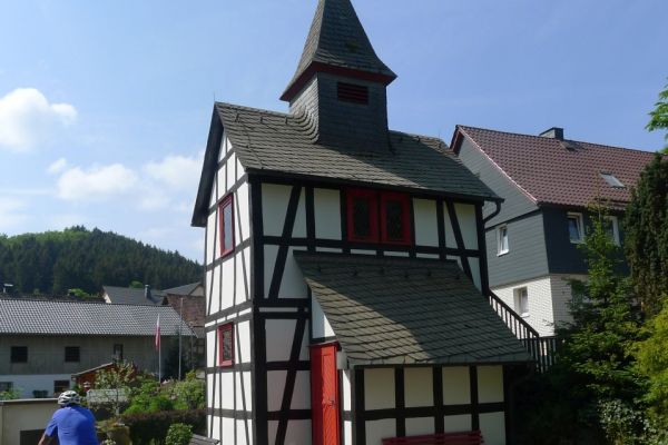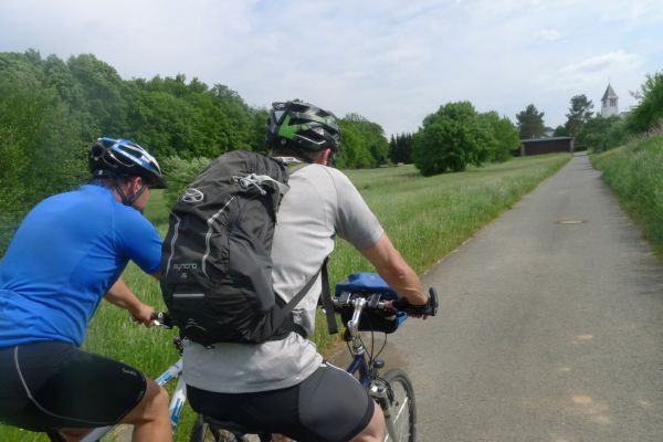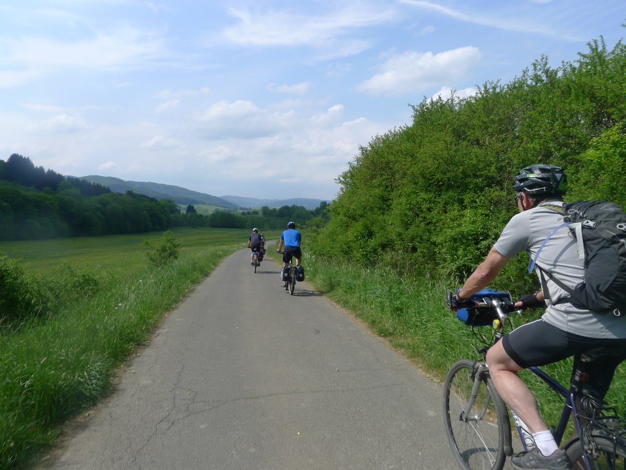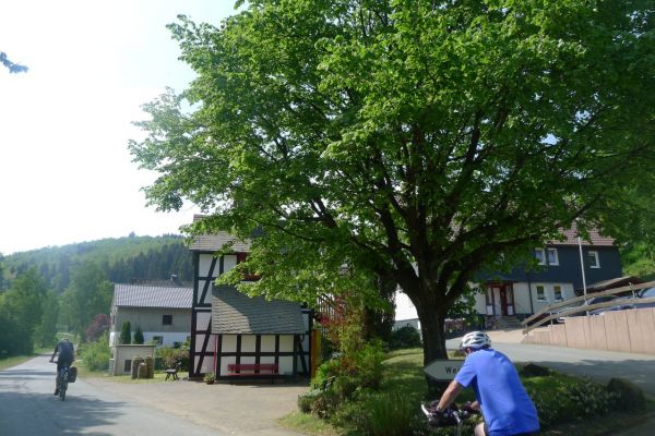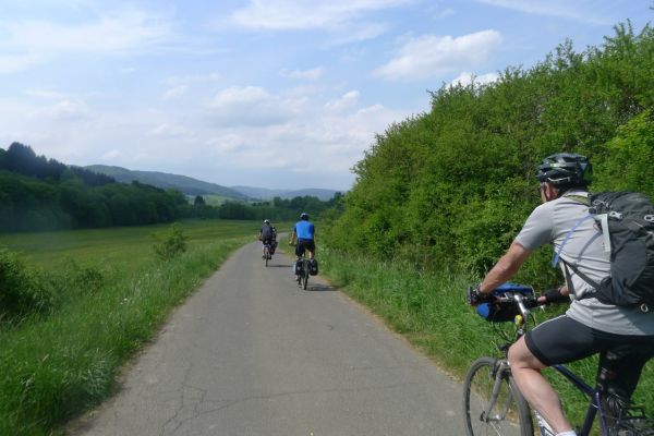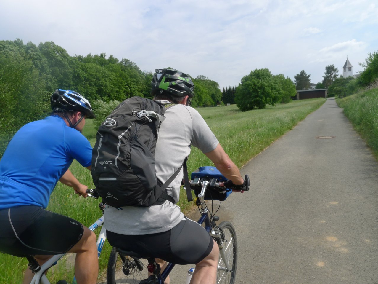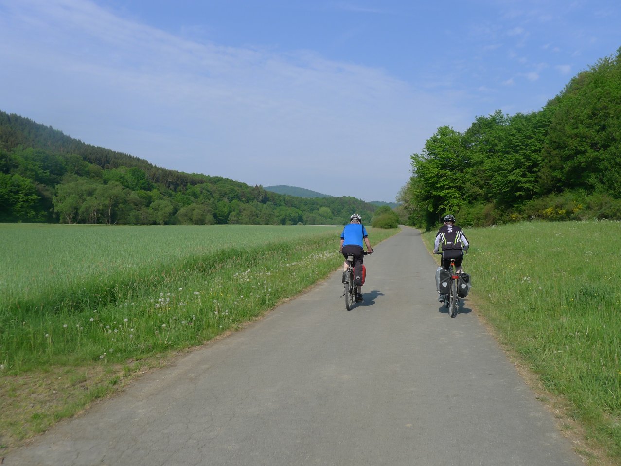 Pünktlich um 9:00 Uhr sassen wir wieder auf dem Rad. Die Wetterprognosen für den 2. Tag waren nicht so gut und wir wollten vor den für den Nachmittag angekündigten Gewittern das Zwischenziel Dillenburg erreichen. Entsprechend wurde von Beginn an auch ein hohes Tempo angeschlagen. Auf weitgehend flacher Strecke durch die Ederauen war das auch kein Problem. Höhepunkt war der Abschnitt von Battenberg nach Hatzfeld auf einer alten Bahnstrecke mit einem Tunnel bei Reddighausen. In Hatzfeld, etwa 30km nach dem Start, zweigte der Weg nach Süden ab. Nun ging es hinein ins Rothaargebirge. Die Sackpfeife haben wir zwar -im wahrsten Sinne des Wortes- links liegen gelassen, aber vor und hinter Lindenhof mussten 2 Anstiege bewältigt werden. In dem Ort steht Hessens kleinste Kirchel, auf rund 25 Quadratmeter bietet sie Platz für 46 Personen. Nach dem Ort war mit über 500m auf der höchste Punkt der Tagesetappe erreicht. Nach der Abfahrt nach Wallau folgte wieder ein langgezogener Anstieg nach Simmersbach. Hier blies uns zudem ein kräftiger Gegenwind entgegen. Es folgte eine 17km lange Abfahrt bis Dillenburg, welches wir vor dem Gewitter erreichten. Erst als wir bei Kaffee und Kuchen sassen prasselte es los. Der Regen war aber nur von kurzer Dauer. Nach einem Stück mit dem Zug bis Wetzlar ging es dann auf die letzten Kilometer nach Vollnkirchen, das wir nach 87 km und 840 Höhenmetern, ebenfalls trocken, erreichten.