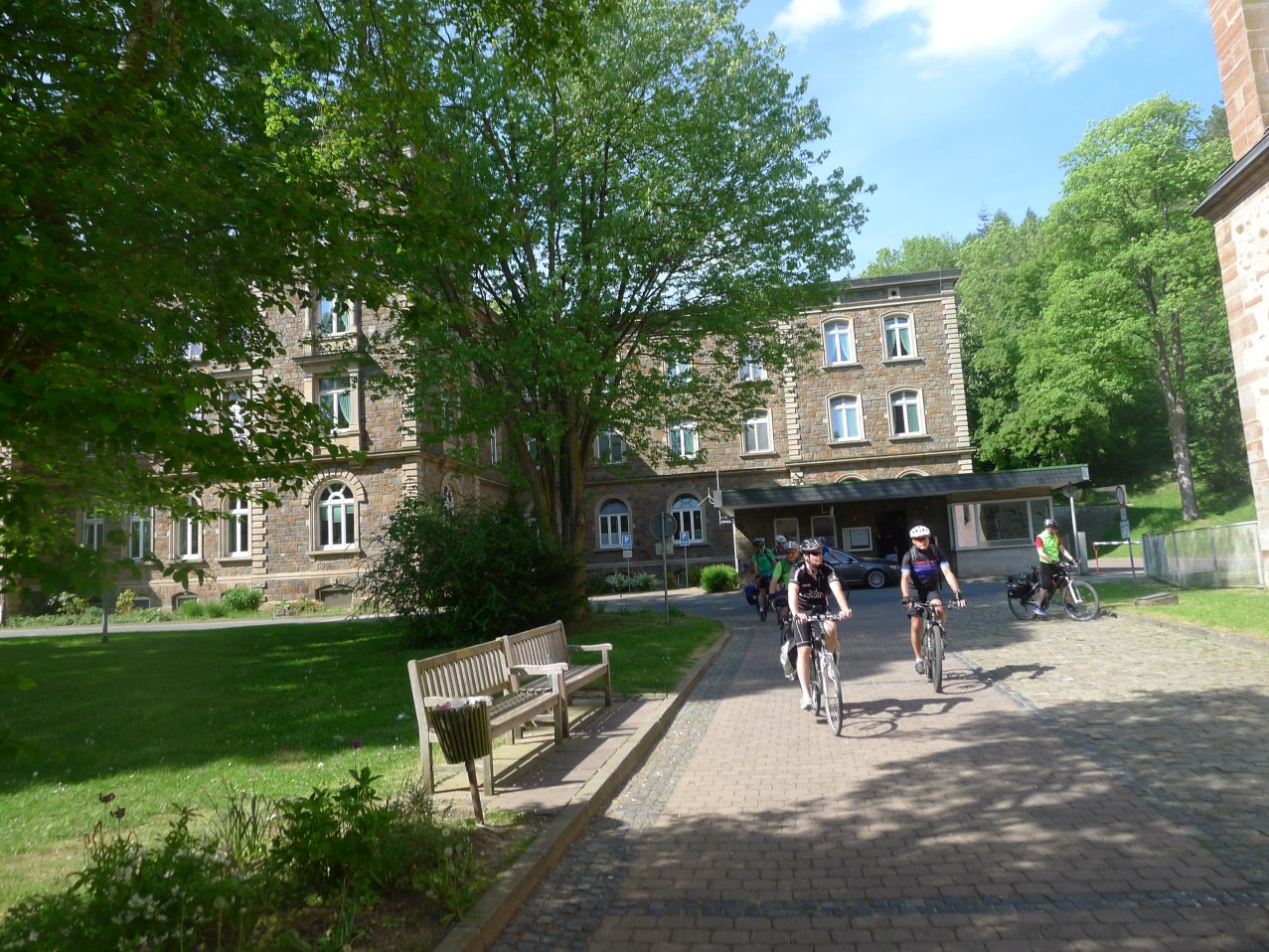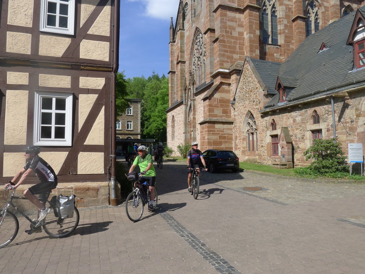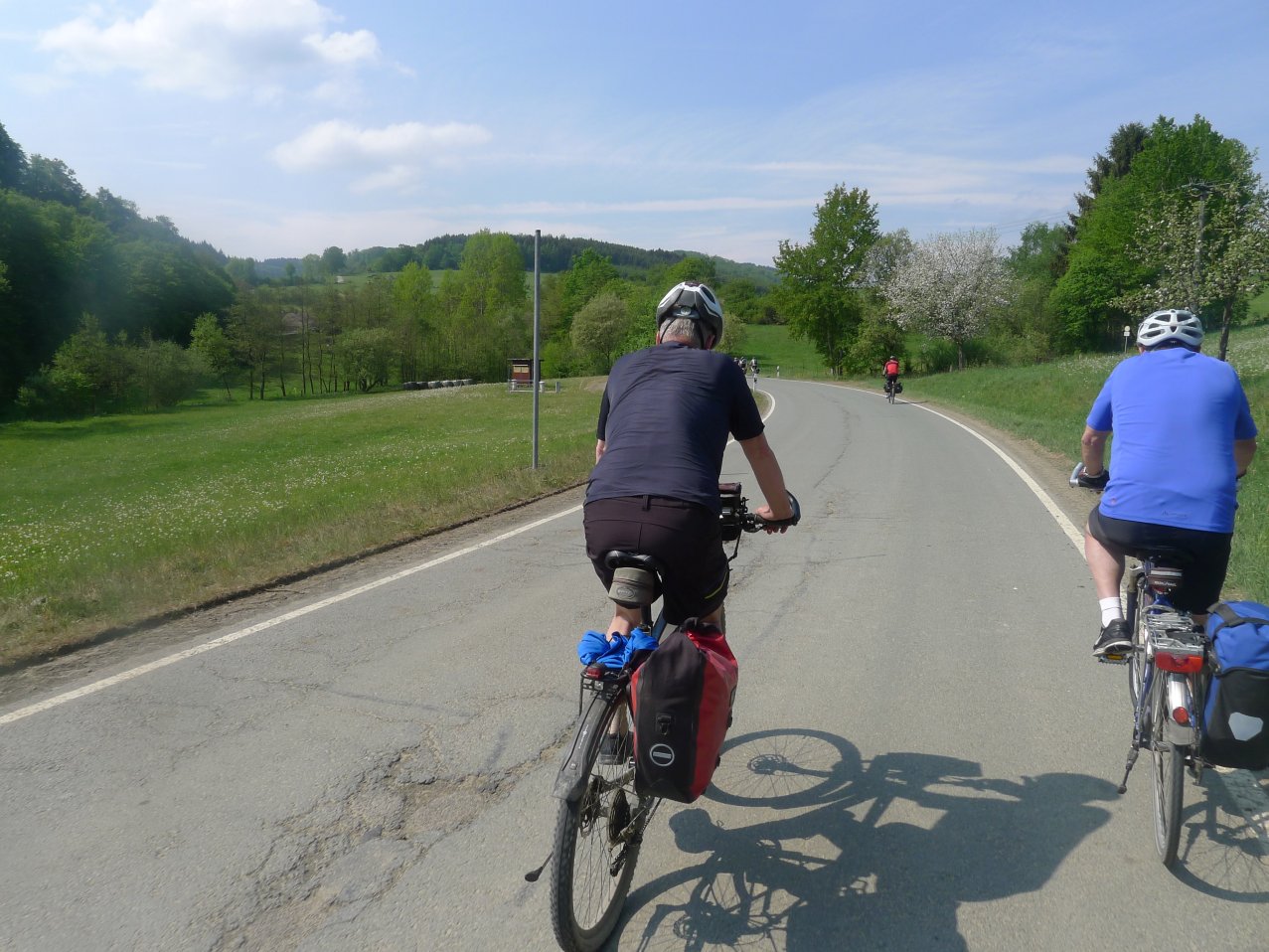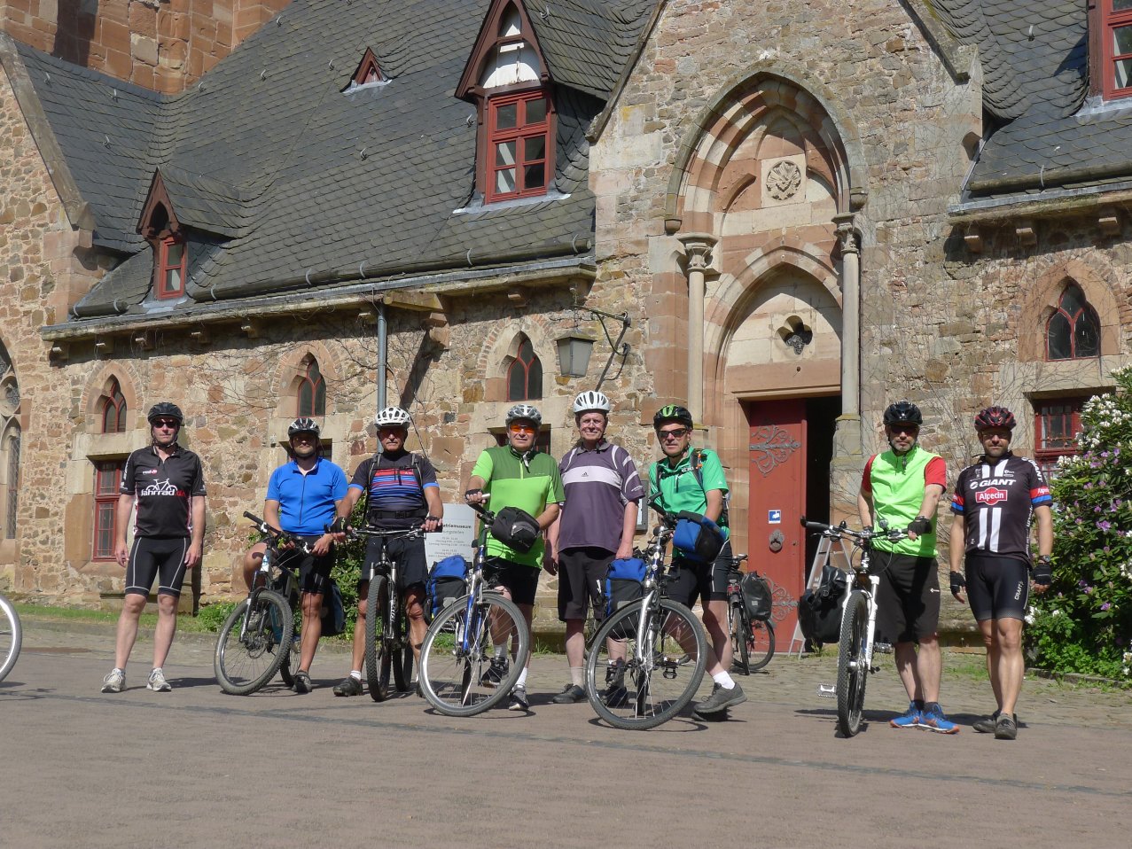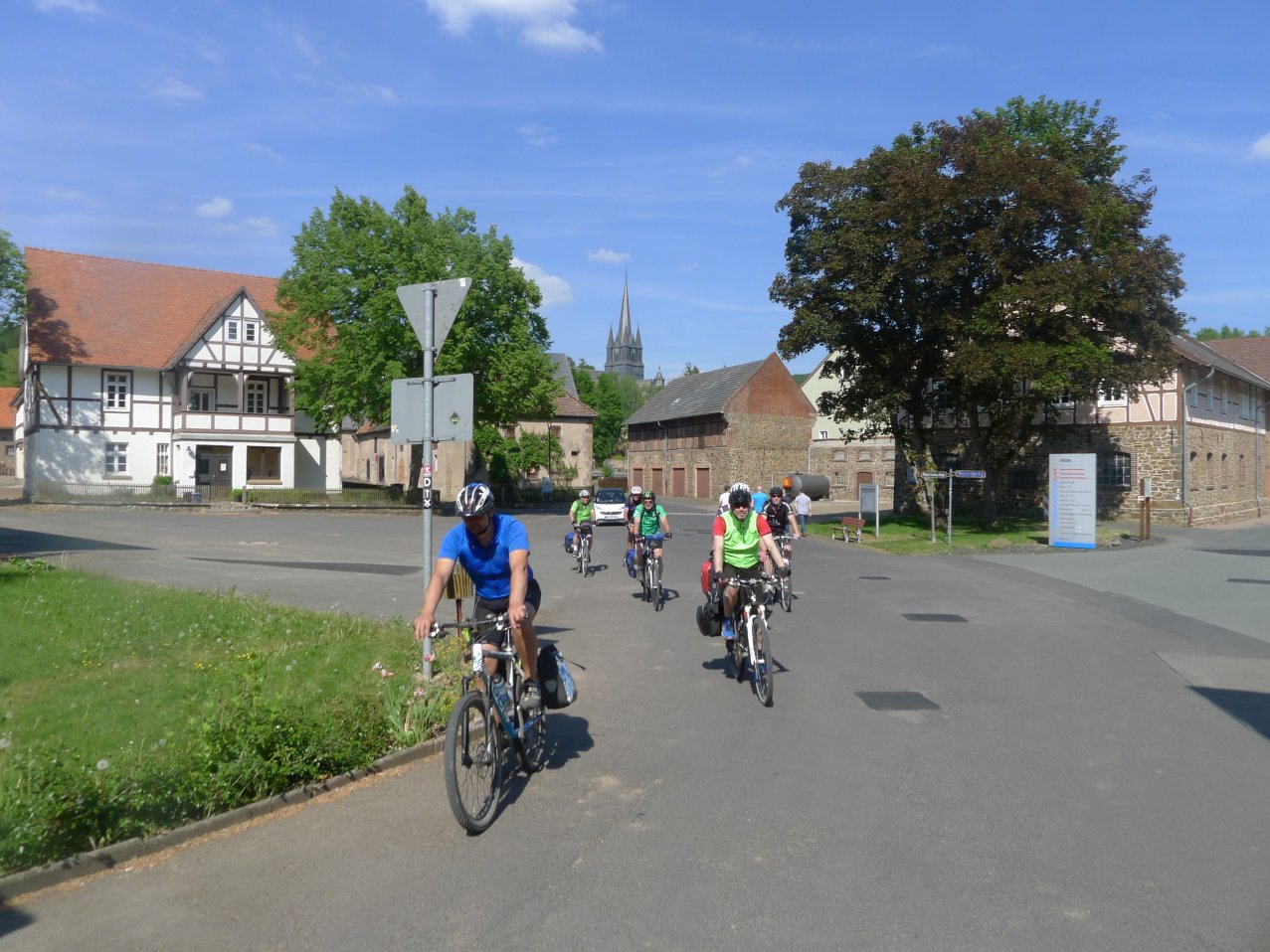 Die Saisoneröffnungstour 2018 am 12./13. Mai führte uns ins nördliche Hessenland. Bei Sonnenschein und bestem Radfahrwetter haben sich die Teilnehmer am Samstag Vormittag am Dorfplatz in Vollnkirchen versammelt. Nach einer Einrollphase an den Giessner Bahnhof folgte die Weiterfahrt mit dem Zug bis zum eigentlichen Startpunkt Borken. Von dort aus ging es zunächst auf dem Hessischen Fernradweg R5 ein Stück durch das Schwälmer Land und dann quer durch den Kellerwald. Hinter Bad Zwesten führte die Strecke durch das Urfftal leicht aber stetig bergauf. Nach einer Rast im Schneewittchendorf Bergfreiheit stand für uns auch gleich eine Bergwertung der ersten Kategorie auf dem Programm, bis zu 16% Steigung auf einem geschotterten Waldweg....... Zum Glück war es nur ein kurzer Stich. Die nächste Steigung liess nicht lange auf sich warten, war mit 4-6% aber deutlich moderater und auf Asphalt wesentlich angenehmer zu fahren. Hinter Armsfeld hatten wir den höchsten Punkt der ersten Etappe erreicht. Es folgte eine lange Abfahrt hinunter zum Zisterzienser Kloster Haina. Der letzte grosse Anstieg führt nach Dörnholzhausen. Von hier bot sich ein Traumhafter Blick ins Eder Bergland und zurück auf die Kellerwaldgipfel. Nach 75 km und 730 Höhenmetern war das ZIel Frankenberg erreicht.