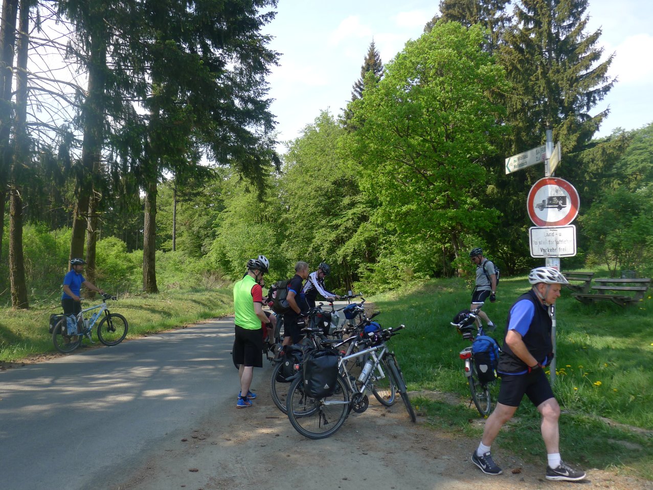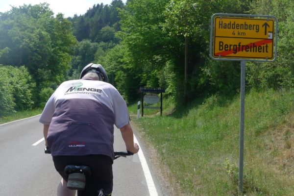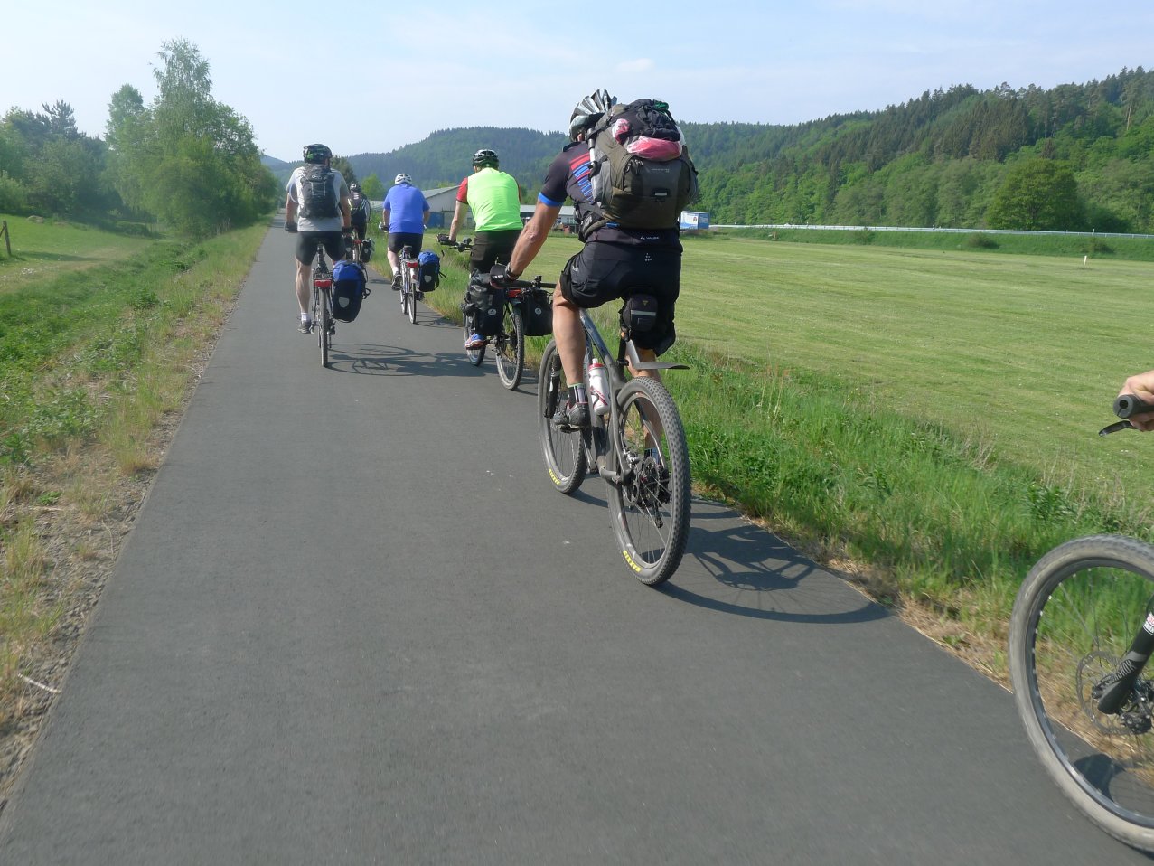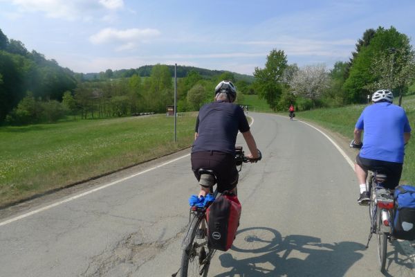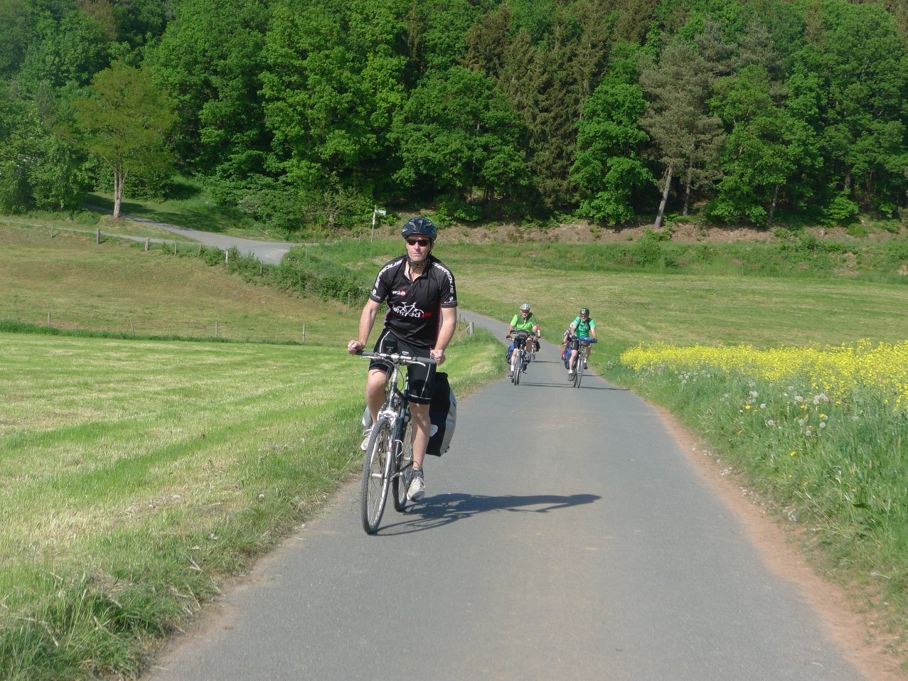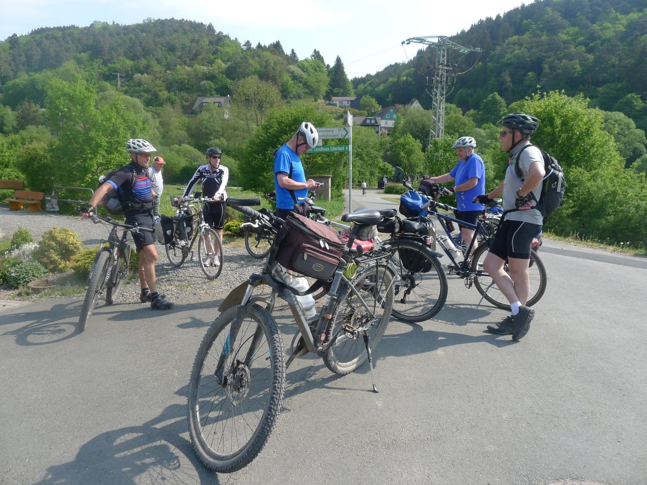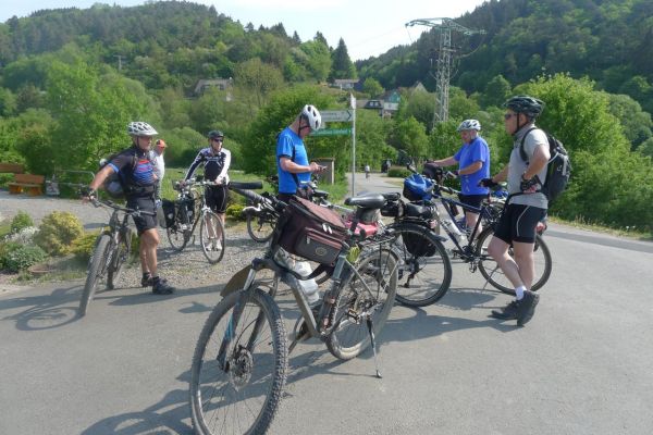 Die Saisoneröffnungstour 2018 am 12./13. Mai führte uns ins nördliche Hessenland. Bei Sonnenschein und bestem Radfahrwetter haben sich die Teilnehmer am Samstag Vormittag am Dorfplatz in Vollnkirchen versammelt. Nach einer Einrollphase an den Giessner Bahnhof folgte die Weiterfahrt mit dem Zug bis zum eigentlichen Startpunkt Borken. Von dort aus ging es zunächst auf dem Hessischen Fernradweg R5 ein Stück durch das Schwälmer Land und dann quer durch den Kellerwald. Hinter Bad Zwesten führte die Strecke durch das Urfftal leicht aber stetig bergauf. Nach einer Rast im Schneewittchendorf Bergfreiheit stand für uns auch gleich eine Bergwertung der ersten Kategorie auf dem Programm, bis zu 16% Steigung auf einem geschotterten Waldweg....... Zum Glück war es nur ein kurzer Stich. Die nächste Steigung liess nicht lange auf sich warten, war mit 4-6% aber deutlich moderater und auf Asphalt wesentlich angenehmer zu fahren. Hinter Armsfeld hatten wir den höchsten Punkt der ersten Etappe erreicht. Es folgte eine lange Abfahrt hinunter zum Zisterzienser Kloster Haina. Der letzte grosse Anstieg führt nach Dörnholzhausen. Von hier bot sich ein Traumhafter Blick ins Eder Bergland und zurück auf die Kellerwaldgipfel. Nach 75 km und 730 Höhenmetern war das ZIel Frankenberg erreicht.