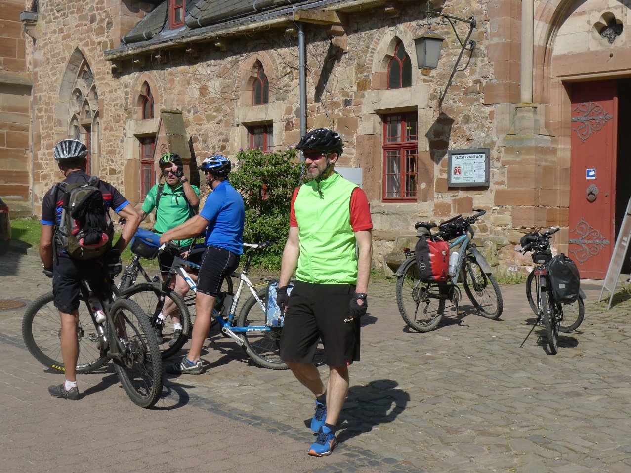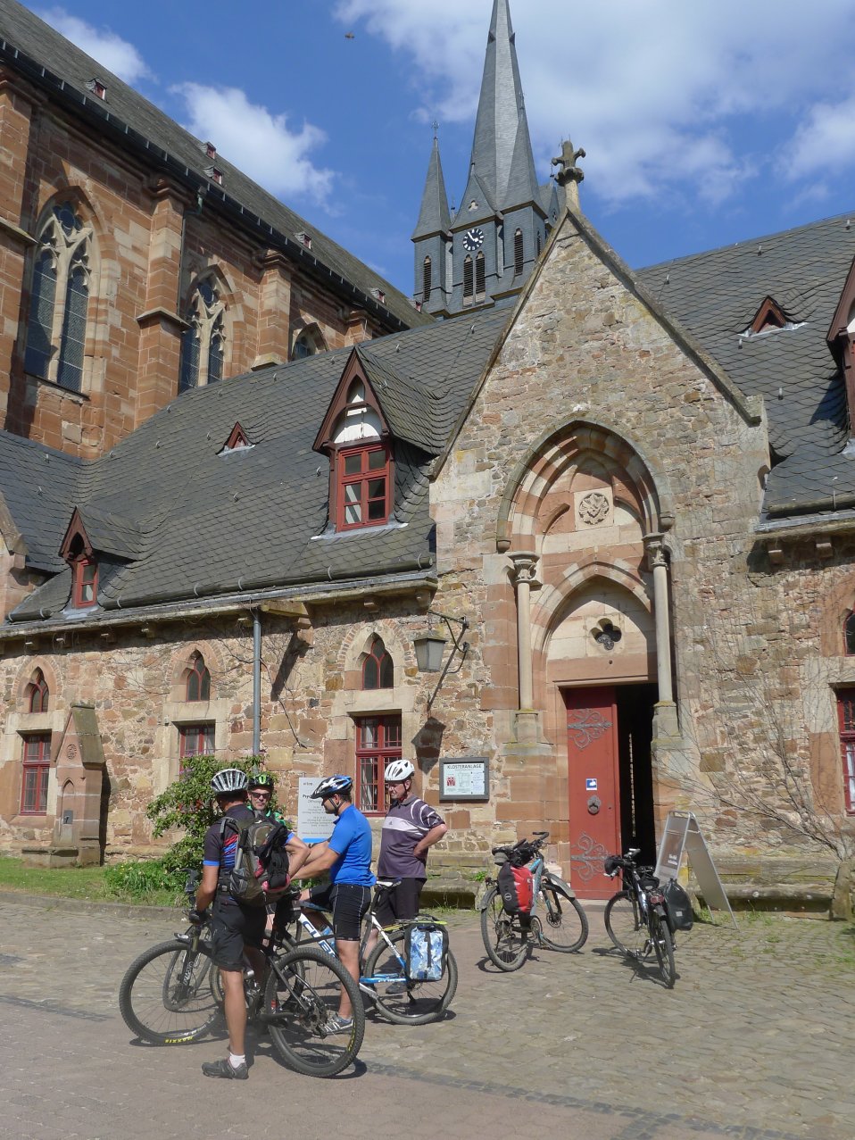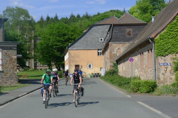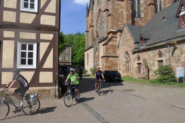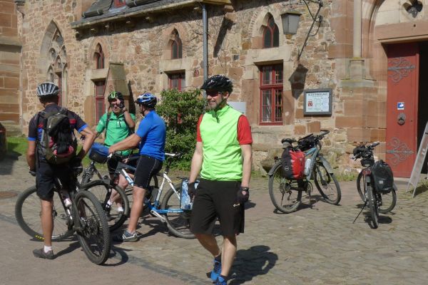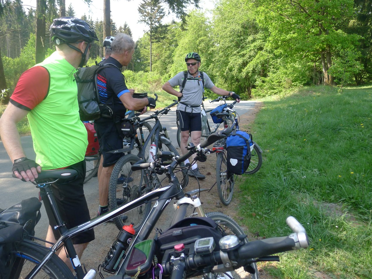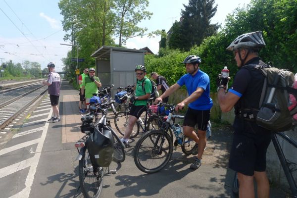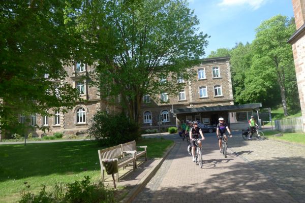 Die Saisoneröffnungstour 2018 am 12./13. Mai führte uns ins nördliche Hessenland. Bei Sonnenschein und bestem Radfahrwetter haben sich die Teilnehmer am Samstag Vormittag am Dorfplatz in Vollnkirchen versammelt. Nach einer Einrollphase an den Giessner Bahnhof folgte die Weiterfahrt mit dem Zug bis zum eigentlichen Startpunkt Borken. Von dort aus ging es zunächst auf dem Hessischen Fernradweg R5 ein Stück durch das Schwälmer Land und dann quer durch den Kellerwald. Hinter Bad Zwesten führte die Strecke durch das Urfftal leicht aber stetig bergauf. Nach einer Rast im Schneewittchendorf Bergfreiheit stand für uns auch gleich eine Bergwertung der ersten Kategorie auf dem Programm, bis zu 16% Steigung auf einem geschotterten Waldweg....... Zum Glück war es nur ein kurzer Stich. Die nächste Steigung liess nicht lange auf sich warten, war mit 4-6% aber deutlich moderater und auf Asphalt wesentlich angenehmer zu fahren. Hinter Armsfeld hatten wir den höchsten Punkt der ersten Etappe erreicht. Es folgte eine lange Abfahrt hinunter zum Zisterzienser Kloster Haina. Der letzte grosse Anstieg führt nach Dörnholzhausen. Von hier bot sich ein Traumhafter Blick ins Eder Bergland und zurück auf die Kellerwaldgipfel. Nach 75 km und 730 Höhenmetern war das ZIel Frankenberg erreicht.
