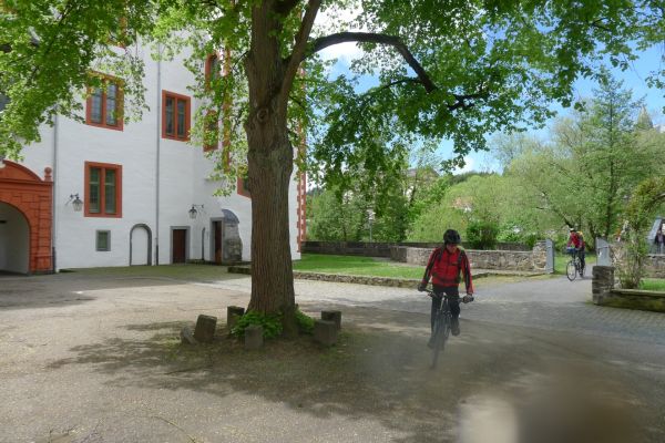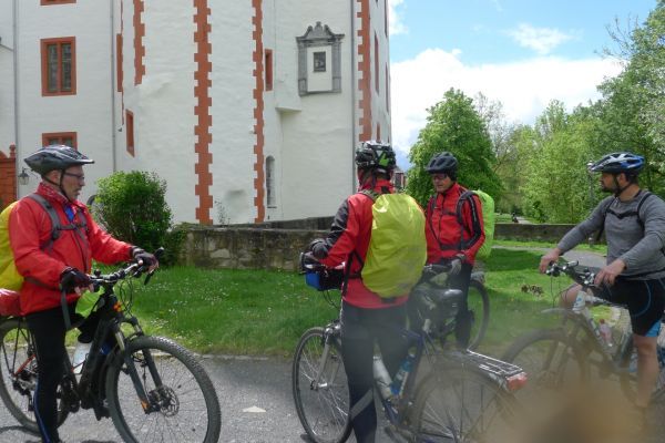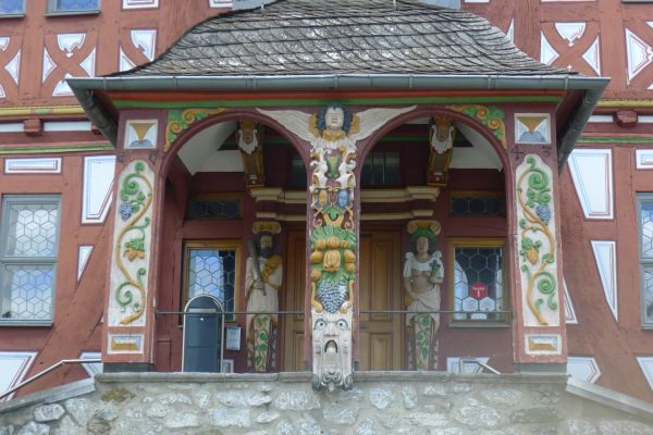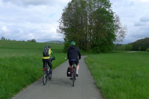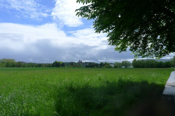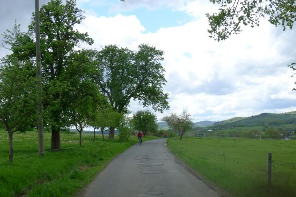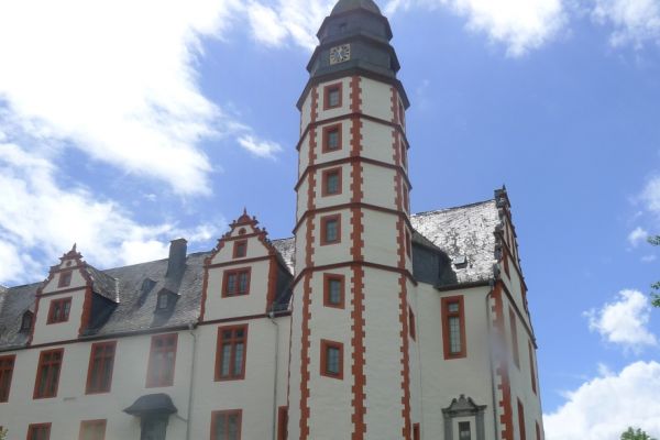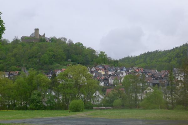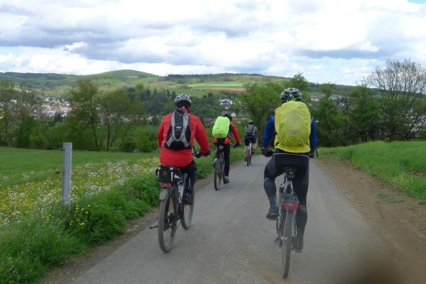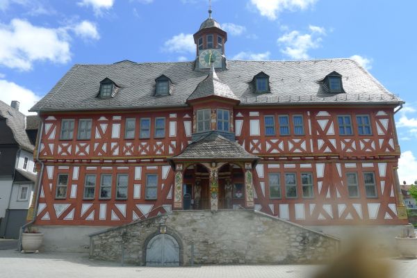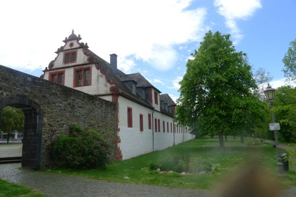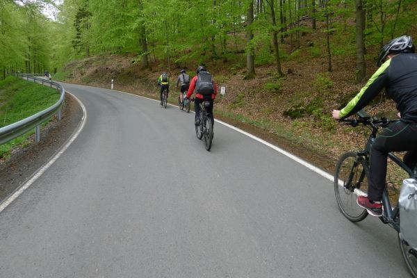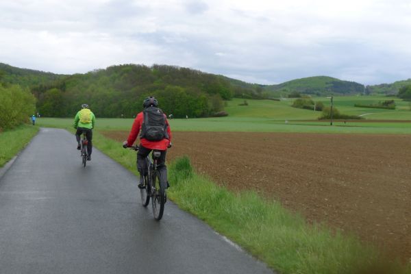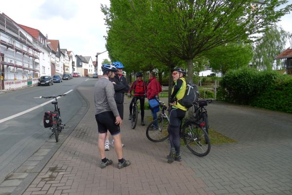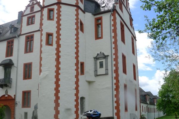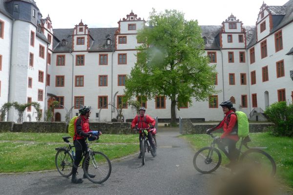 Die Tour am Sonntag verlief dagegen ganz anders. Auch für diesen Tag waren wieder Regenschauer vorausgesagt, doch als die niederprasselten saßen wir bereits im Zug von Gießen nach Limburg. In Limburg angekommen lockere Bewölkung und Sonnenschein, der den ganzen Tag über anhielt. Nach dem Start ging es noch kurz ein Stück an der Lahn entlang, ehe die Route nach Norden über Elz Richtung Hadamar abzweigte. Dort gab es das Renaissanceschloss und das mit Schnitzereien verzierte Fachwerkrathaus zu bestaunen. In Höhe von Dornburg fuhren wir in östlicher Richtung weiter und gelangten bei Löhnberg wieder an die Lahn. Davor legten wir noch eine kurze Mittagsrast auf dem Dorfplatz in Merenberg ein. Ein benachbartes Lokal belieferte uns mit Speis und Trank. Der Rest der Tour führte auf bekannten Wegen durch das Lahntal über Wetzlar zurück nach Vollnkirchen, das wir nach knapp 90km wieder erreichten.