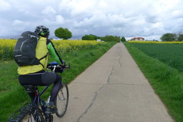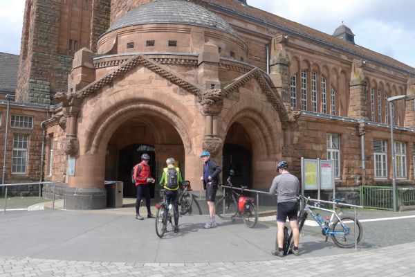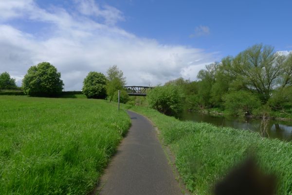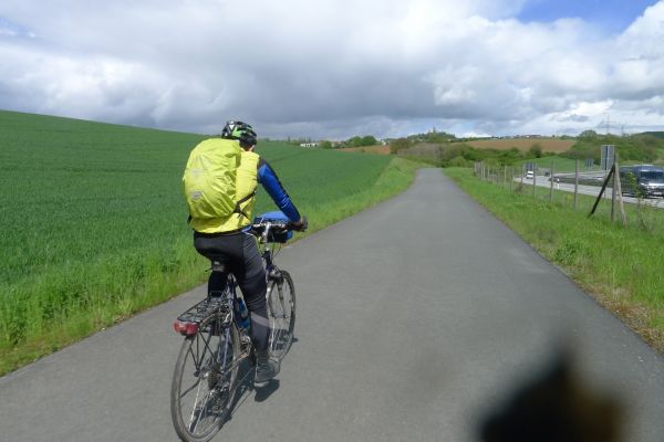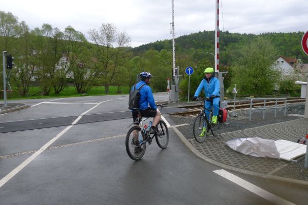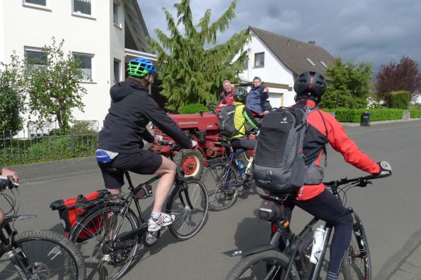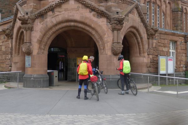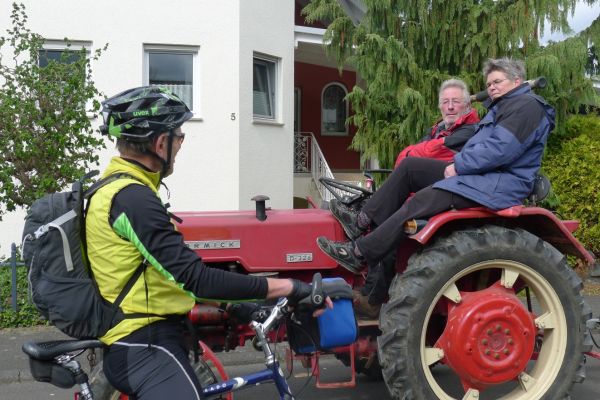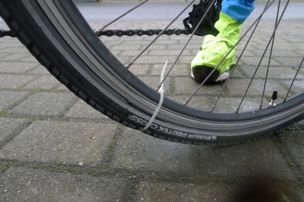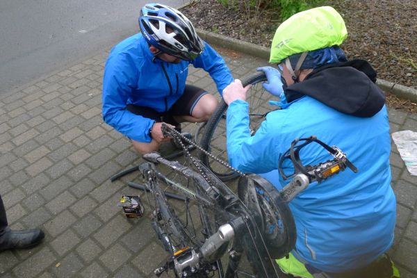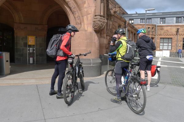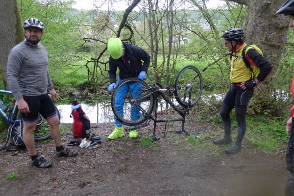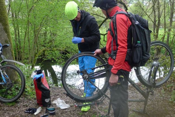 Frank, extra zur Tour von der südlichen Bergstrasse angereist, aber mit schlechtem Material, vermeldete einen Platten am Hinterrad. Nachdem der neue Schlauch eingebaut war ging es weiter. Keine 5km später wieder ein lauter Knall und Frank fuhr erneut auf der Felge. Als auch dieser Schaden behoben war und wir weiter wollten stellten wir fest, dass nicht der Schlauch, sondern der Mantel das Problem ist. Durch einen Riss in der Flanke drückte sich schon ne dicke Schlauchbeule heraus. Wie schon oft in solchen Fällen wurde improvisiert, wenngleich das Ergebnis dieses mal ein wenig ungewöhnlich war. Der Riss im Reifen wurde mit dem alten Schlauch und mangels Tape mit einem alten Felgenband abgedichtet. Zusätzlich hat Frank dann noch einem Kabelbinder um Felge und Lauffläche des Reifens geschlungen und die Konstruktion so fixiert. Etwas unorthodox und die Bremsen musste er aushängen, aber es funktionierte. Er gelangte damit bis zum nächsten Bahnhof in Buchenau wo ihn Bernie auf der Zugfahrt begleitete, während der Rest durchs Lahntal weiterradelte. In Marburg trafen wir die beiden dann im Zug wieder. Und da die Konstruktion so gut hielt fuhr Frank auch die letzten 20km von Giessen nach Vollnkirchen damit zurück. Nach über 90km kamen wir müde zu Hause an.