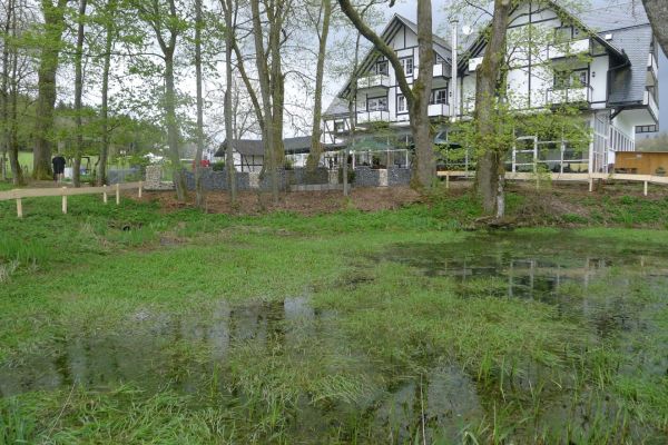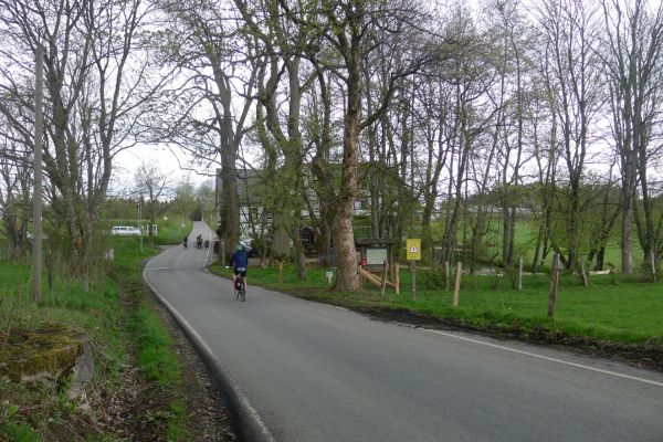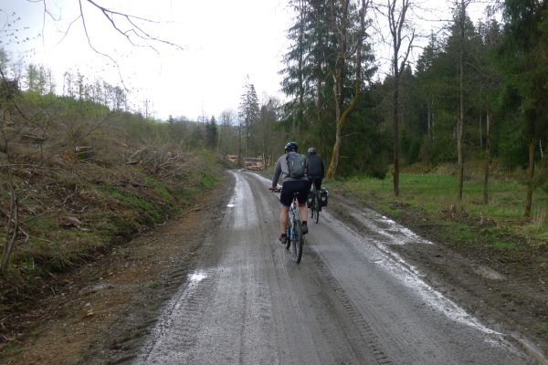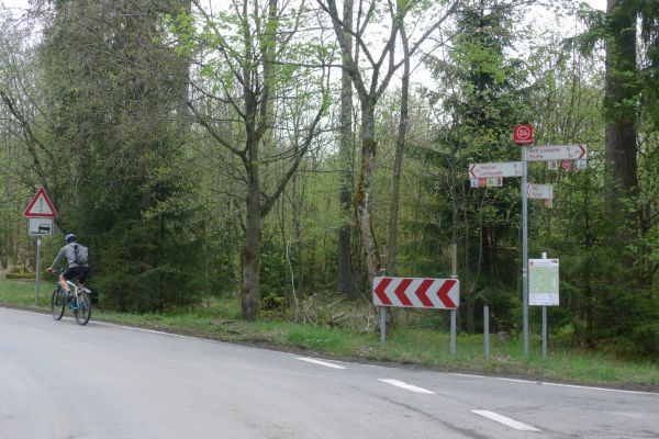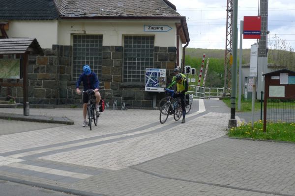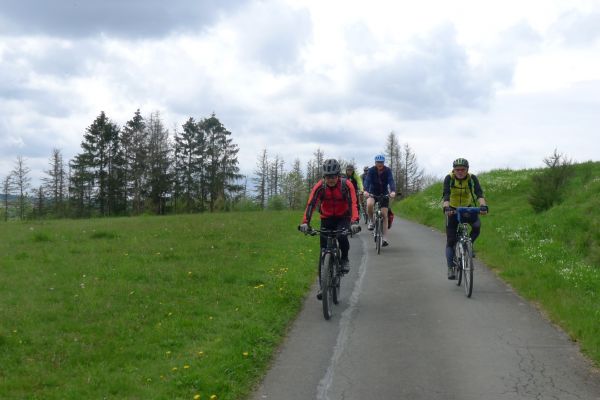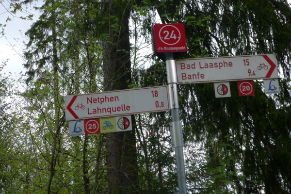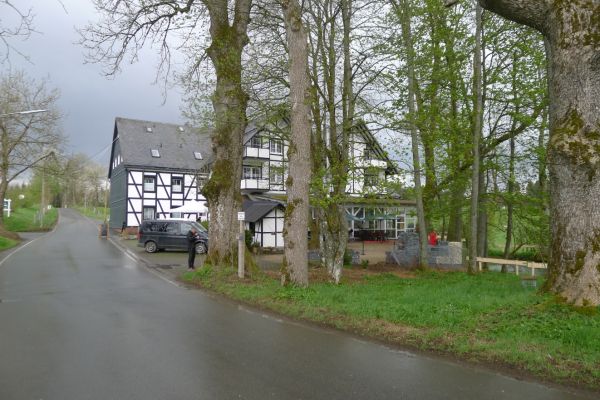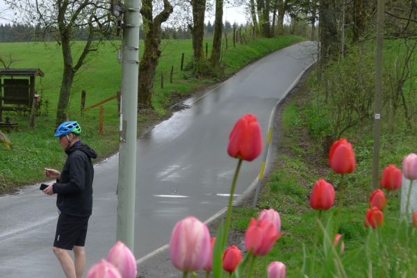 Die Tour am Samstag führte zunächst an den Gießener Bahnhof und von dort weiter mit dem Zug zum Startpunkt nach Rudersdorf im Siegerland. Kaum angekommen stand auch schon die erste Bergwertung an, hinauf zur Lahnquelle. Kurz vor Erreichen der Quelle fing es an zu regnen und wir schafften es gerade noch uns im benachbarten Forsthaus Lahnquelle unterzustellen. Da die Außengastronomie noch nicht geöffnet war, konnten wir die überdachten Plätze als Unterstand für uns und unsere Räder nutzen und wärmten uns bei einer Tasse Cappuccino to go.