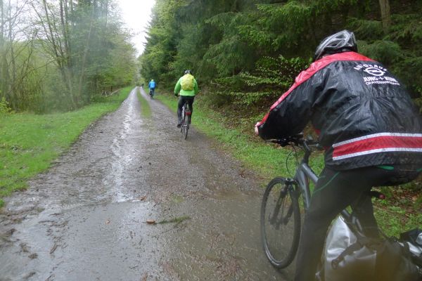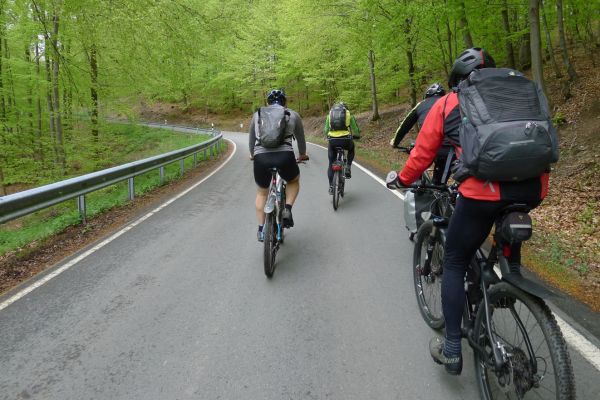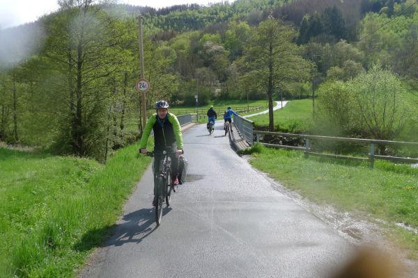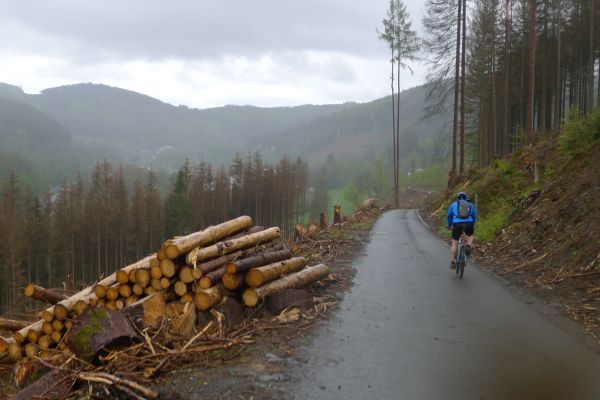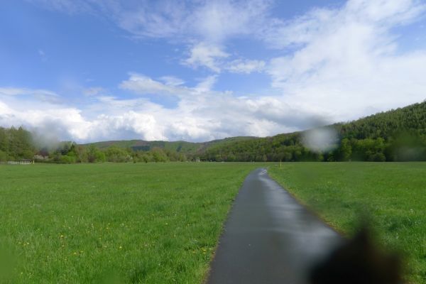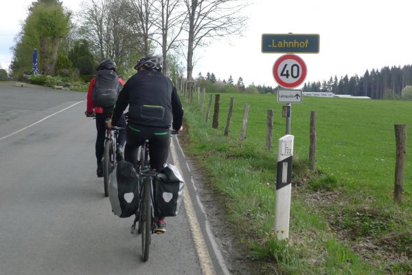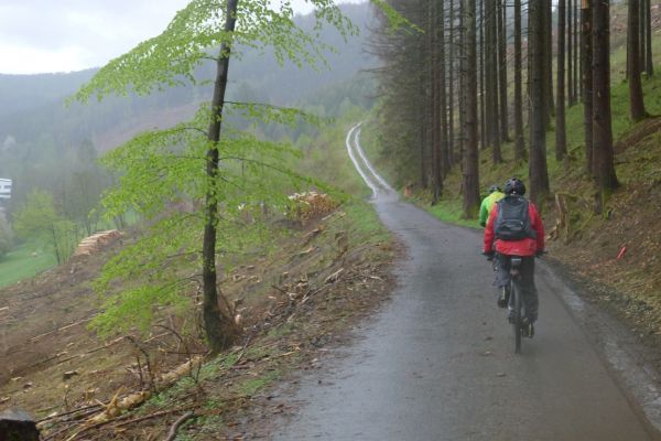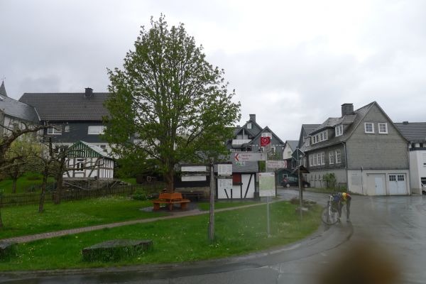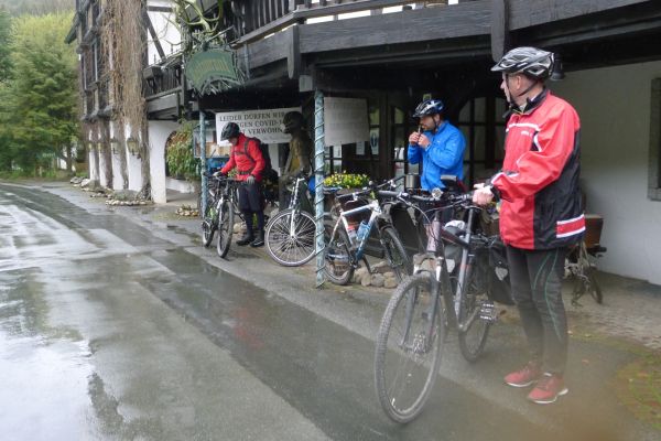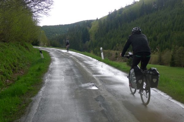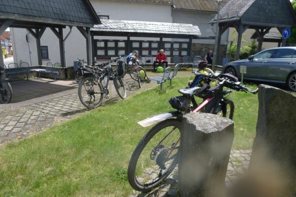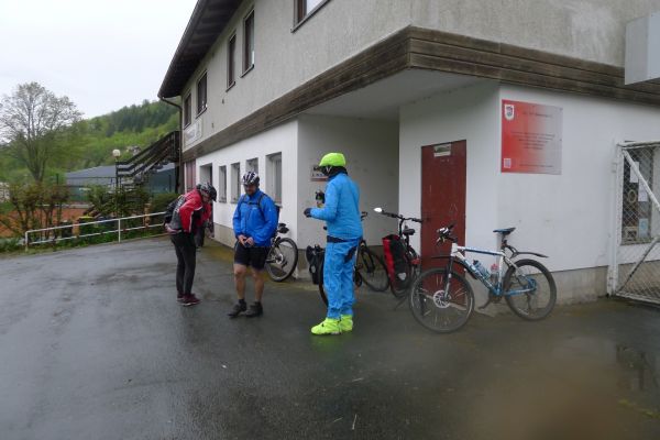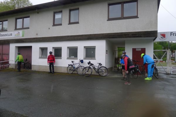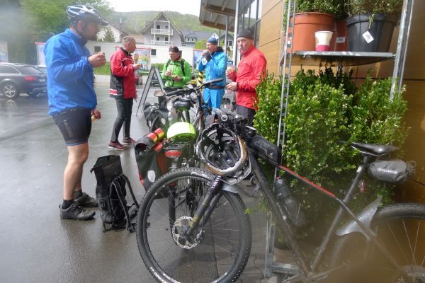 Nachdem der Schutt vorüber war ging es auf die Abfahrt, auf einer Schotterpiste durch Wald und ein schönes Tal mit dem dünnen Rinnsal der jungen Lahn neben uns hinab ins Tal. Wir schafften es gerade bis zum Hotel Jagdhof in Glashütte, wo wir uns vor dem nächsten Schauer unterstellten. Ein paar Kilometer weiter in Feudingen wurden dann wieder die Regensachen übergezogen…. In Bad Laasphe machten wir vor einem Supermarkt/Bäckerei Mittagsrast. Kaffee und Stückchen to go…. Immerhin war mittlerweile die Sonne rausgekommen und hat die nassen Trikots und Hosen wieder getrocknet. Hoffnung machte sich breit die Tour trocken zu Ende fahren zu können. Doch schon in Biedenkopf standen wir wieder unter, diesmal an einem Sportplatz. Die Einladung im benachbarten Sportlerheim Bundesliga zu schauen lehnten wir dankend ab. Über 30 Kilometer waren es noch fahren. Den Rest des Nachmittags blieb es dann auch weitgehend trocken, allerdings begann nun die Pannenserie…..