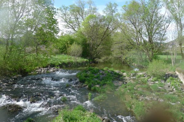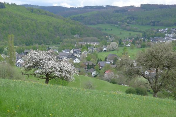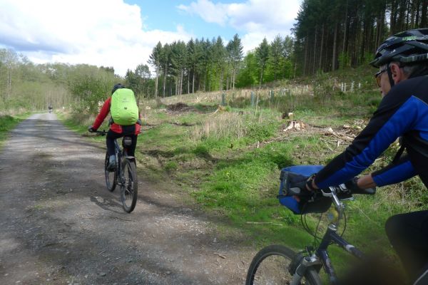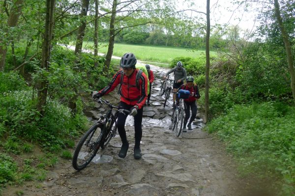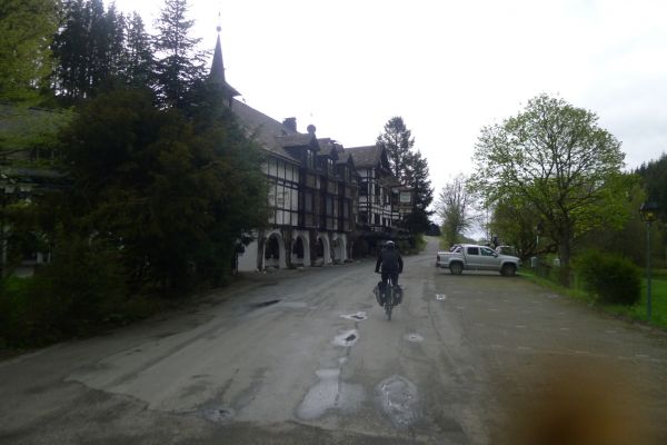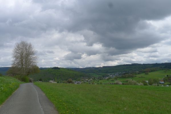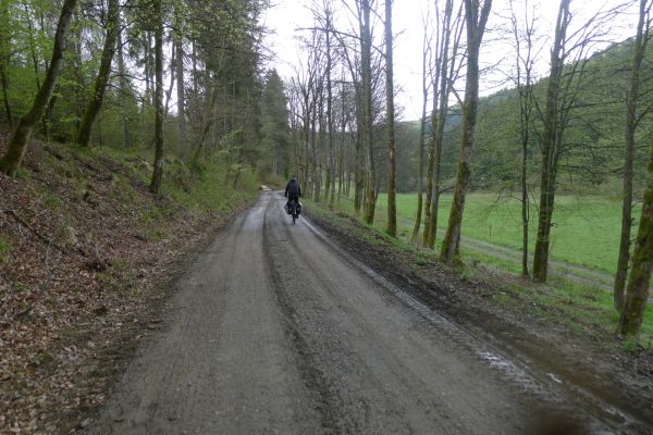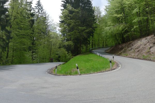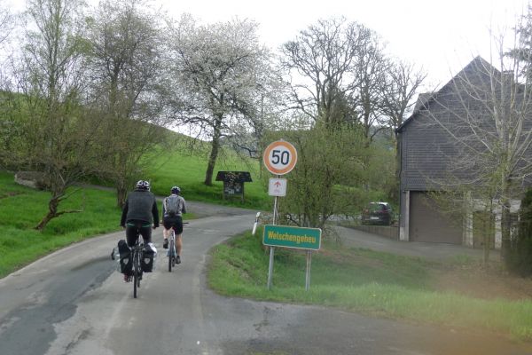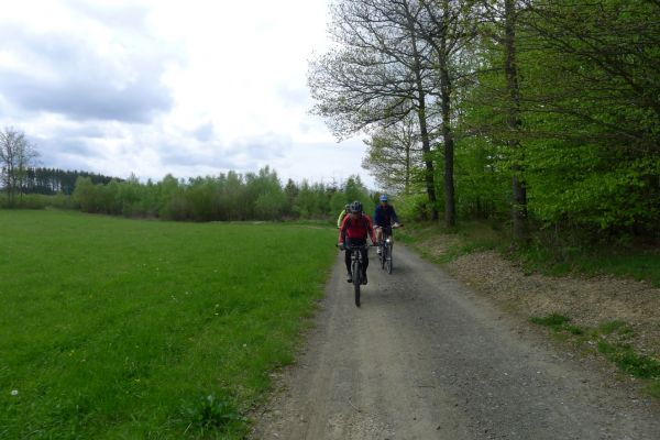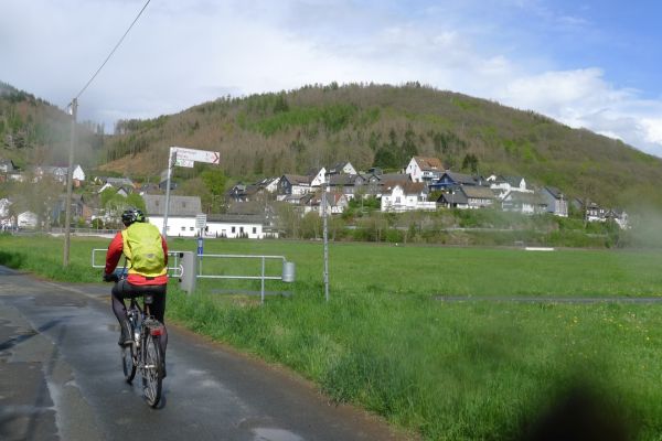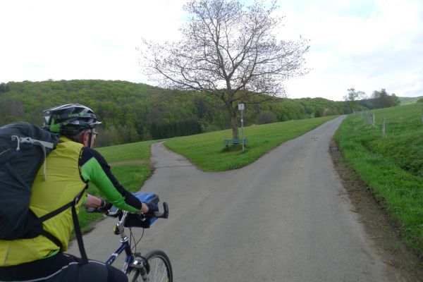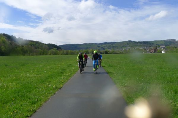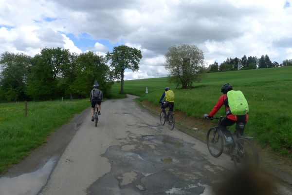 Nachdem der Schutt vorüber war ging es auf die Abfahrt, auf einer Schotterpiste durch Wald und ein schönes Tal mit dem dünnen Rinnsal der jungen Lahn neben uns hinab ins Tal. Wir schafften es gerade bis zum Hotel Jagdhof in Glashütte, wo wir uns vor dem nächsten Schauer unterstellten. Ein paar Kilometer weiter in Feudingen wurden dann wieder die Regensachen übergezogen…. In Bad Laasphe machten wir vor einem Supermarkt/Bäckerei Mittagsrast. Kaffee und Stückchen to go…. Immerhin war mittlerweile die Sonne rausgekommen und hat die nassen Trikots und Hosen wieder getrocknet. Hoffnung machte sich breit die Tour trocken zu Ende fahren zu können. Doch schon in Biedenkopf standen wir wieder unter, diesmal an einem Sportplatz. Die Einladung im benachbarten Sportlerheim Bundesliga zu schauen lehnten wir dankend ab. Über 30 Kilometer waren es noch fahren. Den Rest des Nachmittags blieb es dann auch weitgehend trocken, allerdings begann nun die Pannenserie…..