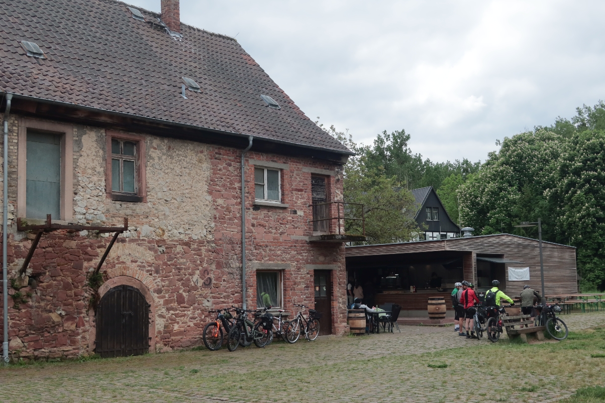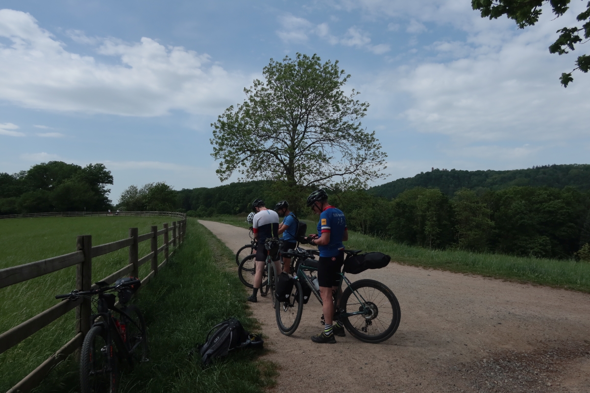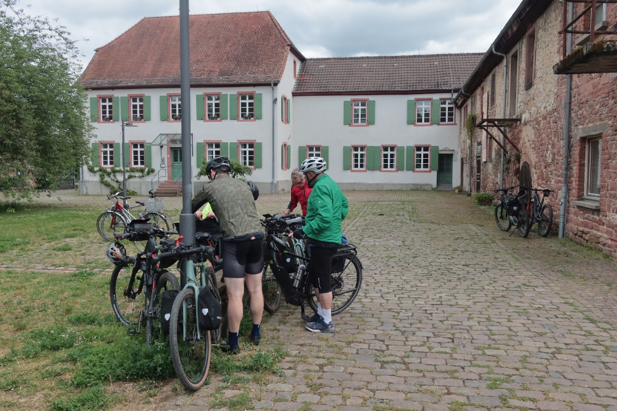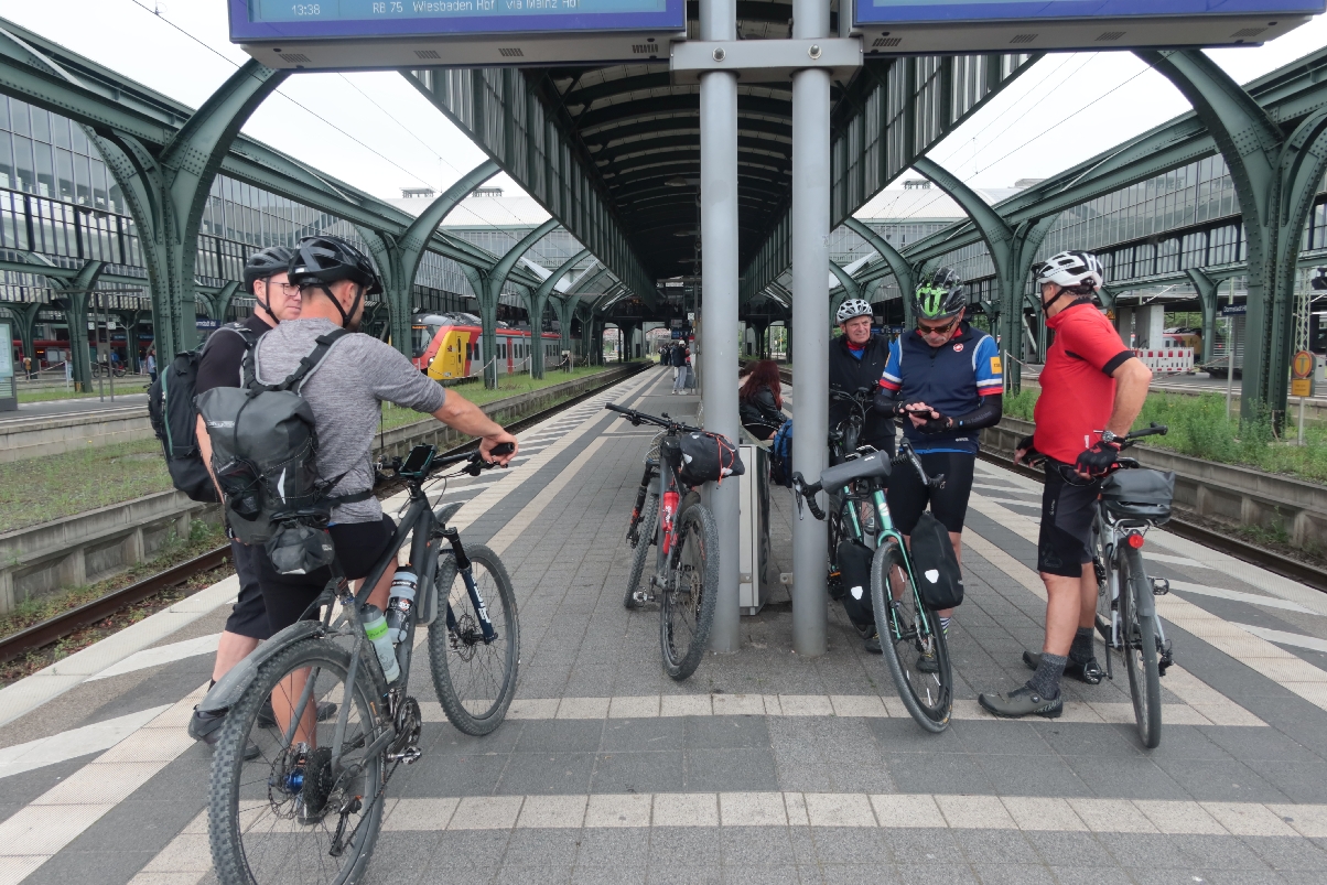 Das verlängerte 1.Mai Wochenende war in diesem Jahr der Termin für die Saisoneröffnungstour, die uns in den Süden Hessens an die Bergstraße und durch das Hessische Ried führte. Nach dem sonnigen und warmen Feiertag war die Wetterprognose für das Wochenende eher durchwachsen und sicherheitshalber die Regenklamotten mit im Gepäck. Nach kurzer Einrollphase zum Bahnhof in Langgöns mussten schon erste Reparaturen vorgenommen werden, Stefan hat sich nen Plattfuß eingefangen. Pünktlich mit dem Einfahren des Zuges war das Rad aber wieder einsatzbereit. In Frankfurt Umstieg in den Regionalexpress nach Darmstadt zusammen mit hunderten HSV und Lilienfans und einer Hundertschaft Bereitschaftspolizei….