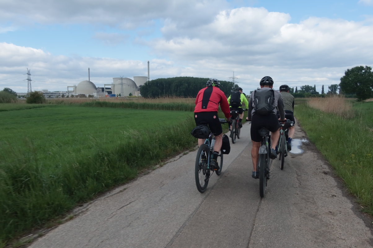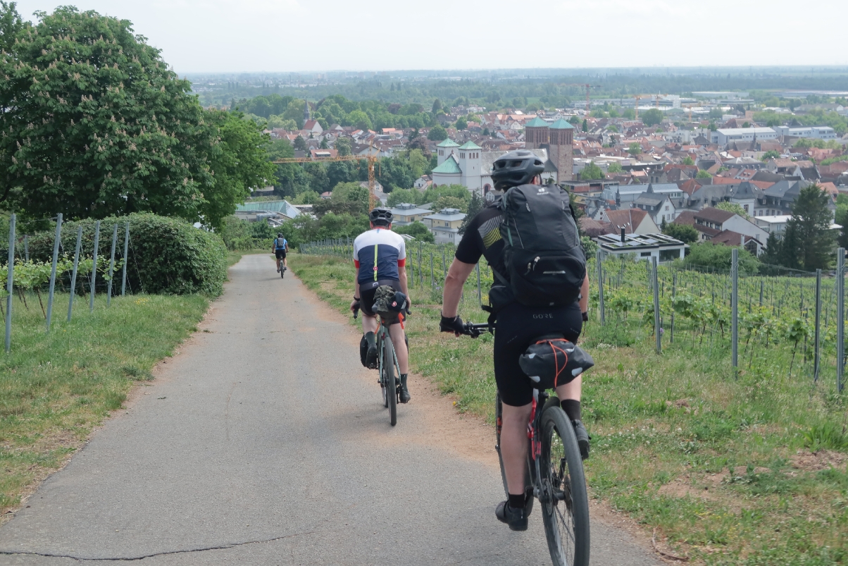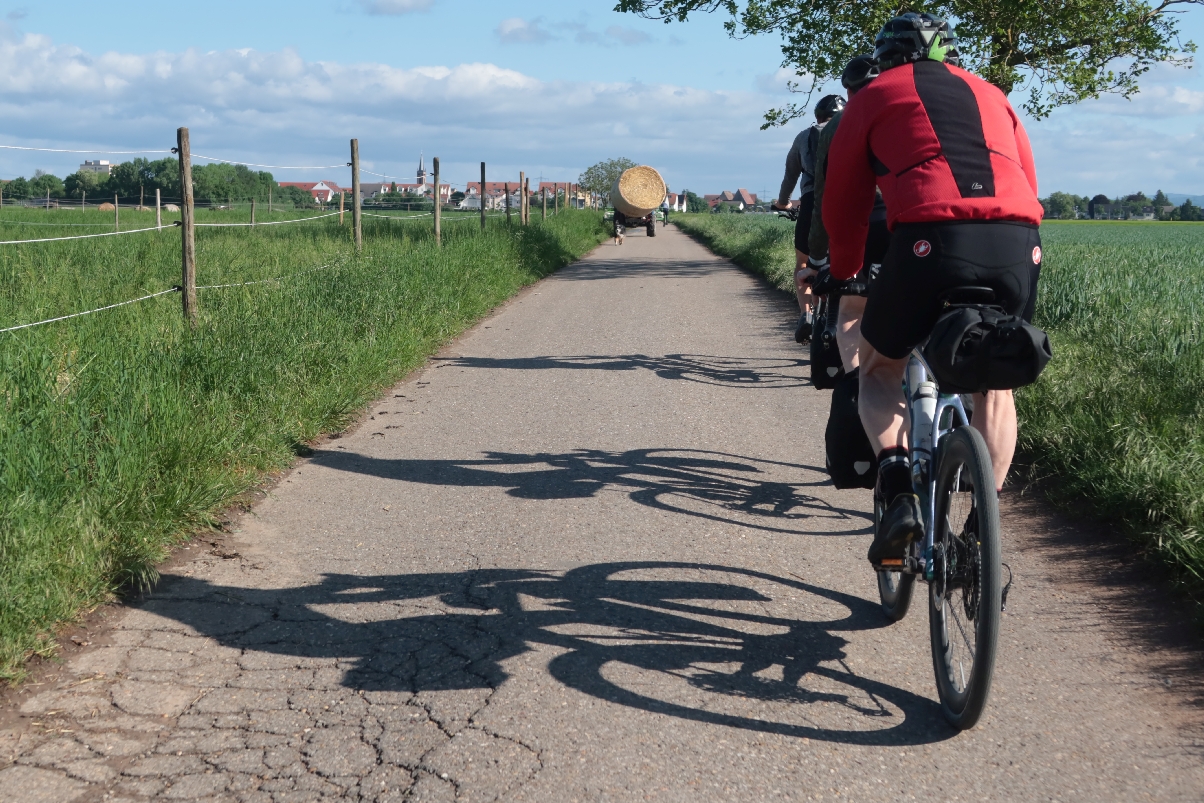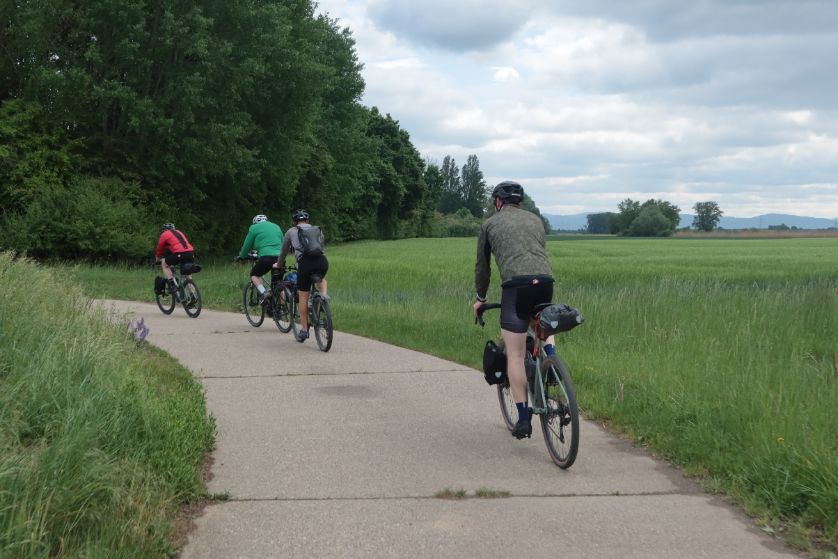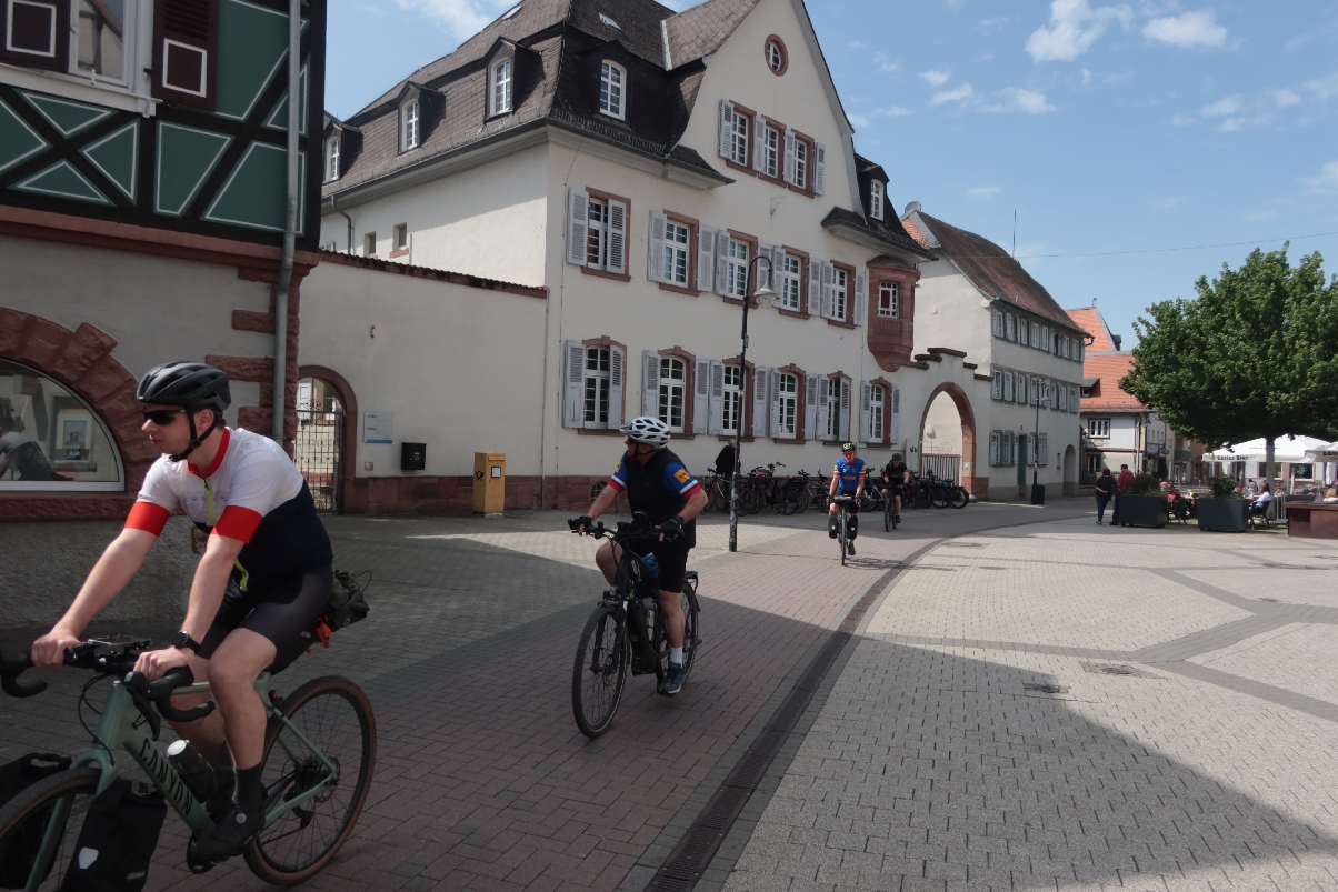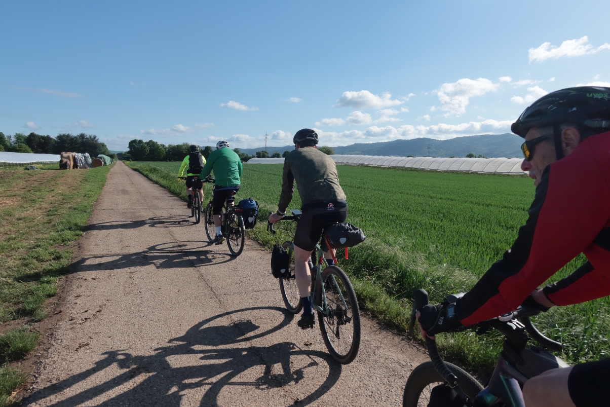 Am nächsten Morgen zum Start der 2. Etappe ist es sonnig, aber deutlich kühler als am gestrigen ersten Tag. Nach einer Runde durch die sehenswerte Altstadt verlassen wir Ladenburg in Richtung Norden. Nach nur wenigen Kilometern ziehen wir die Windstopperjacken drüber. Der Wind hat über Nacht gedreht und bläst uns wieder von vorne entgegen. Auf grünen Planwegen vorbei an Erdbeerfeldern geht es über Heddesheim nach Viernheim. Ab hier folgt eine längere Passage durch den Wald. Der fein geschotterte Untergrund ist ideal für die Gravelbiker im Team, vor allem aber ist es windstill. An Lampertheim vorbei kommen wir bei Bürstadt wieder aus dem Wald heraus. Wir sind wieder im Wind, fahren in nördlicher Richtung durch Biblis und erreichen am stillgelegten Atomkraftwerk den Rhein. Wir fahren aber hinter dem Deich entlang und bekommen den Rhein erst bei Gernsheim zu sehen. Wir folgen dem Fluss ein Stück auf dem Eurovelo15 und fahren am Rheindurchstich entlang eines Altrheinarmes auf Stockstadt zu. Über eine Brücke über den Altrhein kommen wir ins Naturschutzgebiet Kühkopf-Knoblauchsaue. Nach einem kurzen Stopp an der ehemaligen Erdölpumpe erreichen wir das Hofgut Guntershausen, wo wir eine Mittagspause einlegen. Leider lassen die frischen Temperaturen kein längeres Verweilen an dem idyllischen Ort zu. Wir verlassen die Altrheininsel wieder und fahren über Riedstadt-Goddelau auf Griesheim zu. Hinter dem August-Euler Flughafen, dem ältesten Flughafen Deutschlands, sind es nur noch wenige Kilometer bis zum Ziel am Hauptbahnhof in Darmstadt.