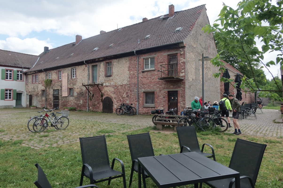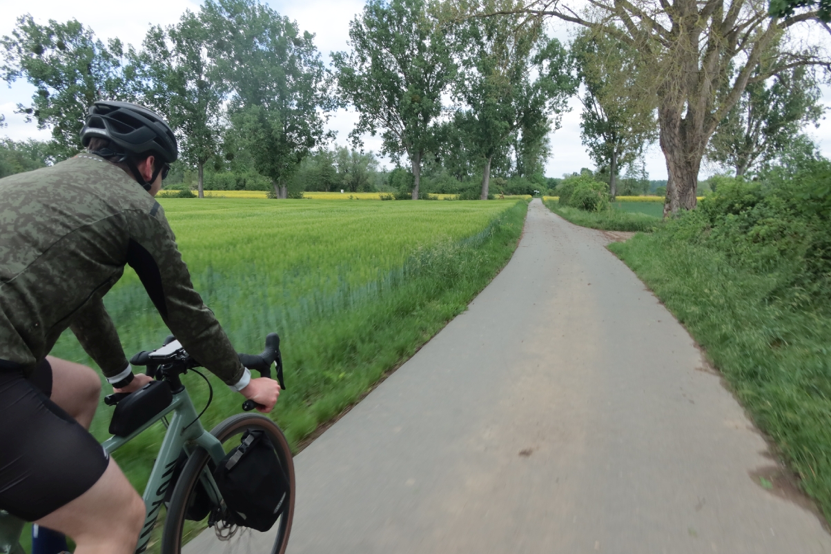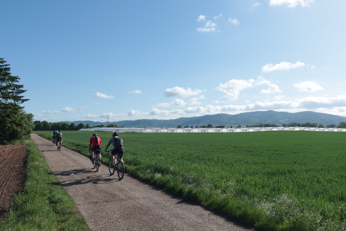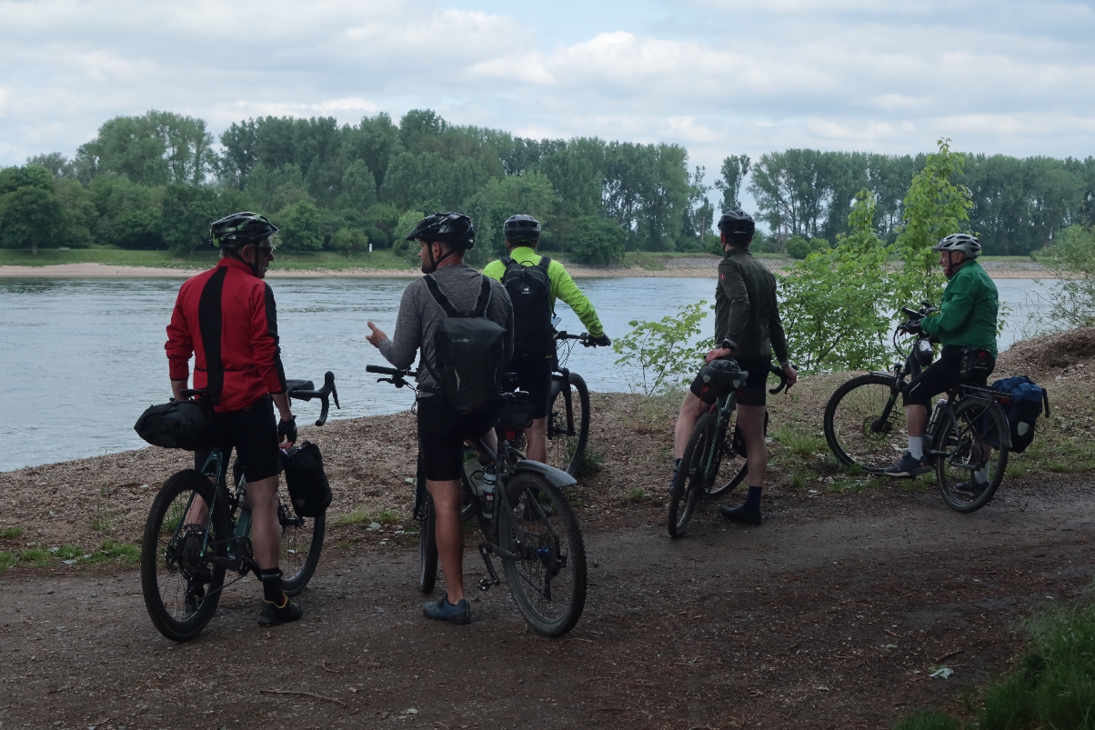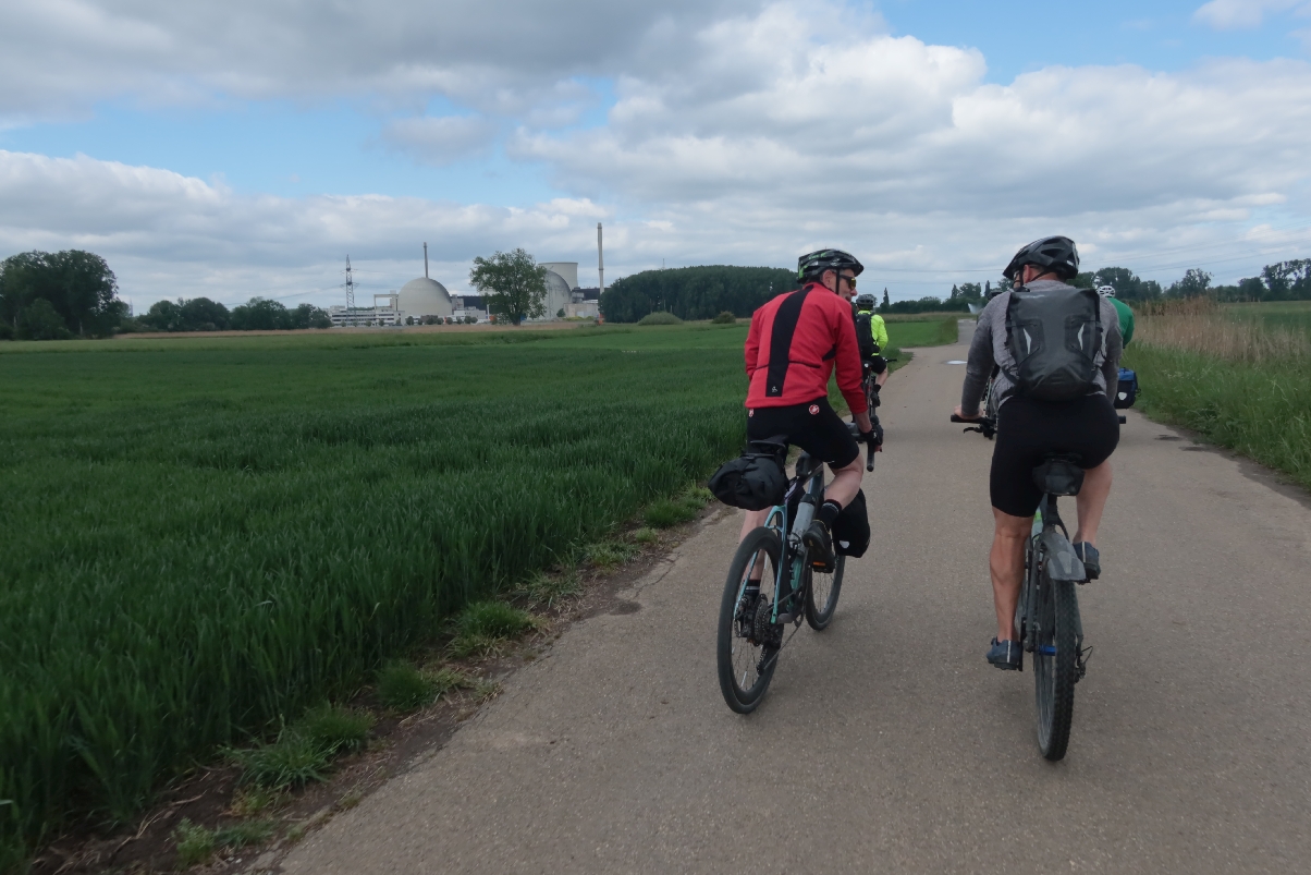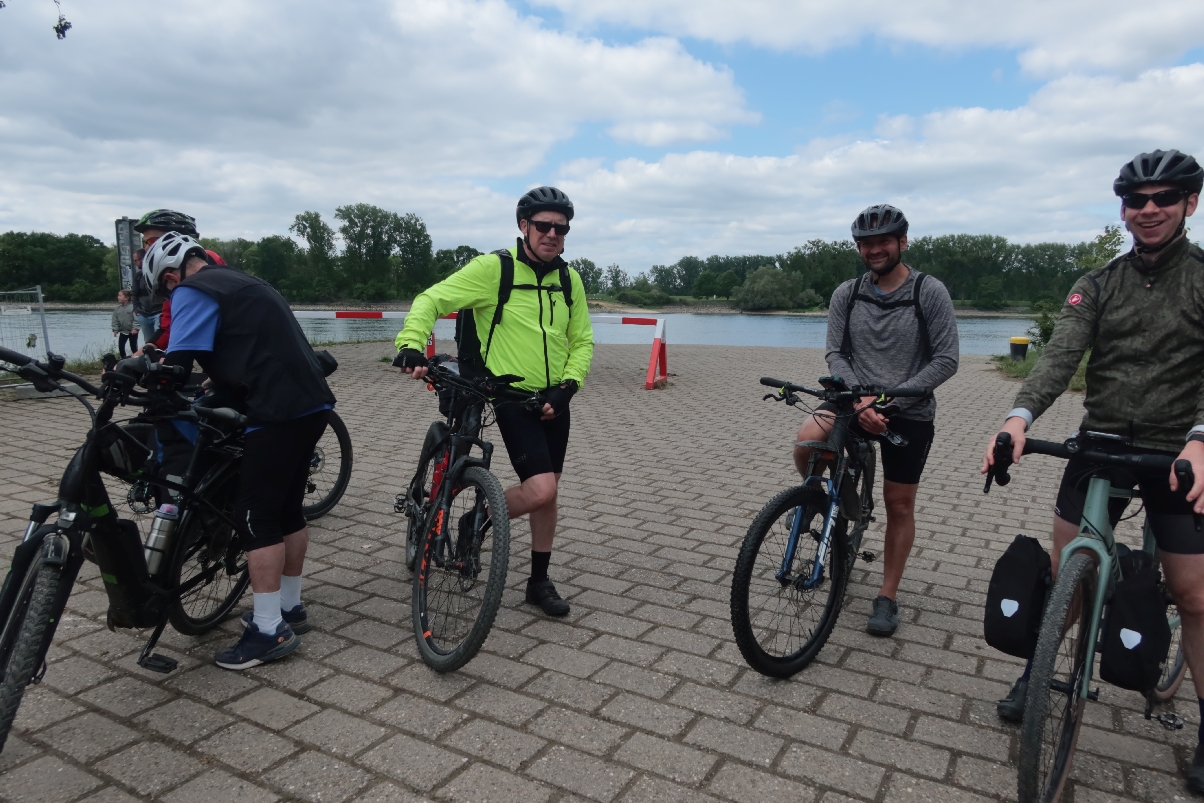 Am nächsten Morgen zum Start der 2. Etappe ist es sonnig, aber deutlich kühler als am gestrigen ersten Tag. Nach einer Runde durch die sehenswerte Altstadt verlassen wir Ladenburg in Richtung Norden. Nach nur wenigen Kilometern ziehen wir die Windstopperjacken drüber. Der Wind hat über Nacht gedreht und bläst uns wieder von vorne entgegen. Auf grünen Planwegen vorbei an Erdbeerfeldern geht es über Heddesheim nach Viernheim. Ab hier folgt eine längere Passage durch den Wald. Der fein geschotterte Untergrund ist ideal für die Gravelbiker im Team, vor allem aber ist es windstill. An Lampertheim vorbei kommen wir bei Bürstadt wieder aus dem Wald heraus. Wir sind wieder im Wind, fahren in nördlicher Richtung durch Biblis und erreichen am stillgelegten Atomkraftwerk den Rhein. Wir fahren aber hinter dem Deich entlang und bekommen den Rhein erst bei Gernsheim zu sehen. Wir folgen dem Fluss ein Stück auf dem Eurovelo15 und fahren am Rheindurchstich entlang eines Altrheinarmes auf Stockstadt zu. Über eine Brücke über den Altrhein kommen wir ins Naturschutzgebiet Kühkopf-Knoblauchsaue. Nach einem kurzen Stopp an der ehemaligen Erdölpumpe erreichen wir das Hofgut Guntershausen, wo wir eine Mittagspause einlegen. Leider lassen die frischen Temperaturen kein längeres Verweilen an dem idyllischen Ort zu. Wir verlassen die Altrheininsel wieder und fahren über Riedstadt-Goddelau auf Griesheim zu. Hinter dem August-Euler Flughafen, dem ältesten Flughafen Deutschlands, sind es nur noch wenige Kilometer bis zum Ziel am Hauptbahnhof in Darmstadt.