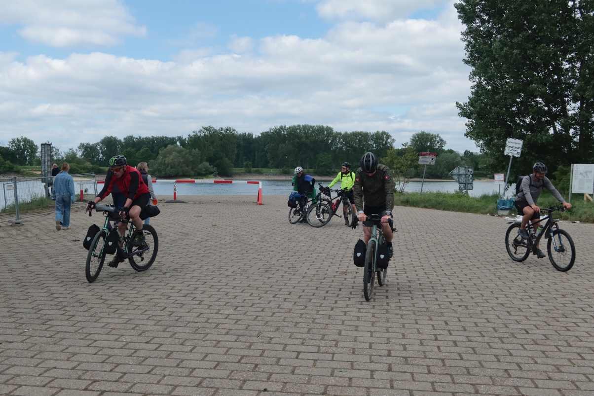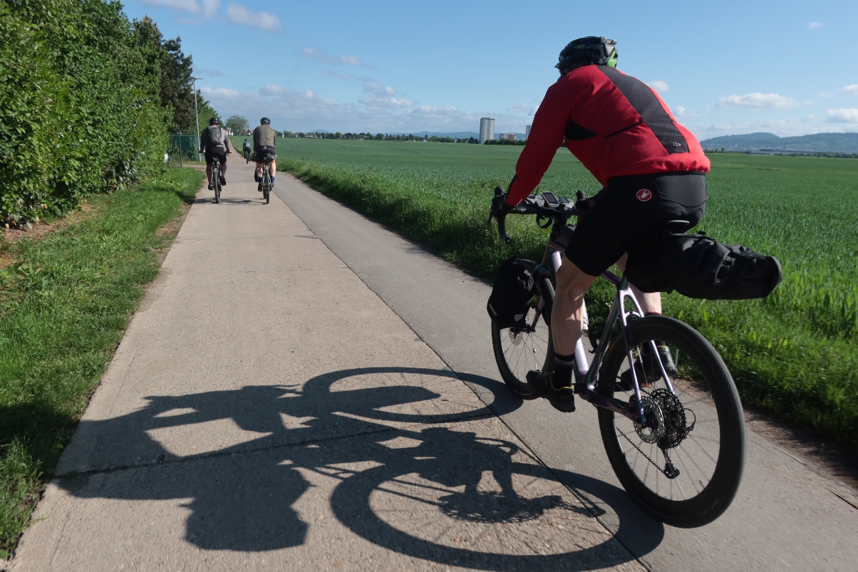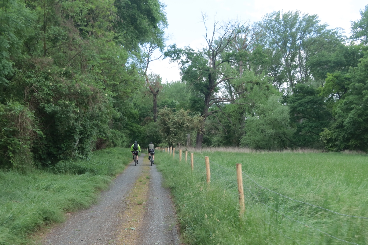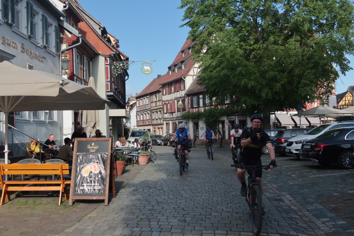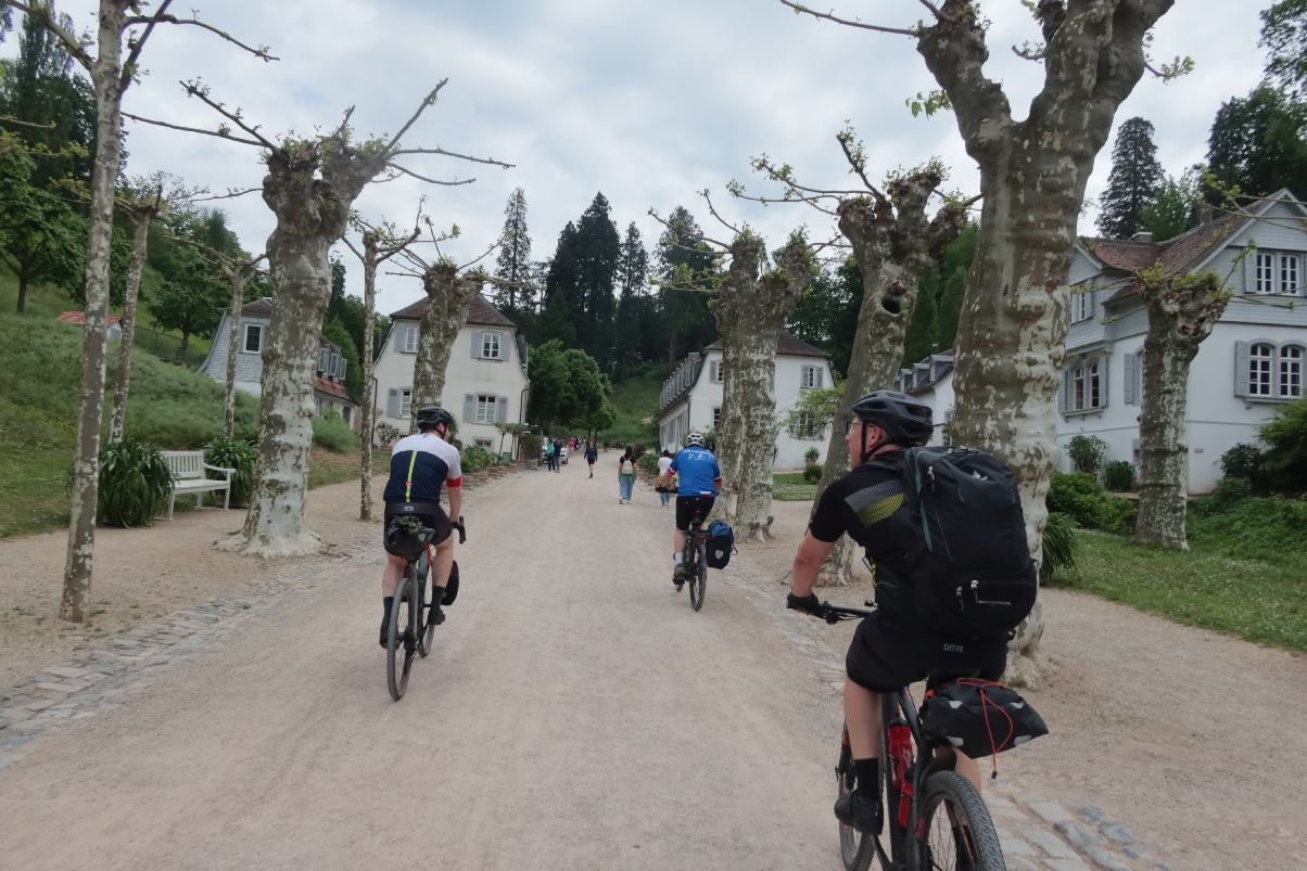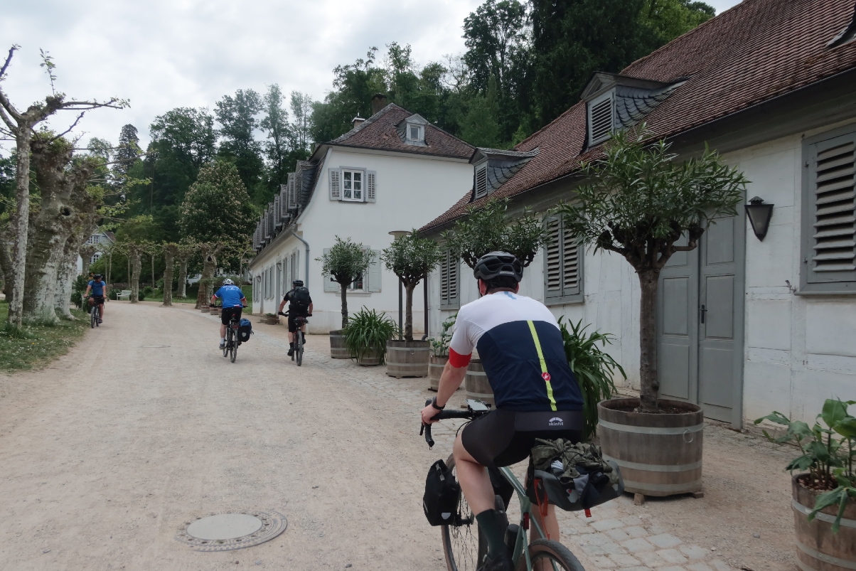 Am nächsten Morgen zum Start der 2. Etappe ist es sonnig, aber deutlich kühler als am gestrigen ersten Tag. Nach einer Runde durch die sehenswerte Altstadt verlassen wir Ladenburg in Richtung Norden. Nach nur wenigen Kilometern ziehen wir die Windstopperjacken drüber. Der Wind hat über Nacht gedreht und bläst uns wieder von vorne entgegen. Auf grünen Planwegen vorbei an Erdbeerfeldern geht es über Heddesheim nach Viernheim. Ab hier folgt eine längere Passage durch den Wald. Der fein geschotterte Untergrund ist ideal für die Gravelbiker im Team, vor allem aber ist es windstill. An Lampertheim vorbei kommen wir bei Bürstadt wieder aus dem Wald heraus. Wir sind wieder im Wind, fahren in nördlicher Richtung durch Biblis und erreichen am stillgelegten Atomkraftwerk den Rhein. Wir fahren aber hinter dem Deich entlang und bekommen den Rhein erst bei Gernsheim zu sehen. Wir folgen dem Fluss ein Stück auf dem Eurovelo15 und fahren am Rheindurchstich entlang eines Altrheinarmes auf Stockstadt zu. Über eine Brücke über den Altrhein kommen wir ins Naturschutzgebiet Kühkopf-Knoblauchsaue. Nach einem kurzen Stopp an der ehemaligen Erdölpumpe erreichen wir das Hofgut Guntershausen, wo wir eine Mittagspause einlegen. Leider lassen die frischen Temperaturen kein längeres Verweilen an dem idyllischen Ort zu. Wir verlassen die Altrheininsel wieder und fahren über Riedstadt-Goddelau auf Griesheim zu. Hinter dem August-Euler Flughafen, dem ältesten Flughafen Deutschlands, sind es nur noch wenige Kilometer bis zum Ziel am Hauptbahnhof in Darmstadt.