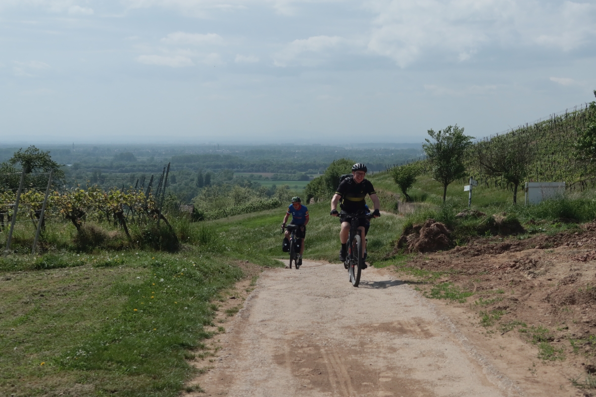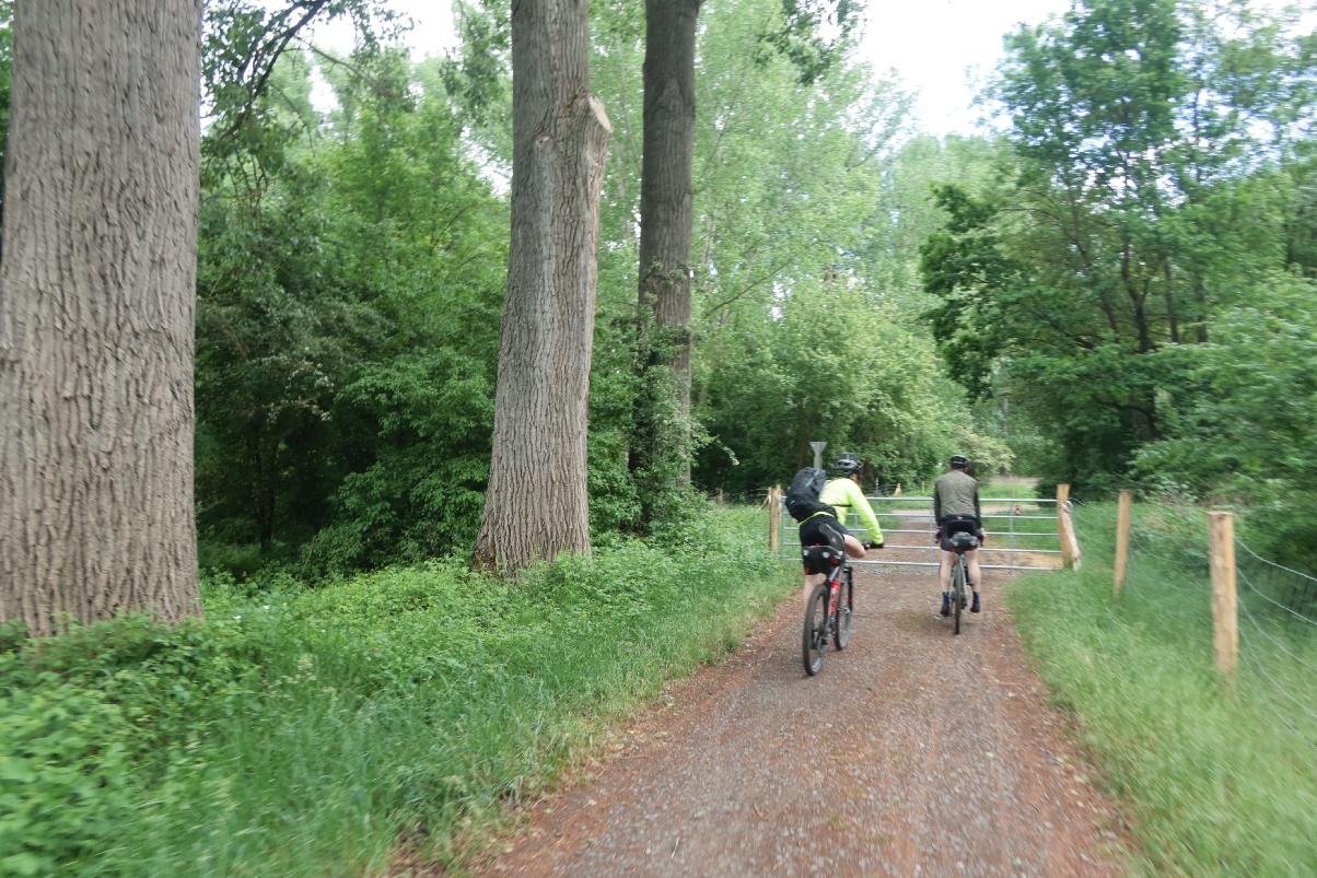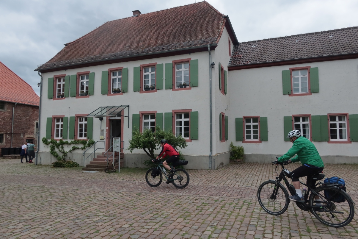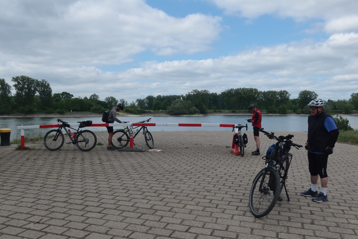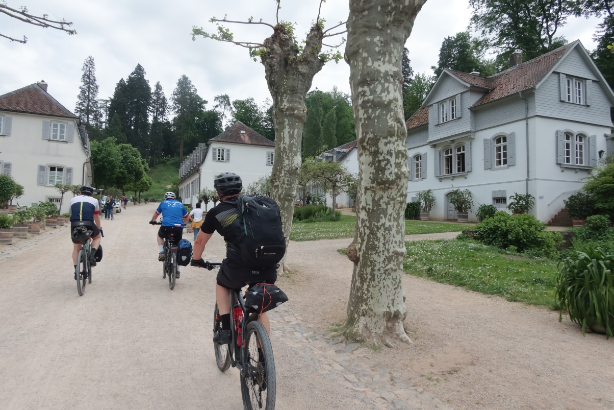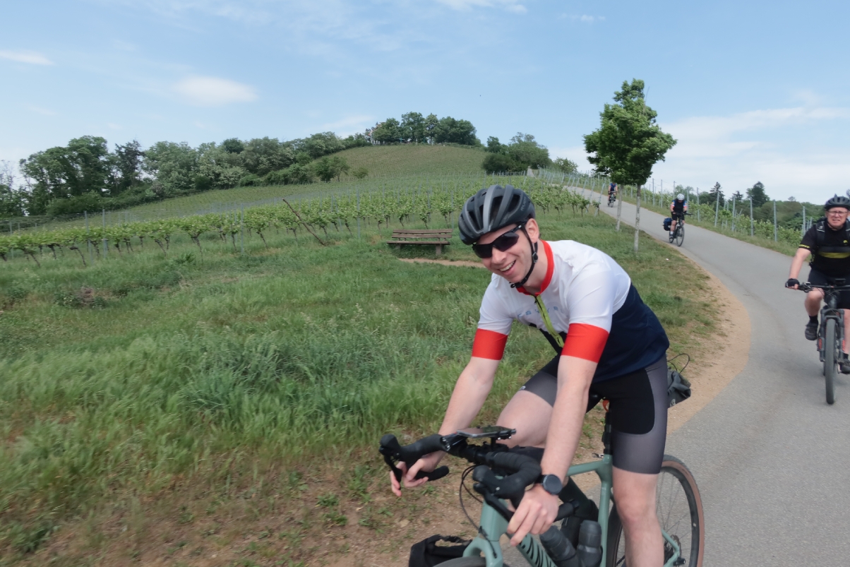 Am nächsten Morgen zum Start der 2. Etappe ist es sonnig, aber deutlich kühler als am gestrigen ersten Tag. Nach einer Runde durch die sehenswerte Altstadt verlassen wir Ladenburg in Richtung Norden. Nach nur wenigen Kilometern ziehen wir die Windstopperjacken drüber. Der Wind hat über Nacht gedreht und bläst uns wieder von vorne entgegen. Auf grünen Planwegen vorbei an Erdbeerfeldern geht es über Heddesheim nach Viernheim. Ab hier folgt eine längere Passage durch den Wald. Der fein geschotterte Untergrund ist ideal für die Gravelbiker im Team, vor allem aber ist es windstill. An Lampertheim vorbei kommen wir bei Bürstadt wieder aus dem Wald heraus. Wir sind wieder im Wind, fahren in nördlicher Richtung durch Biblis und erreichen am stillgelegten Atomkraftwerk den Rhein. Wir fahren aber hinter dem Deich entlang und bekommen den Rhein erst bei Gernsheim zu sehen. Wir folgen dem Fluss ein Stück auf dem Eurovelo15 und fahren am Rheindurchstich entlang eines Altrheinarmes auf Stockstadt zu. Über eine Brücke über den Altrhein kommen wir ins Naturschutzgebiet Kühkopf-Knoblauchsaue. Nach einem kurzen Stopp an der ehemaligen Erdölpumpe erreichen wir das Hofgut Guntershausen, wo wir eine Mittagspause einlegen. Leider lassen die frischen Temperaturen kein längeres Verweilen an dem idyllischen Ort zu. Wir verlassen die Altrheininsel wieder und fahren über Riedstadt-Goddelau auf Griesheim zu. Hinter dem August-Euler Flughafen, dem ältesten Flughafen Deutschlands, sind es nur noch wenige Kilometer bis zum Ziel am Hauptbahnhof in Darmstadt.