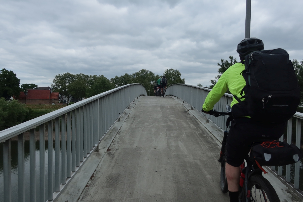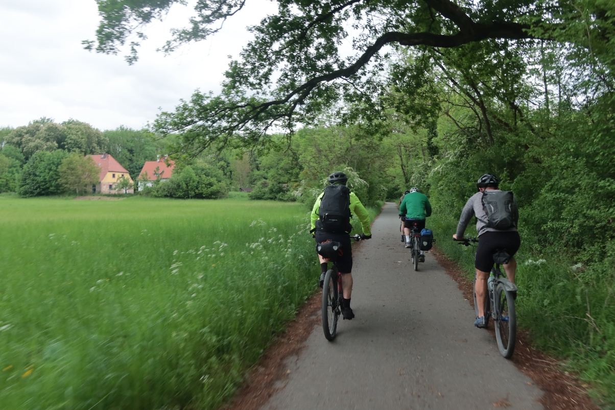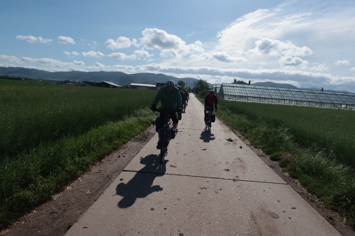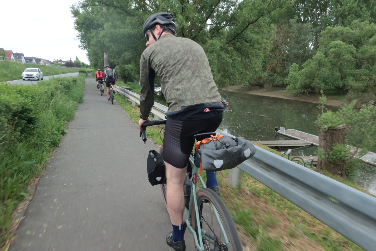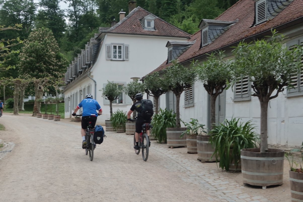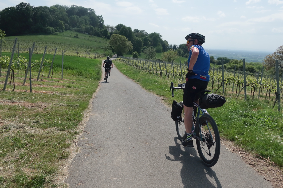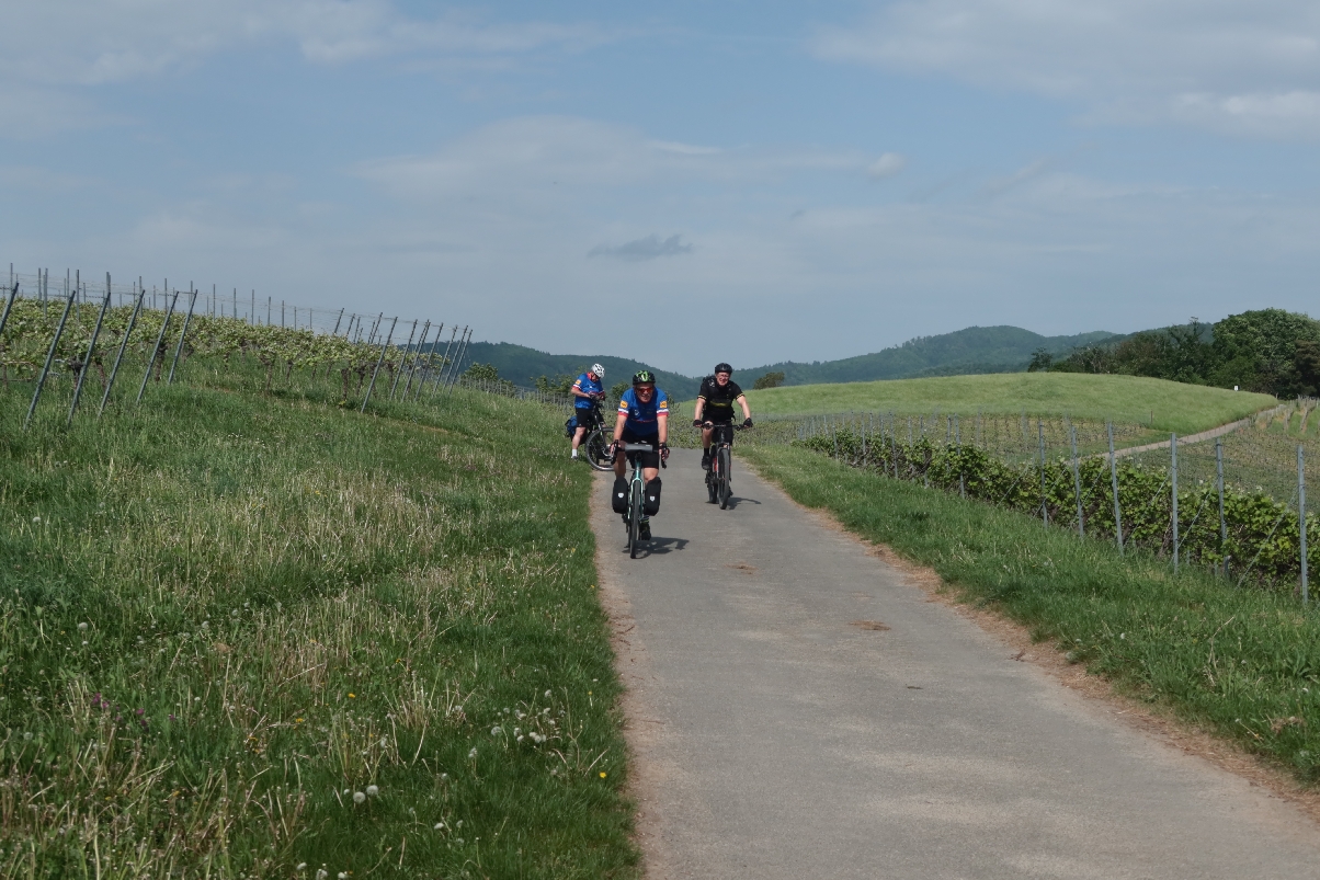 Am nächsten Morgen zum Start der 2. Etappe ist es sonnig, aber deutlich kühler als am gestrigen ersten Tag. Nach einer Runde durch die sehenswerte Altstadt verlassen wir Ladenburg in Richtung Norden. Nach nur wenigen Kilometern ziehen wir die Windstopperjacken drüber. Der Wind hat über Nacht gedreht und bläst uns wieder von vorne entgegen. Auf grünen Planwegen vorbei an Erdbeerfeldern geht es über Heddesheim nach Viernheim. Ab hier folgt eine längere Passage durch den Wald. Der fein geschotterte Untergrund ist ideal für die Gravelbiker im Team, vor allem aber ist es windstill. An Lampertheim vorbei kommen wir bei Bürstadt wieder aus dem Wald heraus. Wir sind wieder im Wind, fahren in nördlicher Richtung durch Biblis und erreichen am stillgelegten Atomkraftwerk den Rhein. Wir fahren aber hinter dem Deich entlang und bekommen den Rhein erst bei Gernsheim zu sehen. Wir folgen dem Fluss ein Stück auf dem Eurovelo15 und fahren am Rheindurchstich entlang eines Altrheinarmes auf Stockstadt zu. Über eine Brücke über den Altrhein kommen wir ins Naturschutzgebiet Kühkopf-Knoblauchsaue. Nach einem kurzen Stopp an der ehemaligen Erdölpumpe erreichen wir das Hofgut Guntershausen, wo wir eine Mittagspause einlegen. Leider lassen die frischen Temperaturen kein längeres Verweilen an dem idyllischen Ort zu. Wir verlassen die Altrheininsel wieder und fahren über Riedstadt-Goddelau auf Griesheim zu. Hinter dem August-Euler Flughafen, dem ältesten Flughafen Deutschlands, sind es nur noch wenige Kilometer bis zum Ziel am Hauptbahnhof in Darmstadt.