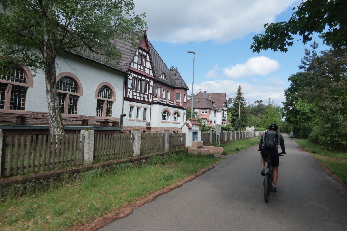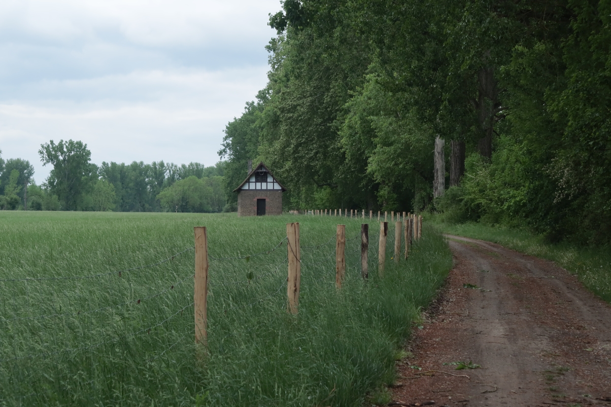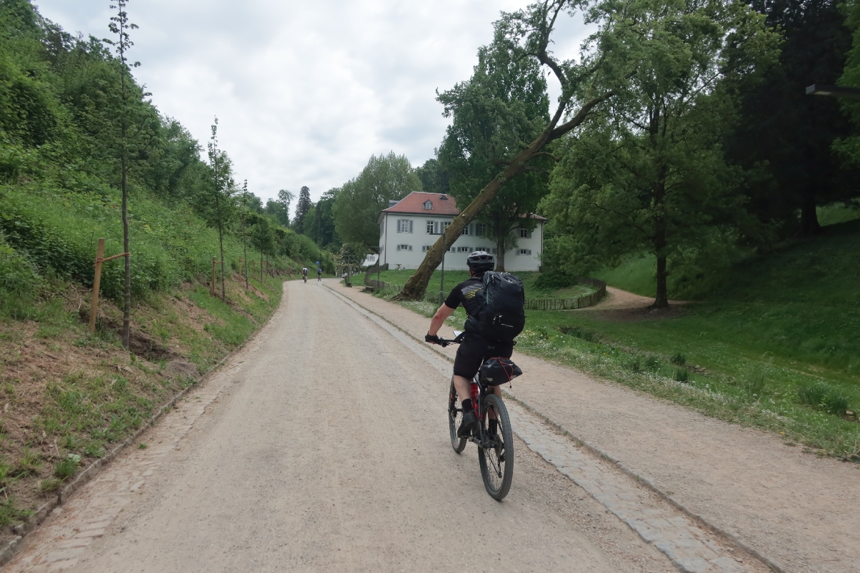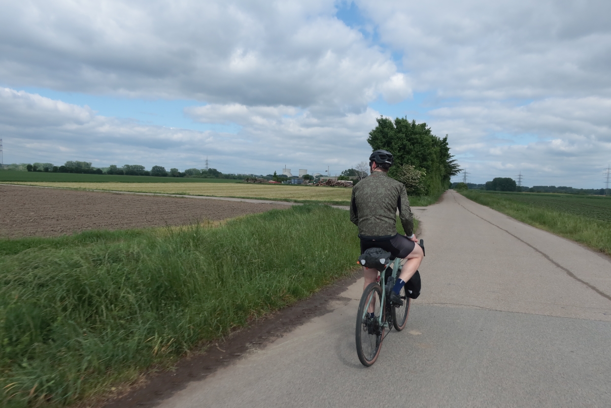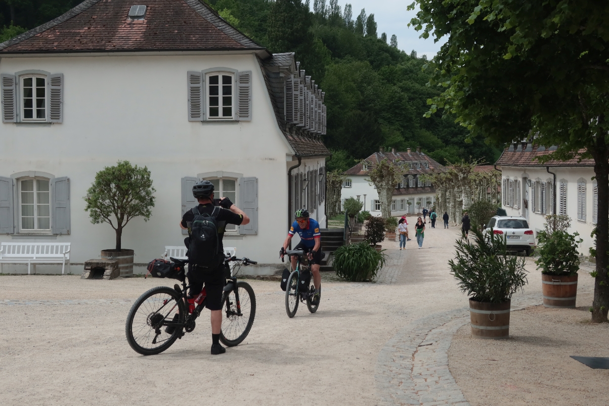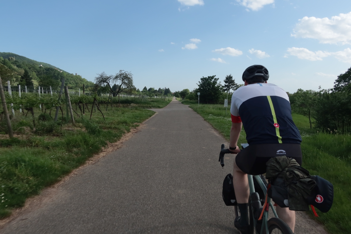 Am nächsten Morgen zum Start der 2. Etappe ist es sonnig, aber deutlich kühler als am gestrigen ersten Tag. Nach einer Runde durch die sehenswerte Altstadt verlassen wir Ladenburg in Richtung Norden. Nach nur wenigen Kilometern ziehen wir die Windstopperjacken drüber. Der Wind hat über Nacht gedreht und bläst uns wieder von vorne entgegen. Auf grünen Planwegen vorbei an Erdbeerfeldern geht es über Heddesheim nach Viernheim. Ab hier folgt eine längere Passage durch den Wald. Der fein geschotterte Untergrund ist ideal für die Gravelbiker im Team, vor allem aber ist es windstill. An Lampertheim vorbei kommen wir bei Bürstadt wieder aus dem Wald heraus. Wir sind wieder im Wind, fahren in nördlicher Richtung durch Biblis und erreichen am stillgelegten Atomkraftwerk den Rhein. Wir fahren aber hinter dem Deich entlang und bekommen den Rhein erst bei Gernsheim zu sehen. Wir folgen dem Fluss ein Stück auf dem Eurovelo15 und fahren am Rheindurchstich entlang eines Altrheinarmes auf Stockstadt zu. Über eine Brücke über den Altrhein kommen wir ins Naturschutzgebiet Kühkopf-Knoblauchsaue. Nach einem kurzen Stopp an der ehemaligen Erdölpumpe erreichen wir das Hofgut Guntershausen, wo wir eine Mittagspause einlegen. Leider lassen die frischen Temperaturen kein längeres Verweilen an dem idyllischen Ort zu. Wir verlassen die Altrheininsel wieder und fahren über Riedstadt-Goddelau auf Griesheim zu. Hinter dem August-Euler Flughafen, dem ältesten Flughafen Deutschlands, sind es nur noch wenige Kilometer bis zum Ziel am Hauptbahnhof in Darmstadt.