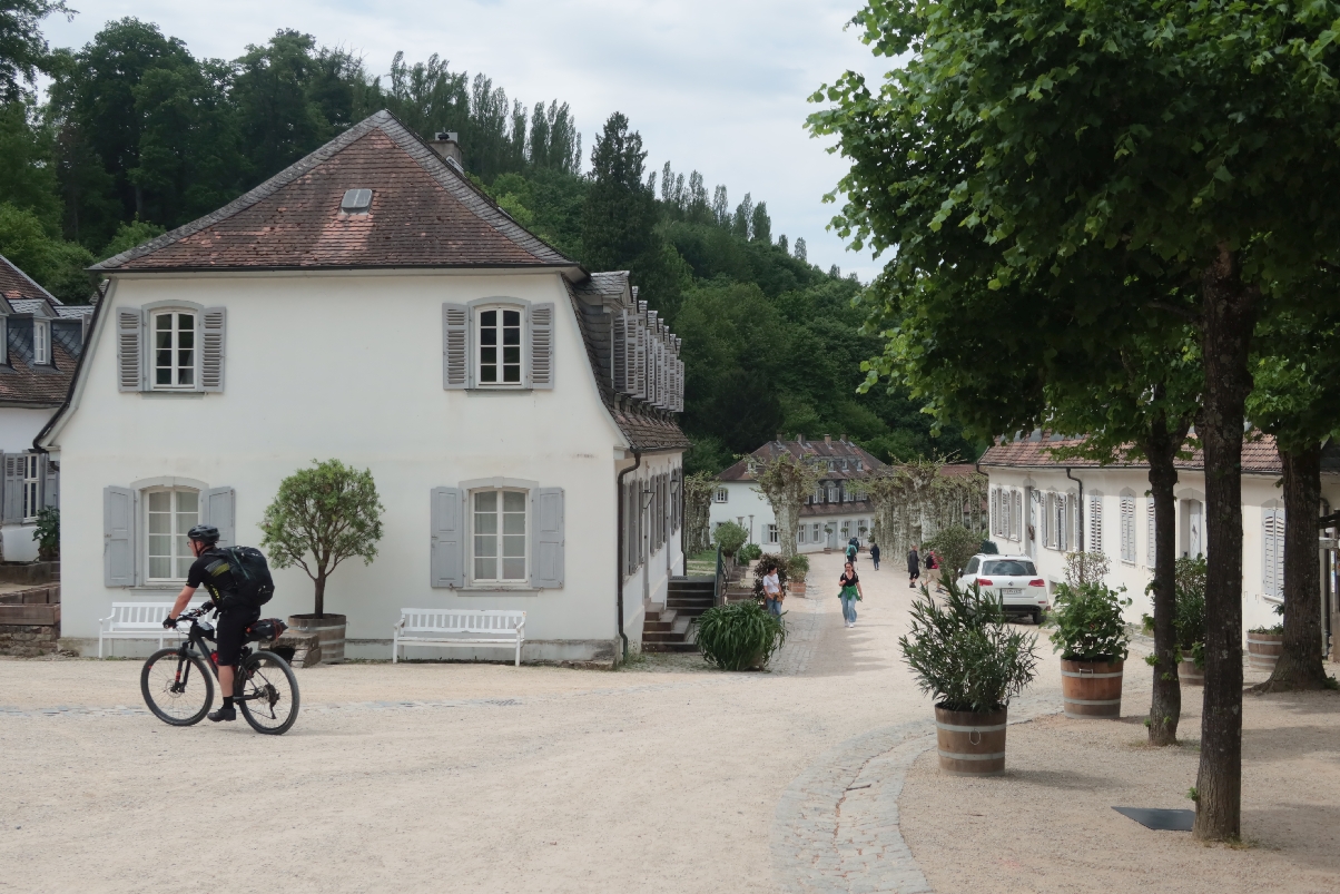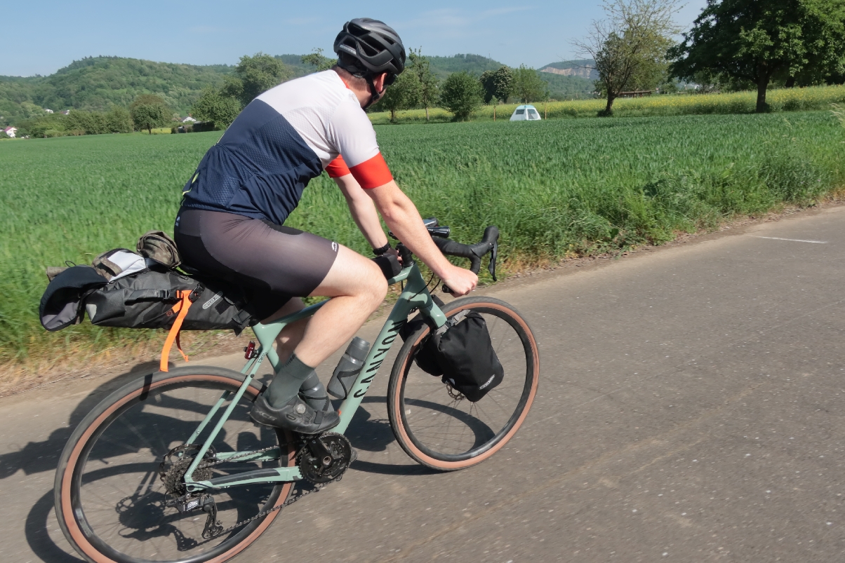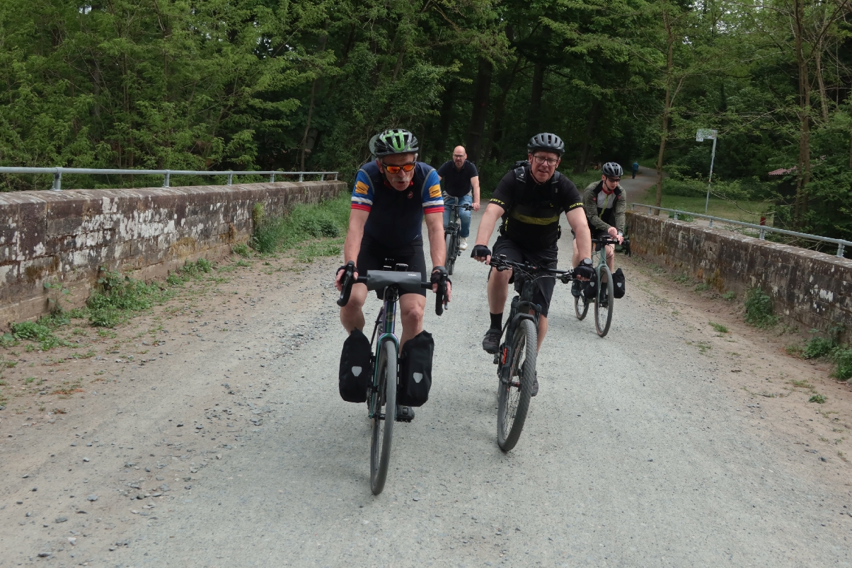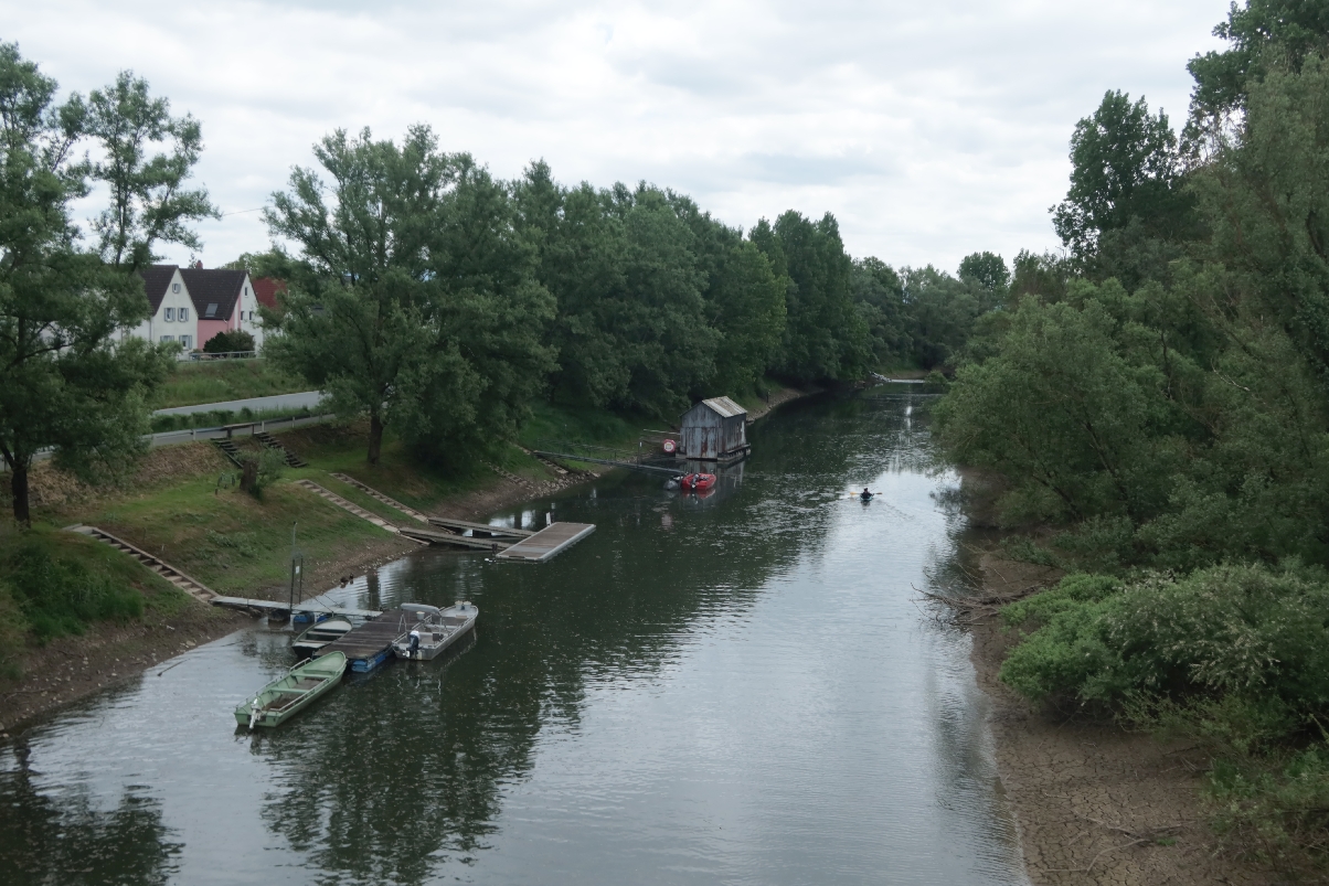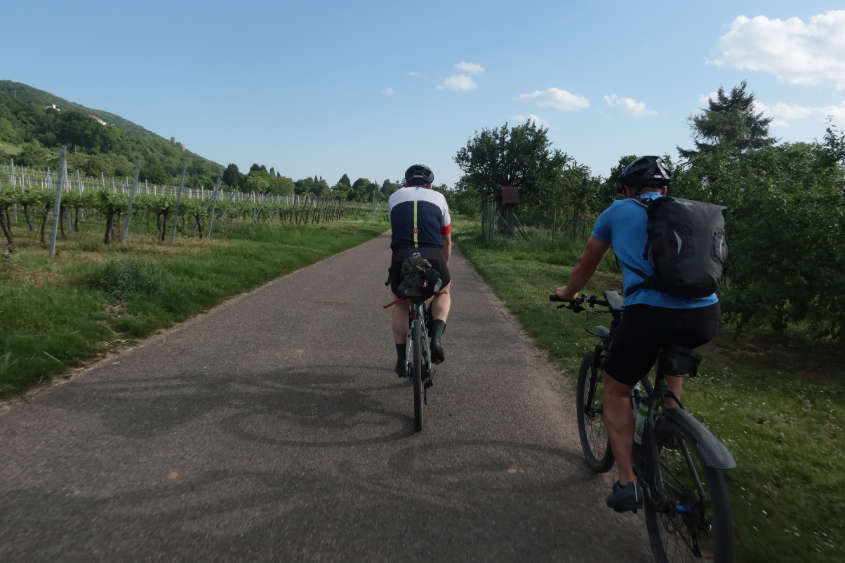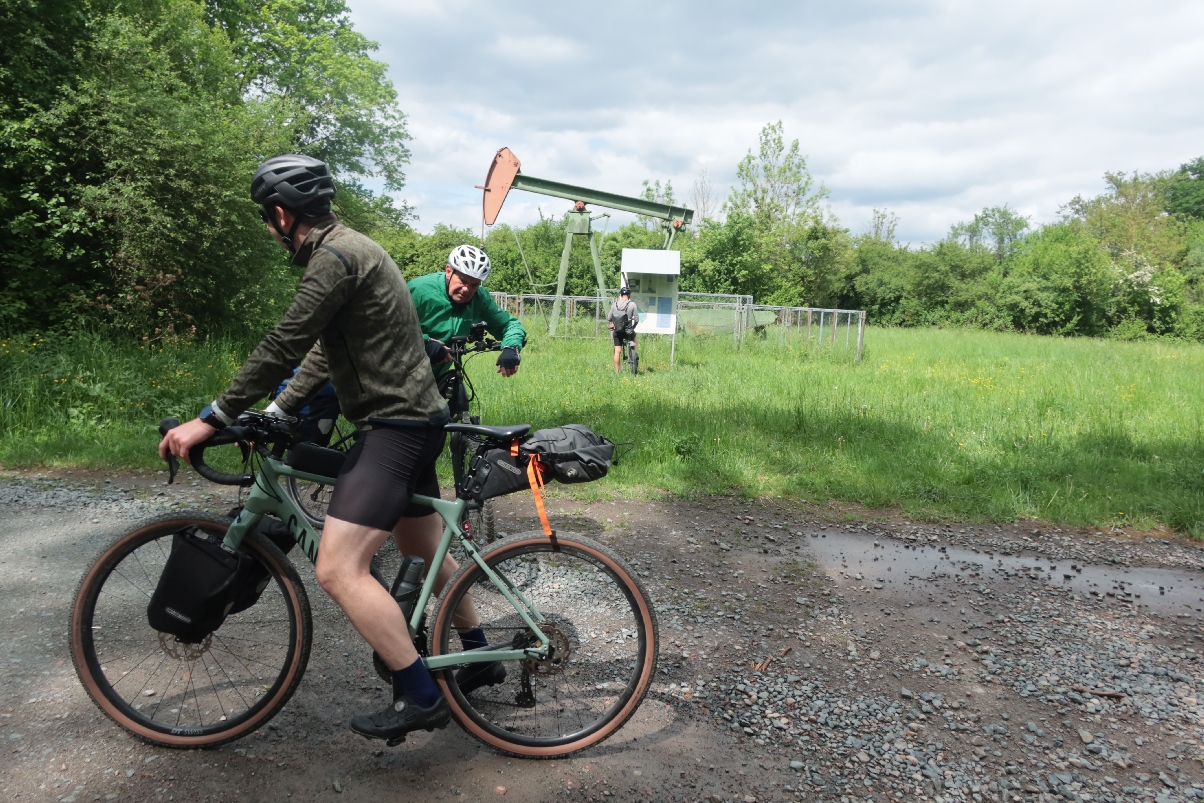 Am nächsten Morgen zum Start der 2. Etappe ist es sonnig, aber deutlich kühler als am gestrigen ersten Tag. Nach einer Runde durch die sehenswerte Altstadt verlassen wir Ladenburg in Richtung Norden. Nach nur wenigen Kilometern ziehen wir die Windstopperjacken drüber. Der Wind hat über Nacht gedreht und bläst uns wieder von vorne entgegen. Auf grünen Planwegen vorbei an Erdbeerfeldern geht es über Heddesheim nach Viernheim. Ab hier folgt eine längere Passage durch den Wald. Der fein geschotterte Untergrund ist ideal für die Gravelbiker im Team, vor allem aber ist es windstill. An Lampertheim vorbei kommen wir bei Bürstadt wieder aus dem Wald heraus. Wir sind wieder im Wind, fahren in nördlicher Richtung durch Biblis und erreichen am stillgelegten Atomkraftwerk den Rhein. Wir fahren aber hinter dem Deich entlang und bekommen den Rhein erst bei Gernsheim zu sehen. Wir folgen dem Fluss ein Stück auf dem Eurovelo15 und fahren am Rheindurchstich entlang eines Altrheinarmes auf Stockstadt zu. Über eine Brücke über den Altrhein kommen wir ins Naturschutzgebiet Kühkopf-Knoblauchsaue. Nach einem kurzen Stopp an der ehemaligen Erdölpumpe erreichen wir das Hofgut Guntershausen, wo wir eine Mittagspause einlegen. Leider lassen die frischen Temperaturen kein längeres Verweilen an dem idyllischen Ort zu. Wir verlassen die Altrheininsel wieder und fahren über Riedstadt-Goddelau auf Griesheim zu. Hinter dem August-Euler Flughafen, dem ältesten Flughafen Deutschlands, sind es nur noch wenige Kilometer bis zum Ziel am Hauptbahnhof in Darmstadt.