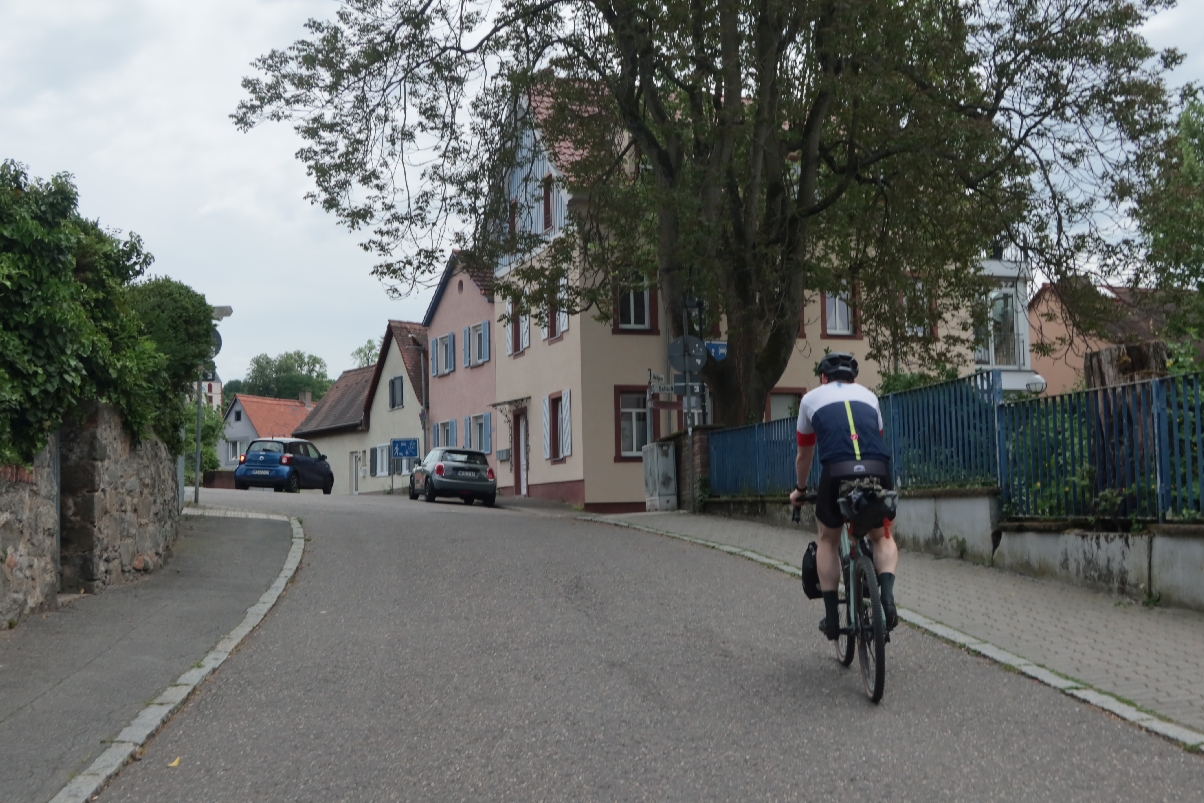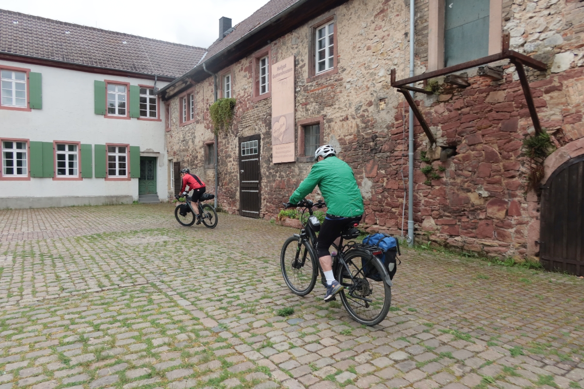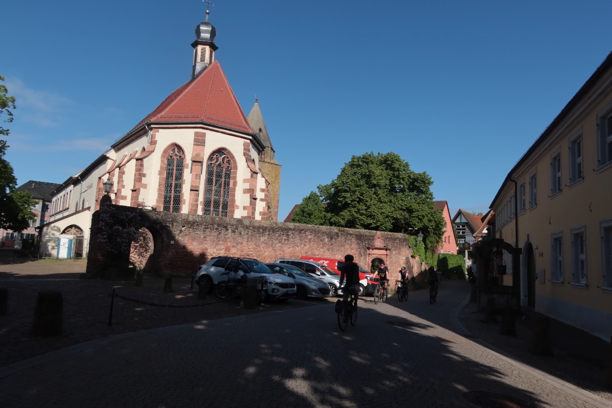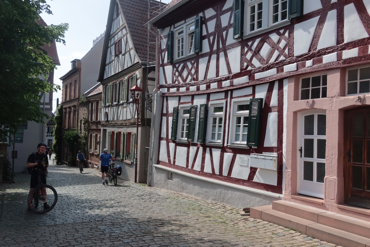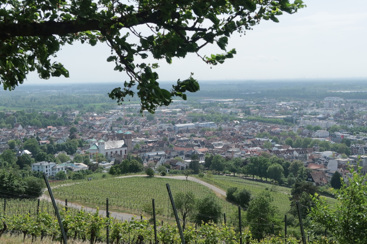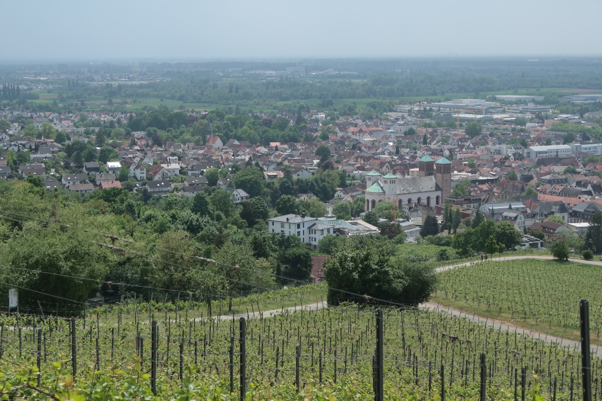Vor dem Bahnhof wartet bereits Jan und im dezimierten Team geht es los. Erstmal quer durch die Stadt, über den zentralen Luisenplatz am Lange Lui und dem Schloss vorbei zum Woog am östlichen Stadtrand. In einem grossen Bogen führt der Weg durch den Darmstädter Stadtwald in Richtung Süden nach Eberstadt. Bei Malchen ist der „Einstieg“ zur Bergstraße erreicht. Über Seeheim-Jugenheim, Alsbach-Hähnlein, Zwingenberg geht nach Auerbach, wo wir von der Radroute Bergstraße abzweigen. Wir fahren durch das Fürstenlager, einer ländlichen Sommerresidenz des Hauses Hessen-Darmstadt aus dem 18. Jahrhundert. Am Ende des idyllischen Gebäudeemsembles folgt die erste Bergwertung, die mit einem Traumblick auf die Weinberge und Hügel der Bergstraße belohnt wird. Am Kirchberghäuschen, einem Lusttempel der feinen Bensheimer Gesellschaft aus dem 19. Jahrhundert machen wir Mittagsrast. Hoch oben in den Weinbergen ist der Blick ist phantastisch, unter uns Bensheim, dahinter die Starkenburg über Heppenheim und in der Ferne sind im Dunst schemenhaft die Silhouette des Mannheimer Fernsehturms, die Fabriktürme der BASF in Ludwigshafen und das AKW Biblis zu sehen. Nur der Wind bläst uns heftig um die Ohren. Gestärkt mit einer Portion Odenwälder Kochkäse geht es durch den Weinberg steil hinunter nach Bensheim, einmal quer durch die quirlige Innenstadt und am anderen Ende wieder hinauf in die Weinberge. Wir umrunden den Hemsberg und haben erneut einen grandiosen Blick auf die Starkenburg, die Hügel des Odenwaldes und die Rheinebene. Am Ende der 2. Bergwertung folgt die Abfahrt in die Kreisstadt Heppenheim. Wir statten dem mittelalterlichen Markplatz und „Dom“ einen Besuch ab und setzen unsere Fahrt auf der Bergstaße fort. Kurz hinter Heppenheim passieren wir die hessische Landesgrenze. Über Laudenbach und Hemsbach gelangen wir nach Weinheim, wo in der belebten Altstadt eine Eisdiele für Erfrischung sorgt. Lützelsachsen, Leutershausen und Schriesheim sind die nächsten Orte, die wir durchfahren. Wir verlassen die Bergstraße und fahren in westlicher Richtung auf das Etappenziel Ladenburg am Neckar zu. Der Wind bläst uns direkt ins Gesicht….