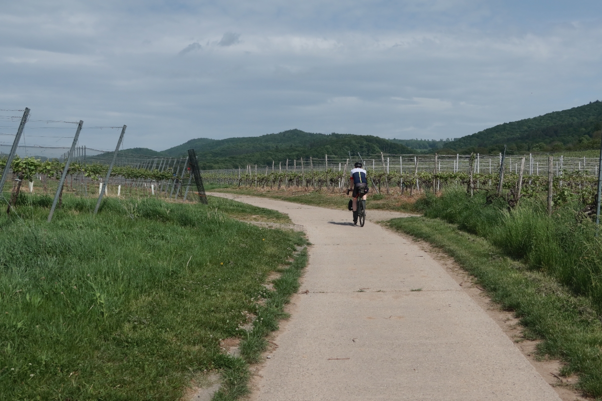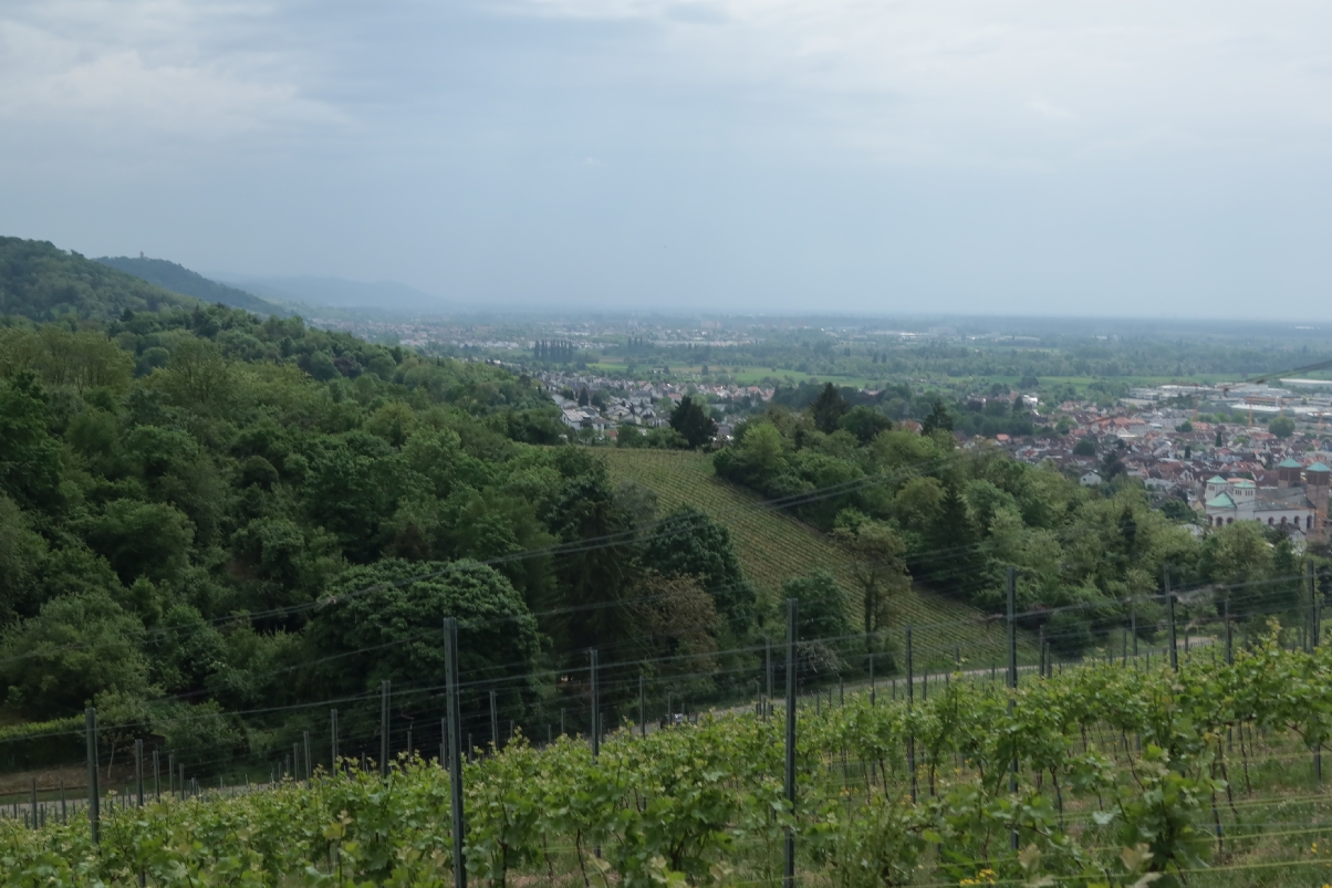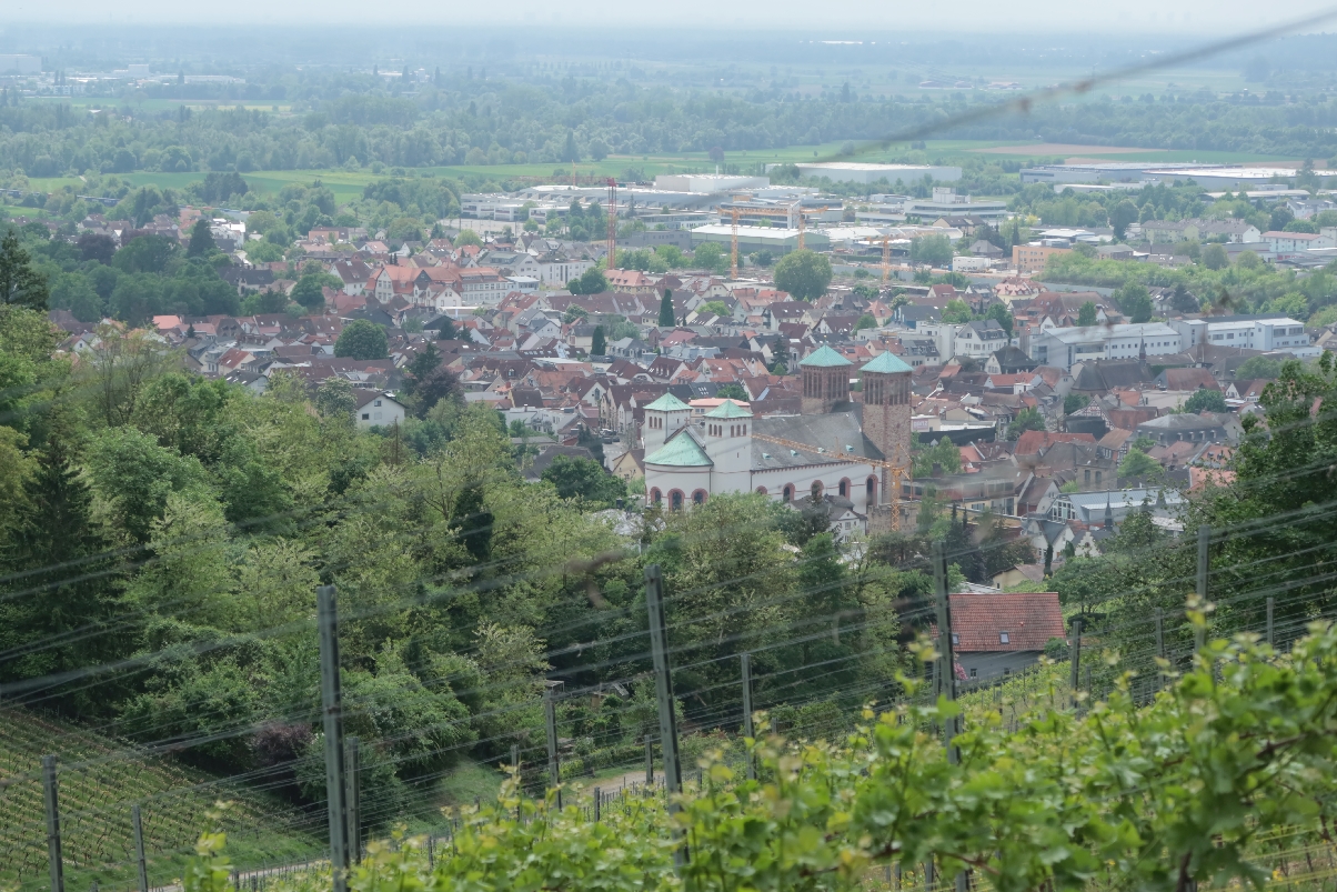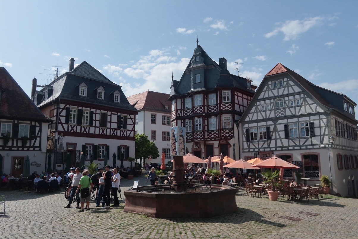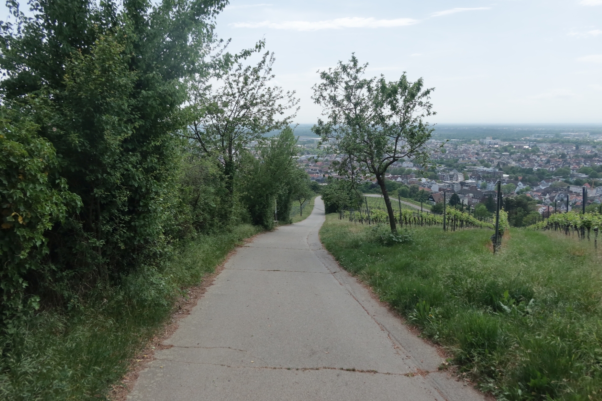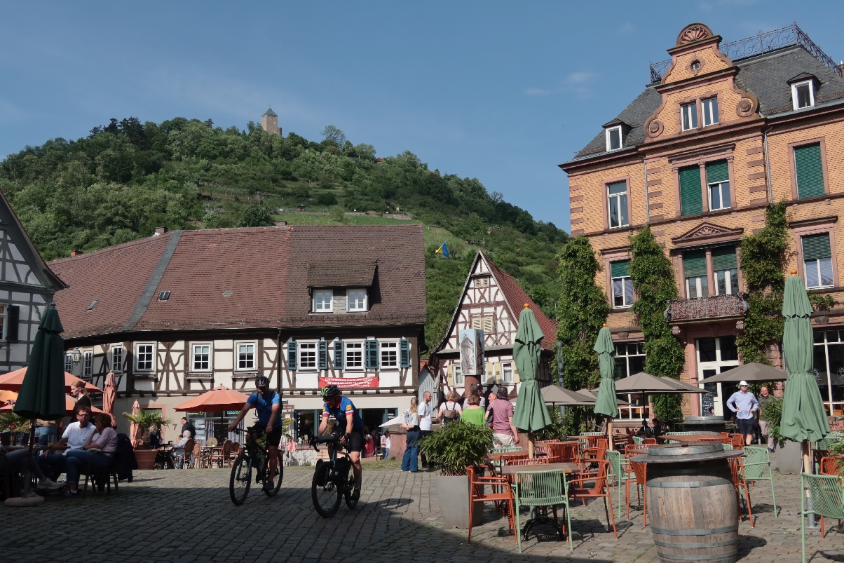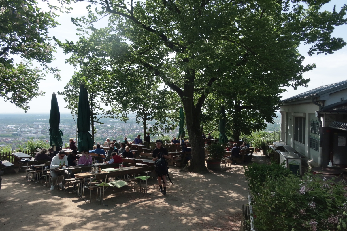 Vor dem Bahnhof wartet bereits Jan und im dezimierten Team geht es los. Erstmal quer durch die Stadt, über den zentralen Luisenplatz am Lange Lui und dem Schloss vorbei zum Woog am östlichen Stadtrand. In einem grossen Bogen führt der Weg durch den Darmstädter Stadtwald in Richtung Süden nach Eberstadt. Bei Malchen ist der „Einstieg“ zur Bergstraße erreicht. Über Seeheim-Jugenheim, Alsbach-Hähnlein, Zwingenberg geht nach Auerbach, wo wir von der Radroute Bergstraße abzweigen. Wir fahren durch das Fürstenlager, einer ländlichen Sommerresidenz des Hauses Hessen-Darmstadt aus dem 18. Jahrhundert. Am Ende des idyllischen Gebäudeemsembles folgt die erste Bergwertung, die mit einem Traumblick auf die Weinberge und Hügel der Bergstraße belohnt wird. Am Kirchberghäuschen, einem Lusttempel der feinen Bensheimer Gesellschaft aus dem 19. Jahrhundert machen wir Mittagsrast. Hoch oben in den Weinbergen ist der Blick ist phantastisch, unter uns Bensheim, dahinter die Starkenburg über Heppenheim und in der Ferne sind im Dunst schemenhaft die Silhouette des Mannheimer Fernsehturms, die Fabriktürme der BASF in Ludwigshafen und das AKW Biblis zu sehen. Nur der Wind bläst uns heftig um die Ohren. Gestärkt mit einer Portion Odenwälder Kochkäse geht es durch den Weinberg steil hinunter nach Bensheim, einmal quer durch die quirlige Innenstadt und am anderen Ende wieder hinauf in die Weinberge. Wir umrunden den Hemsberg und haben erneut einen grandiosen Blick auf die Starkenburg, die Hügel des Odenwaldes und die Rheinebene. Am Ende der 2. Bergwertung folgt die Abfahrt in die Kreisstadt Heppenheim. Wir statten dem mittelalterlichen Markplatz und „Dom“ einen Besuch ab und setzen unsere Fahrt auf der Bergstaße fort. Kurz hinter Heppenheim passieren wir die hessische Landesgrenze. Über Laudenbach und Hemsbach gelangen wir nach Weinheim, wo in der belebten Altstadt eine Eisdiele für Erfrischung sorgt. Lützelsachsen, Leutershausen und Schriesheim sind die nächsten Orte, die wir durchfahren. Wir verlassen die Bergstraße und fahren in westlicher Richtung auf das Etappenziel Ladenburg am Neckar zu. Der Wind bläst uns direkt ins Gesicht….
