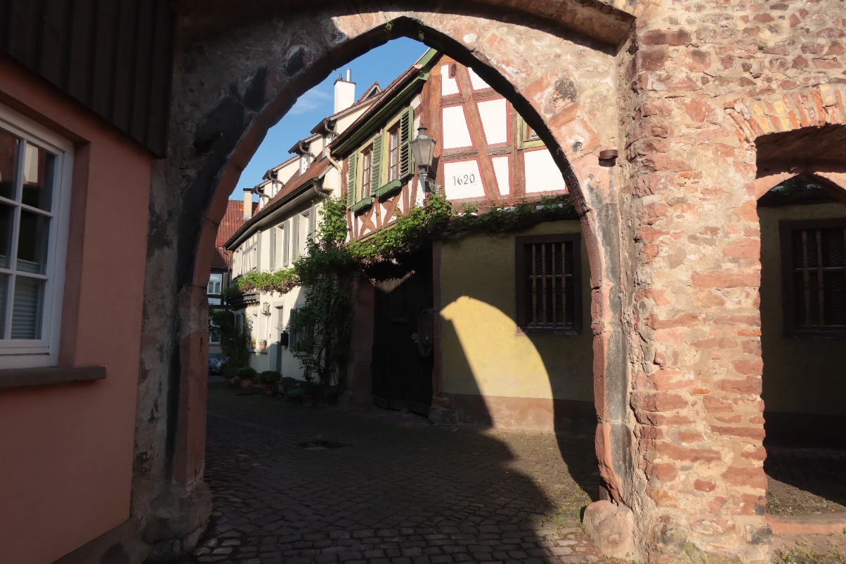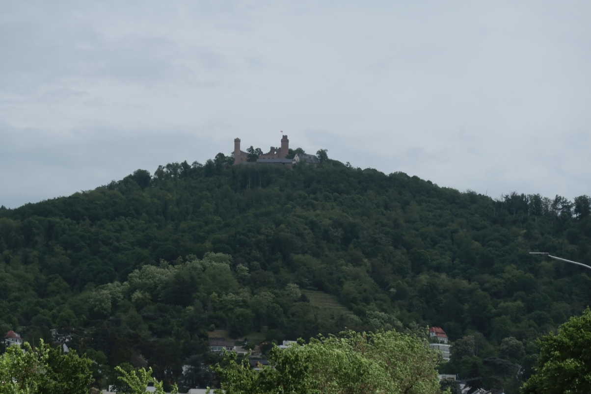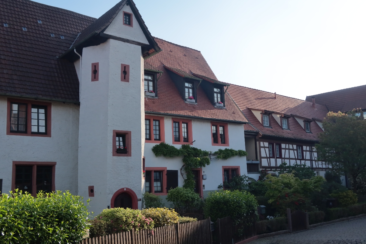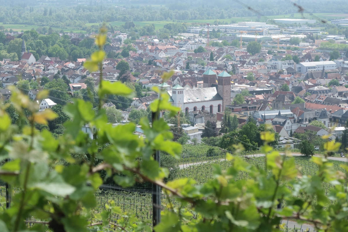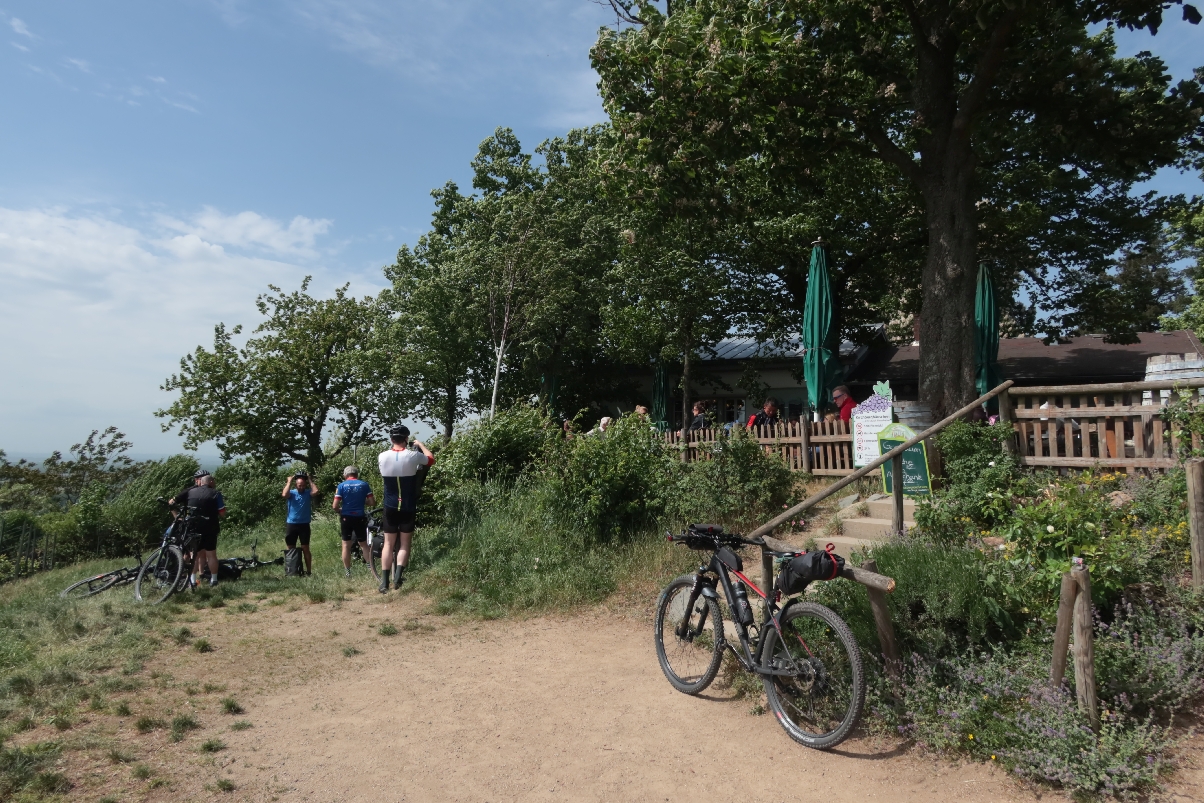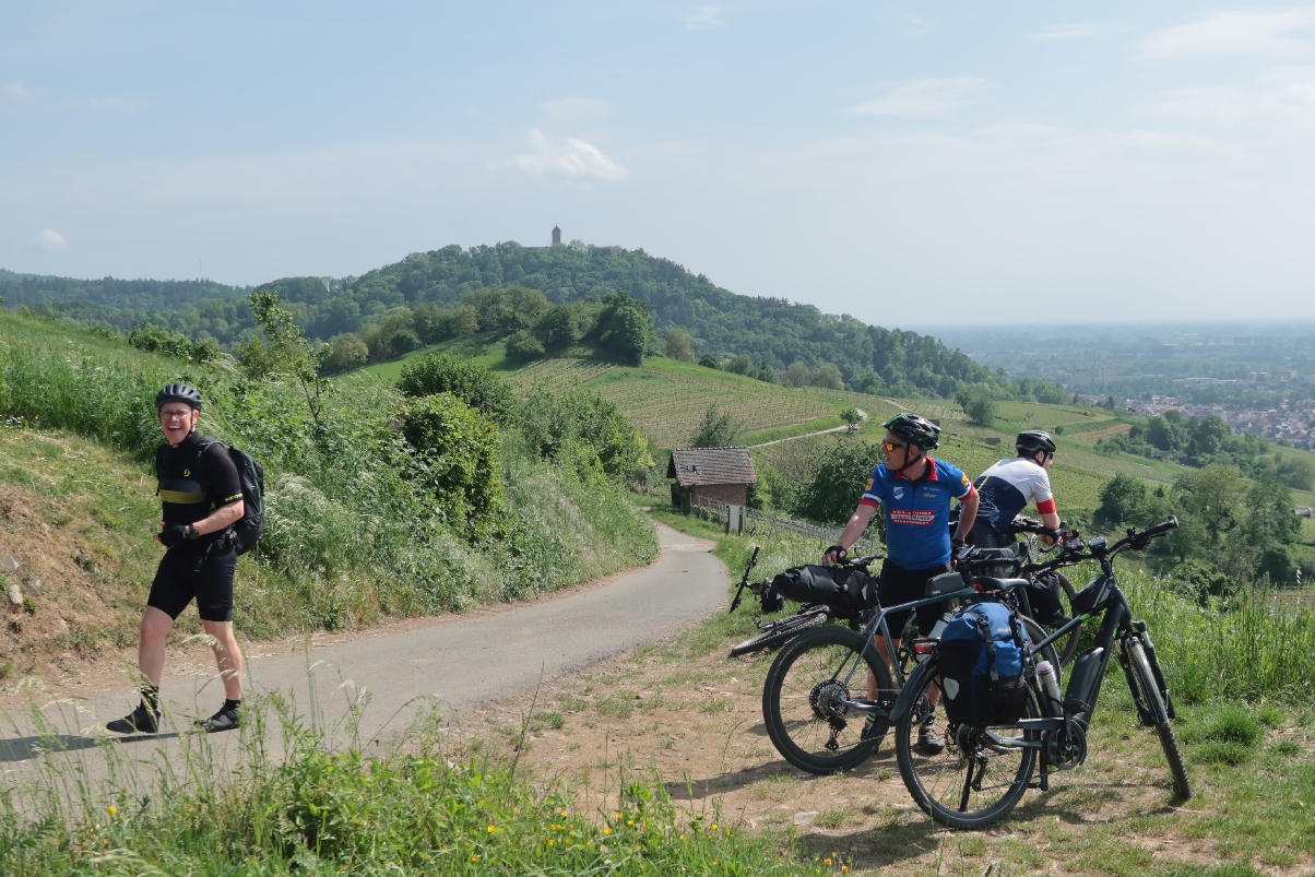 Vor dem Bahnhof wartet bereits Jan und im dezimierten Team geht es los. Erstmal quer durch die Stadt, über den zentralen Luisenplatz am Lange Lui und dem Schloss vorbei zum Woog am östlichen Stadtrand. In einem grossen Bogen führt der Weg durch den Darmstädter Stadtwald in Richtung Süden nach Eberstadt. Bei Malchen ist der „Einstieg“ zur Bergstraße erreicht. Über Seeheim-Jugenheim, Alsbach-Hähnlein, Zwingenberg geht nach Auerbach, wo wir von der Radroute Bergstraße abzweigen. Wir fahren durch das Fürstenlager, einer ländlichen Sommerresidenz des Hauses Hessen-Darmstadt aus dem 18. Jahrhundert. Am Ende des idyllischen Gebäudeemsembles folgt die erste Bergwertung, die mit einem Traumblick auf die Weinberge und Hügel der Bergstraße belohnt wird. Am Kirchberghäuschen, einem Lusttempel der feinen Bensheimer Gesellschaft aus dem 19. Jahrhundert machen wir Mittagsrast. Hoch oben in den Weinbergen ist der Blick ist phantastisch, unter uns Bensheim, dahinter die Starkenburg über Heppenheim und in der Ferne sind im Dunst schemenhaft die Silhouette des Mannheimer Fernsehturms, die Fabriktürme der BASF in Ludwigshafen und das AKW Biblis zu sehen. Nur der Wind bläst uns heftig um die Ohren. Gestärkt mit einer Portion Odenwälder Kochkäse geht es durch den Weinberg steil hinunter nach Bensheim, einmal quer durch die quirlige Innenstadt und am anderen Ende wieder hinauf in die Weinberge. Wir umrunden den Hemsberg und haben erneut einen grandiosen Blick auf die Starkenburg, die Hügel des Odenwaldes und die Rheinebene. Am Ende der 2. Bergwertung folgt die Abfahrt in die Kreisstadt Heppenheim. Wir statten dem mittelalterlichen Markplatz und „Dom“ einen Besuch ab und setzen unsere Fahrt auf der Bergstaße fort. Kurz hinter Heppenheim passieren wir die hessische Landesgrenze. Über Laudenbach und Hemsbach gelangen wir nach Weinheim, wo in der belebten Altstadt eine Eisdiele für Erfrischung sorgt. Lützelsachsen, Leutershausen und Schriesheim sind die nächsten Orte, die wir durchfahren. Wir verlassen die Bergstraße und fahren in westlicher Richtung auf das Etappenziel Ladenburg am Neckar zu. Der Wind bläst uns direkt ins Gesicht….