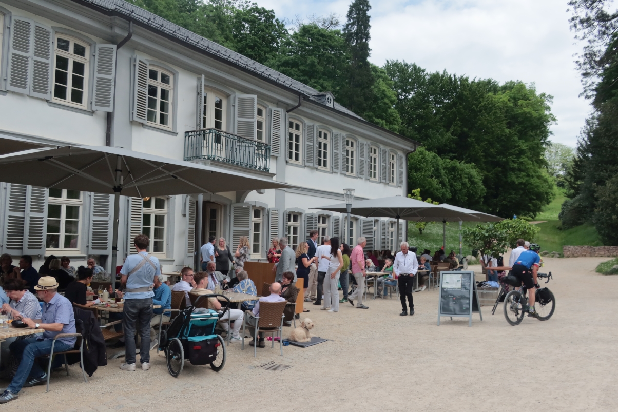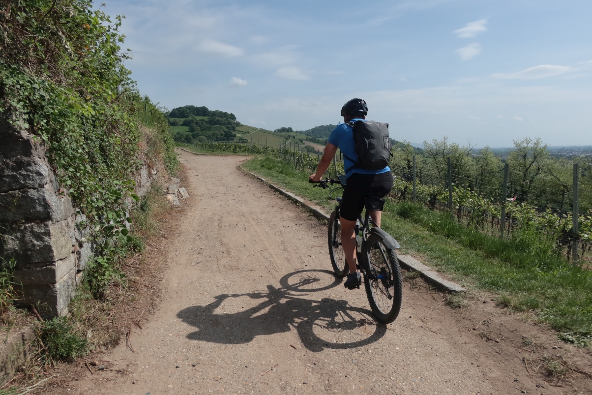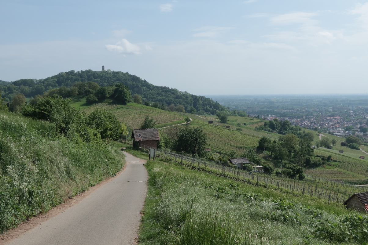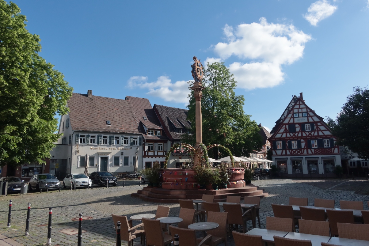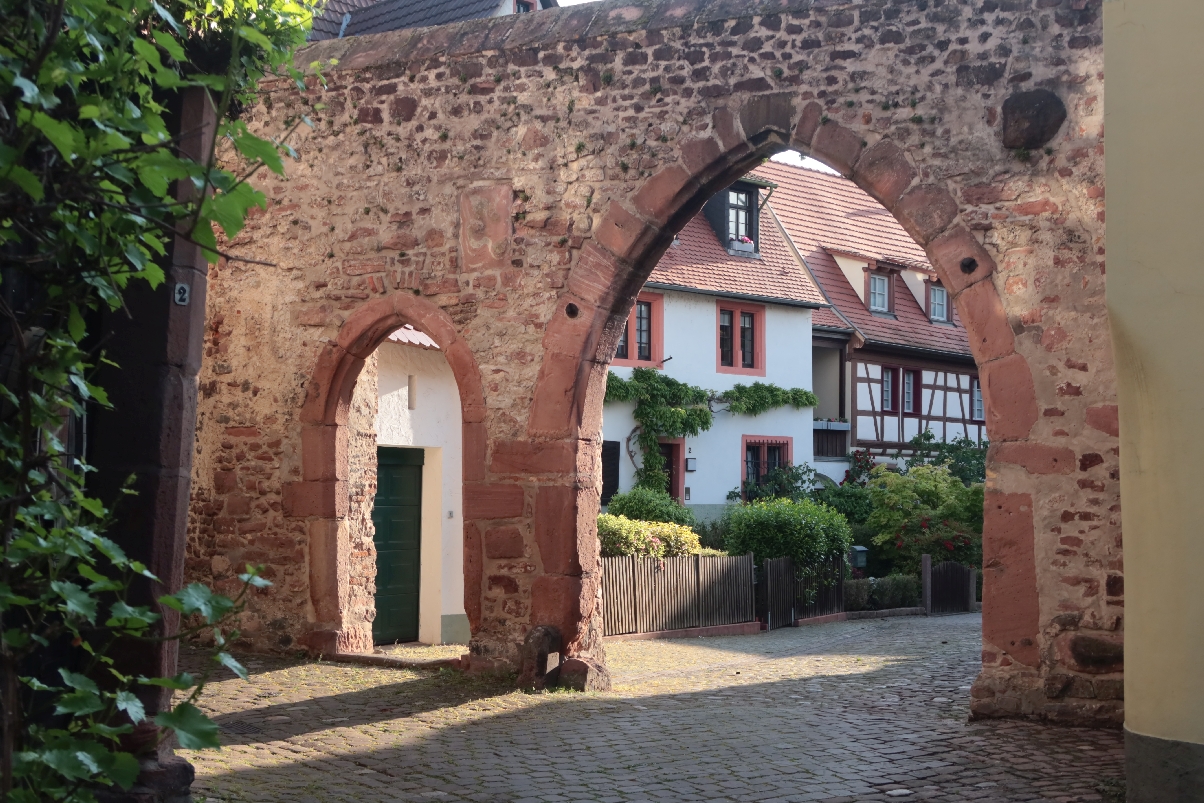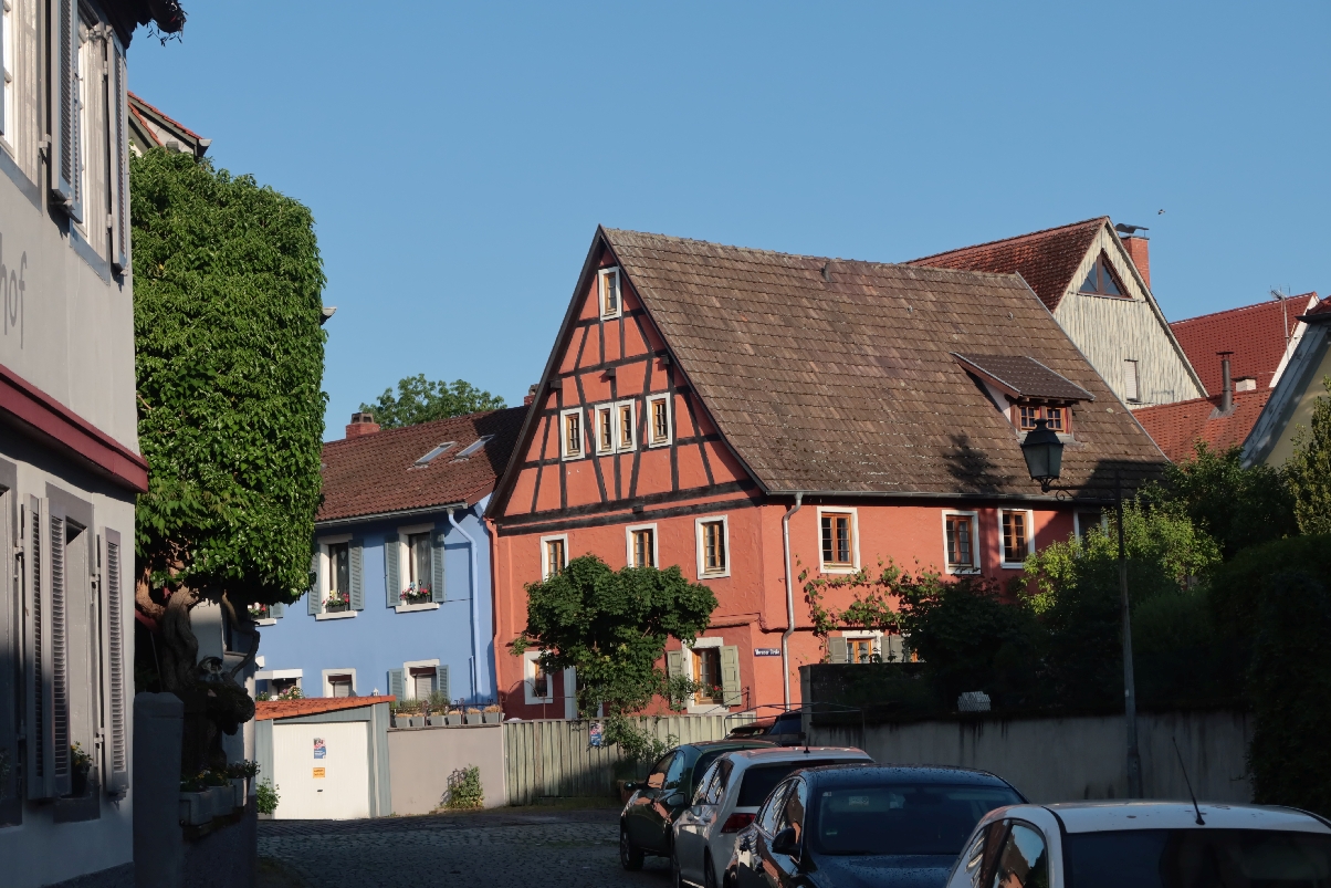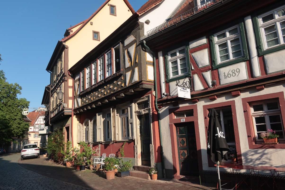 Vor dem Bahnhof wartet bereits Jan und im dezimierten Team geht es los. Erstmal quer durch die Stadt, über den zentralen Luisenplatz am Lange Lui und dem Schloss vorbei zum Woog am östlichen Stadtrand. In einem grossen Bogen führt der Weg durch den Darmstädter Stadtwald in Richtung Süden nach Eberstadt. Bei Malchen ist der „Einstieg“ zur Bergstraße erreicht. Über Seeheim-Jugenheim, Alsbach-Hähnlein, Zwingenberg geht nach Auerbach, wo wir von der Radroute Bergstraße abzweigen. Wir fahren durch das Fürstenlager, einer ländlichen Sommerresidenz des Hauses Hessen-Darmstadt aus dem 18. Jahrhundert. Am Ende des idyllischen Gebäudeemsembles folgt die erste Bergwertung, die mit einem Traumblick auf die Weinberge und Hügel der Bergstraße belohnt wird. Am Kirchberghäuschen, einem Lusttempel der feinen Bensheimer Gesellschaft aus dem 19. Jahrhundert machen wir Mittagsrast. Hoch oben in den Weinbergen ist der Blick ist phantastisch, unter uns Bensheim, dahinter die Starkenburg über Heppenheim und in der Ferne sind im Dunst schemenhaft die Silhouette des Mannheimer Fernsehturms, die Fabriktürme der BASF in Ludwigshafen und das AKW Biblis zu sehen. Nur der Wind bläst uns heftig um die Ohren. Gestärkt mit einer Portion Odenwälder Kochkäse geht es durch den Weinberg steil hinunter nach Bensheim, einmal quer durch die quirlige Innenstadt und am anderen Ende wieder hinauf in die Weinberge. Wir umrunden den Hemsberg und haben erneut einen grandiosen Blick auf die Starkenburg, die Hügel des Odenwaldes und die Rheinebene. Am Ende der 2. Bergwertung folgt die Abfahrt in die Kreisstadt Heppenheim. Wir statten dem mittelalterlichen Markplatz und „Dom“ einen Besuch ab und setzen unsere Fahrt auf der Bergstaße fort. Kurz hinter Heppenheim passieren wir die hessische Landesgrenze. Über Laudenbach und Hemsbach gelangen wir nach Weinheim, wo in der belebten Altstadt eine Eisdiele für Erfrischung sorgt. Lützelsachsen, Leutershausen und Schriesheim sind die nächsten Orte, die wir durchfahren. Wir verlassen die Bergstraße und fahren in westlicher Richtung auf das Etappenziel Ladenburg am Neckar zu. Der Wind bläst uns direkt ins Gesicht….