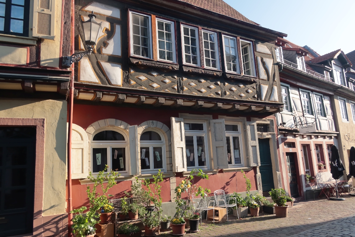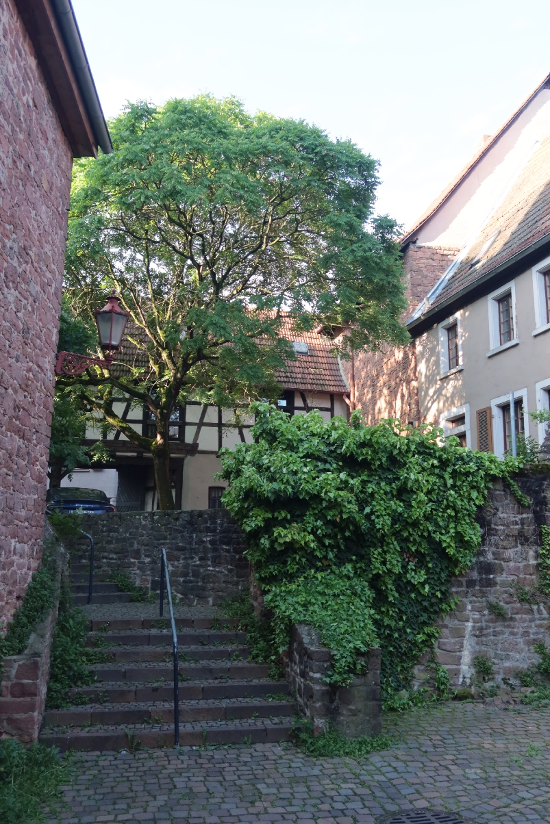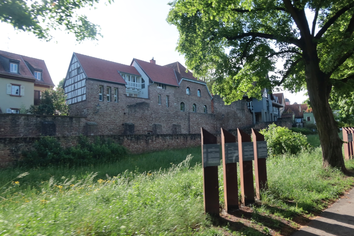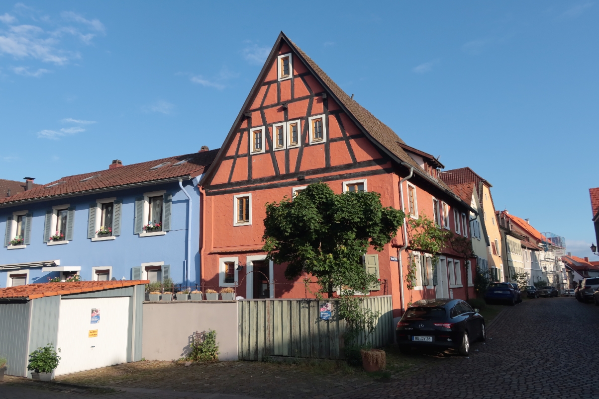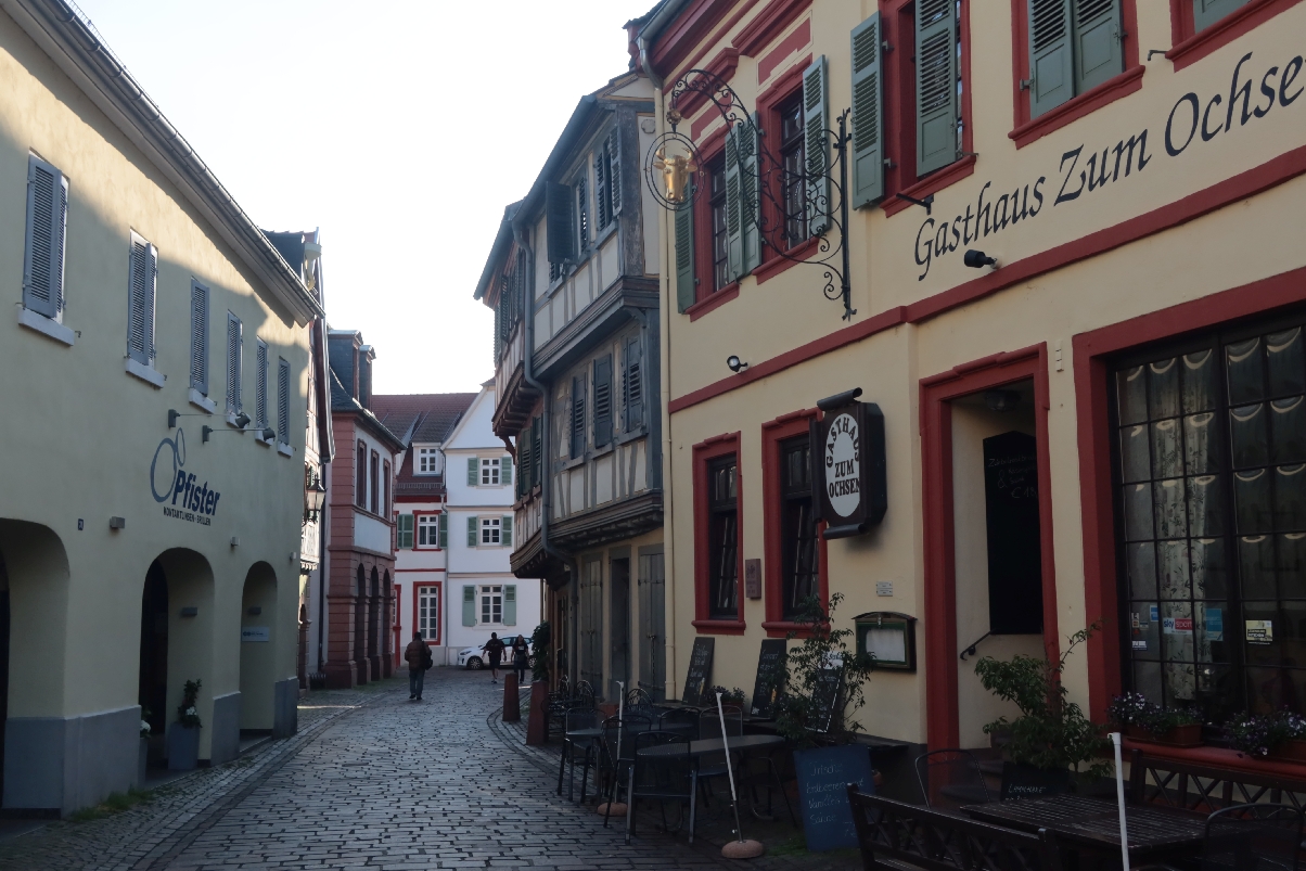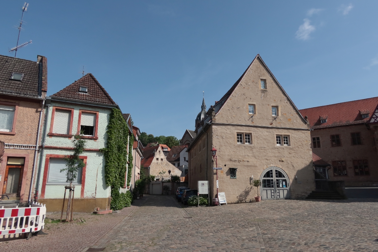 Vor dem Bahnhof wartet bereits Jan und im dezimierten Team geht es los. Erstmal quer durch die Stadt, über den zentralen Luisenplatz am Lange Lui und dem Schloss vorbei zum Woog am östlichen Stadtrand. In einem grossen Bogen führt der Weg durch den Darmstädter Stadtwald in Richtung Süden nach Eberstadt. Bei Malchen ist der „Einstieg“ zur Bergstraße erreicht. Über Seeheim-Jugenheim, Alsbach-Hähnlein, Zwingenberg geht nach Auerbach, wo wir von der Radroute Bergstraße abzweigen. Wir fahren durch das Fürstenlager, einer ländlichen Sommerresidenz des Hauses Hessen-Darmstadt aus dem 18. Jahrhundert. Am Ende des idyllischen Gebäudeemsembles folgt die erste Bergwertung, die mit einem Traumblick auf die Weinberge und Hügel der Bergstraße belohnt wird. Am Kirchberghäuschen, einem Lusttempel der feinen Bensheimer Gesellschaft aus dem 19. Jahrhundert machen wir Mittagsrast. Hoch oben in den Weinbergen ist der Blick ist phantastisch, unter uns Bensheim, dahinter die Starkenburg über Heppenheim und in der Ferne sind im Dunst schemenhaft die Silhouette des Mannheimer Fernsehturms, die Fabriktürme der BASF in Ludwigshafen und das AKW Biblis zu sehen. Nur der Wind bläst uns heftig um die Ohren. Gestärkt mit einer Portion Odenwälder Kochkäse geht es durch den Weinberg steil hinunter nach Bensheim, einmal quer durch die quirlige Innenstadt und am anderen Ende wieder hinauf in die Weinberge. Wir umrunden den Hemsberg und haben erneut einen grandiosen Blick auf die Starkenburg, die Hügel des Odenwaldes und die Rheinebene. Am Ende der 2. Bergwertung folgt die Abfahrt in die Kreisstadt Heppenheim. Wir statten dem mittelalterlichen Markplatz und „Dom“ einen Besuch ab und setzen unsere Fahrt auf der Bergstaße fort. Kurz hinter Heppenheim passieren wir die hessische Landesgrenze. Über Laudenbach und Hemsbach gelangen wir nach Weinheim, wo in der belebten Altstadt eine Eisdiele für Erfrischung sorgt. Lützelsachsen, Leutershausen und Schriesheim sind die nächsten Orte, die wir durchfahren. Wir verlassen die Bergstraße und fahren in westlicher Richtung auf das Etappenziel Ladenburg am Neckar zu. Der Wind bläst uns direkt ins Gesicht….