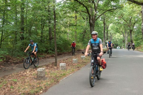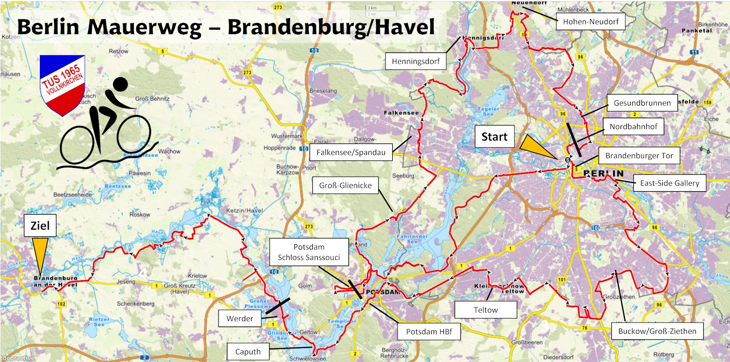 Die 32. Auflage der TUS-Radwanderung führte die Gruppe in die Hauptstadt nach Berlin, wo der ehemalige Westteil der Stadt auf dem Mauerweg umrundet wurde. Nach der Ankunft am Berliner Hauptbahnhof ging es zunächst quer durch die Stadt in Richtung Westen bis zum Grunewald. Nach einem Abstecher auf den Teufelsberg mit Besichtigung der ehemaligen Radaranlagen führte die Route über den Wannsee nach Potsdam, dem Ziel der ersten Etappe. Die Zweite Etappe startete mit einem Rundgang durch den Schlosspark Sanssouci und folgte dann dem Verlauf der einstigen Grenzanlagen der DDR zu West-Berlin. Auf dem ehemaligen Zollweg ging es durch romantische Wälder, weitläufige Felder und malerische Wiesen, vorbei an Flüssen und idyllischen Seen bis ins Zentrum von Berlin. Am dritten Tag wurde der innerstädtische Teil des Mauerwegs befahren. Im Zickzack quer durch die Stadt, vorbei an historischen Gebäuden und moderner Architektur. Sightseeing auf zwei Rädern. Im Südosten kurz nach dem Flughafen Schönefeld wurde es wieder ländlich, ursprüngliche Natur direkt vor den Toren der Stadt. Teilweise führte der Weg entlang des ehemaligen Kolonnenweges mit charakteristischen Betonplatten, den die DDR-Grenztruppen für ihre Kontrollfahrten nutzten. Wieder in Potsdam angekommen wurde die Fahrt an der Havel bis Werder/Havel fortgesetzt. Die Schlussetappe führte auf dem Havelradweg meist entlang des Deiches mit Blick auf grüne Wiesen und den Fluss nach Brandenburg. Insgesamt wurden 306km und 1320 Höhenmeter zurückgelegt.
