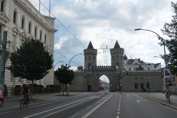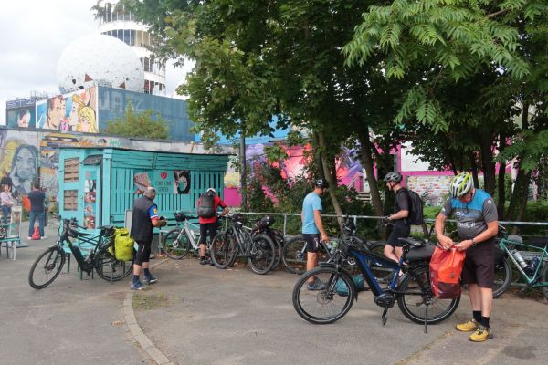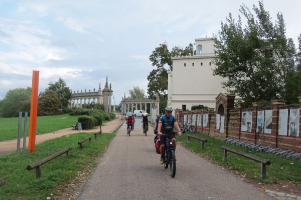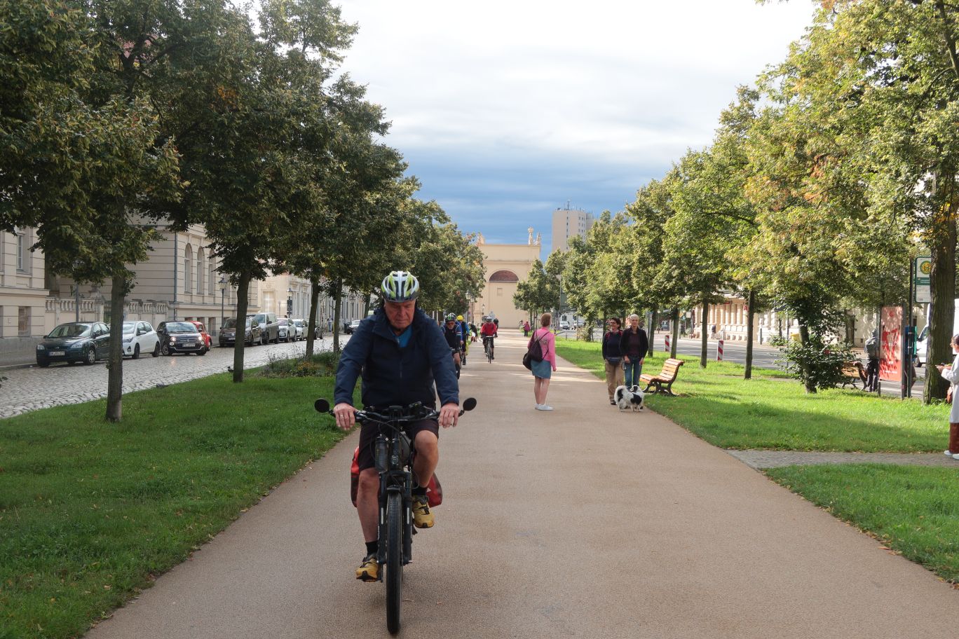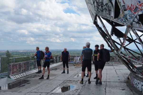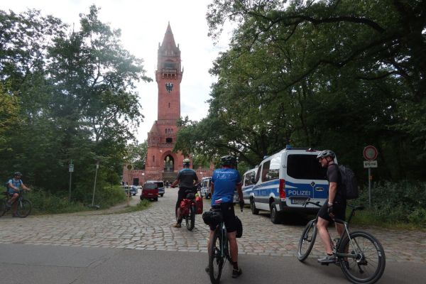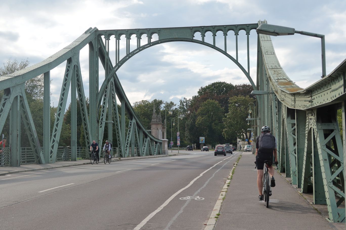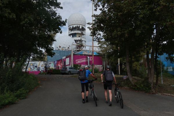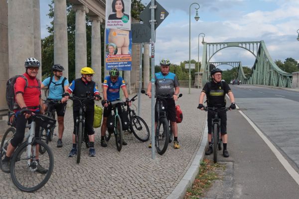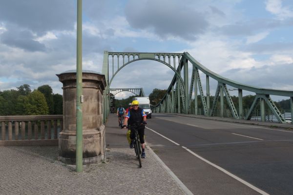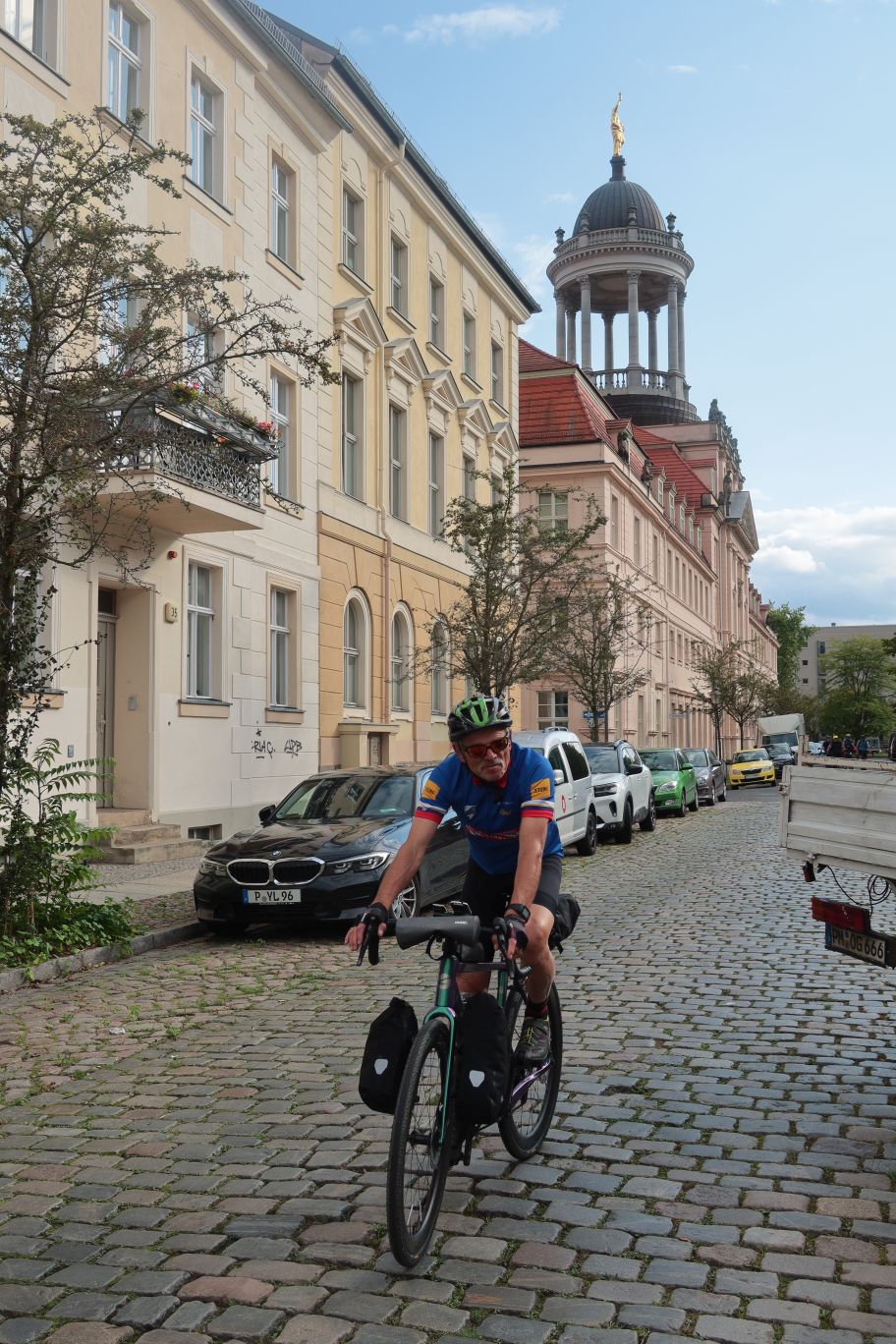 Ein Abstecher führte uns hinauf auf den Teufelsberg. Der 120m hohe Trümmerberg mit der alten Radarstation auf dem Gipfel, zweithöchste Erhebung im Stadtgebiet von Berlin, war dann auch die erste Bergwertung des Tages und brachte unseren Berliner Kollegen gleich schon ordentlich außer Puste 😊 Tja, wer mit Gipfelstürmer unterwegs ist, muss immer auch da mit Bergen rechnen, wo man sie am wenigsten vermutet. Von der Plattform der Radarkuppeln bot sich ein 360° Blick über ganz Berlin. Ein Besuch des kleinen Alliertenmuseums rundete die „Lost-Place Exkursion“ auf dem Teufelsberg ab. Weiter ging es durch quer durch den Grunewald. Bis zum Grunewaldturm waren nochmal zwei kurze aber steile Rampen zu bewältigen. Von wegen Berlin ist flach, die Steigungsprozente lagen im zweistelligen Bereich. Entlang breiter Alleen führte der Weg nun nach Süden parallel zur Havel bis zum Wannsee. Vorbei an prächtigen Villen, die die Uferpromenade säumten steuerten wir auf die Pfaueninsel zu, liessen die aber links (bzw. rechts) liegen und fuhren weiter zur Stadtgrenze Berlins. An der Glienickerbrücke, wo früher Spione ausgetauscht wurden, verabschiedeten wir uns von unserem Gastradler Stefan und folgten nun einem ersten Stück Mauerweg bis zum Schloss Cäcilienhof, Tagungsort der Potsdamer Konferenz 1945. Von dort aus gelangten wir über das Nauener Tor in die Altstadt von Potsdam. Vorbei am Holländischen Viertel, Mitte des 18. Jhd. unter „Soldatenkönig“ Friedrich Wilhelm I im Zuge der Stadterweiterung nach dem Vorbild holländischer Backsteinhäuser errichtet, war es nur noch ein kurzer Weg zu unserer Unterkunft am Grossen Waisenhaus. Gerade noch rechtzeitig bevor ein Gewitter aufzog.