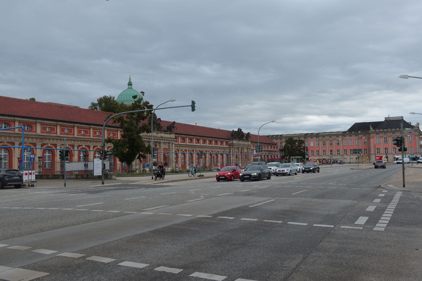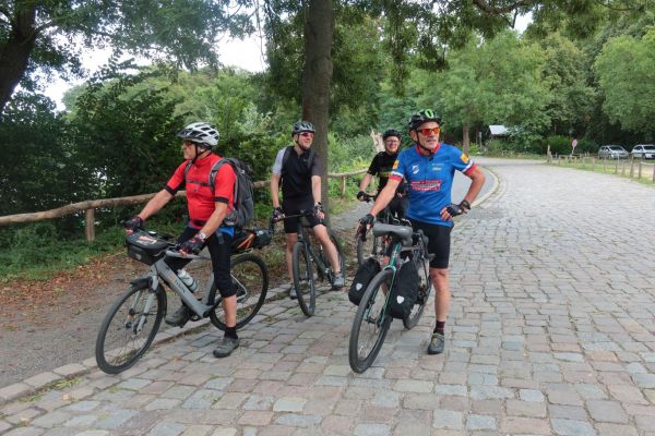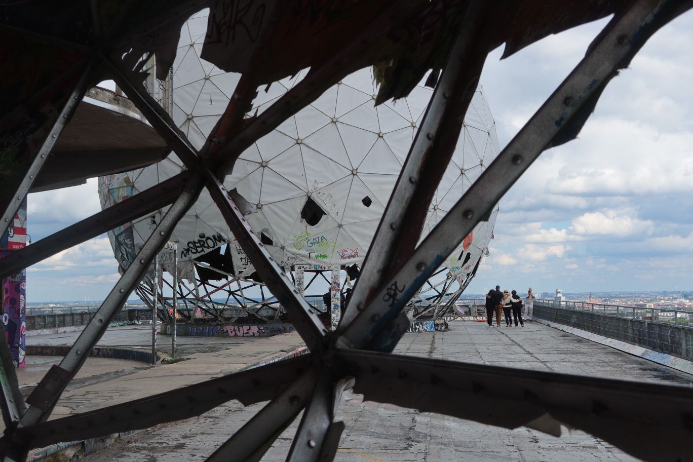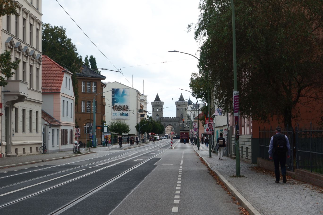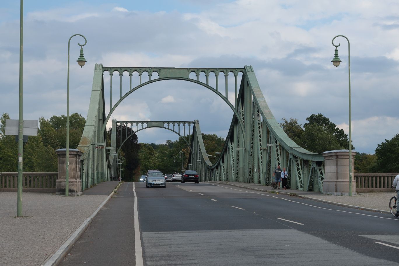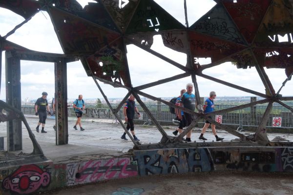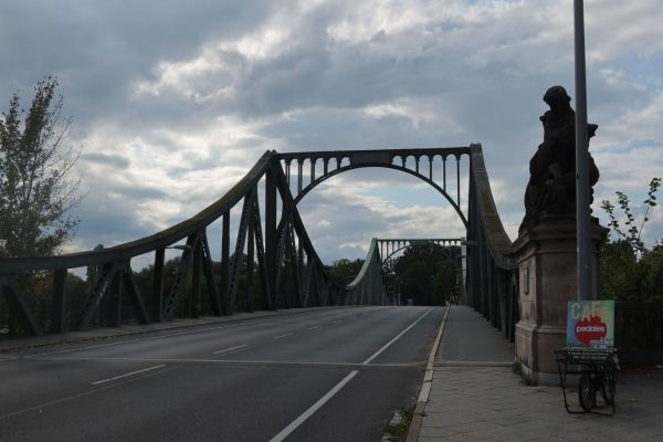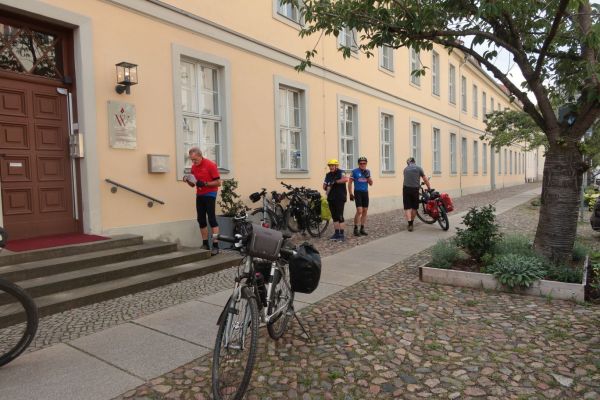 Ein Abstecher führte uns hinauf auf den Teufelsberg. Der 120m hohe Trümmerberg mit der alten Radarstation auf dem Gipfel, zweithöchste Erhebung im Stadtgebiet von Berlin, war dann auch die erste Bergwertung des Tages und brachte unseren Berliner Kollegen gleich schon ordentlich außer Puste 😊 Tja, wer mit Gipfelstürmer unterwegs ist, muss immer auch da mit Bergen rechnen, wo man sie am wenigsten vermutet. Von der Plattform der Radarkuppeln bot sich ein 360° Blick über ganz Berlin. Ein Besuch des kleinen Alliertenmuseums rundete die „Lost-Place Exkursion“ auf dem Teufelsberg ab. Weiter ging es durch quer durch den Grunewald. Bis zum Grunewaldturm waren nochmal zwei kurze aber steile Rampen zu bewältigen. Von wegen Berlin ist flach, die Steigungsprozente lagen im zweistelligen Bereich. Entlang breiter Alleen führte der Weg nun nach Süden parallel zur Havel bis zum Wannsee. Vorbei an prächtigen Villen, die die Uferpromenade säumten steuerten wir auf die Pfaueninsel zu, liessen die aber links (bzw. rechts) liegen und fuhren weiter zur Stadtgrenze Berlins. An der Glienickerbrücke, wo früher Spione ausgetauscht wurden, verabschiedeten wir uns von unserem Gastradler Stefan und folgten nun einem ersten Stück Mauerweg bis zum Schloss Cäcilienhof, Tagungsort der Potsdamer Konferenz 1945. Von dort aus gelangten wir über das Nauener Tor in die Altstadt von Potsdam. Vorbei am Holländischen Viertel, Mitte des 18. Jhd. unter „Soldatenkönig“ Friedrich Wilhelm I im Zuge der Stadterweiterung nach dem Vorbild holländischer Backsteinhäuser errichtet, war es nur noch ein kurzer Weg zu unserer Unterkunft am Grossen Waisenhaus. Gerade noch rechtzeitig bevor ein Gewitter aufzog.