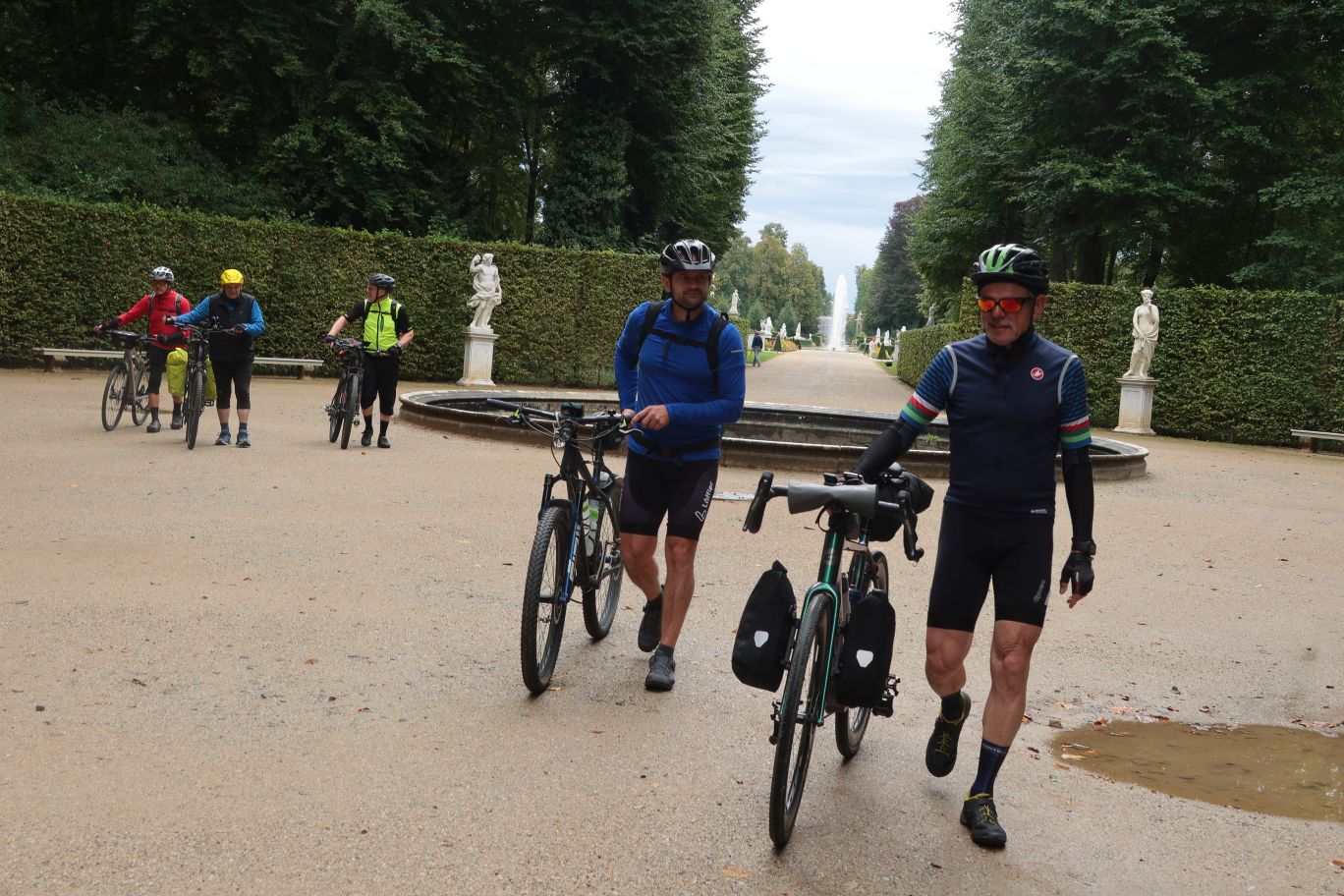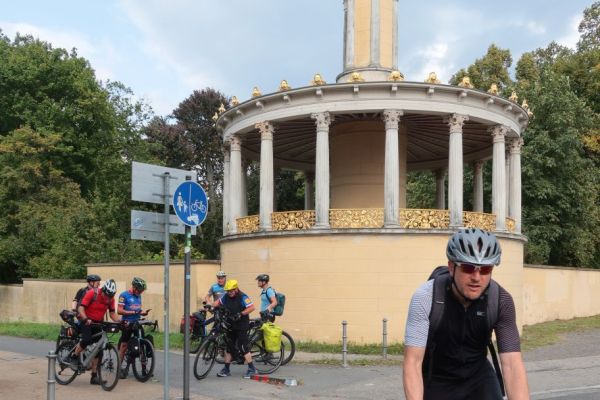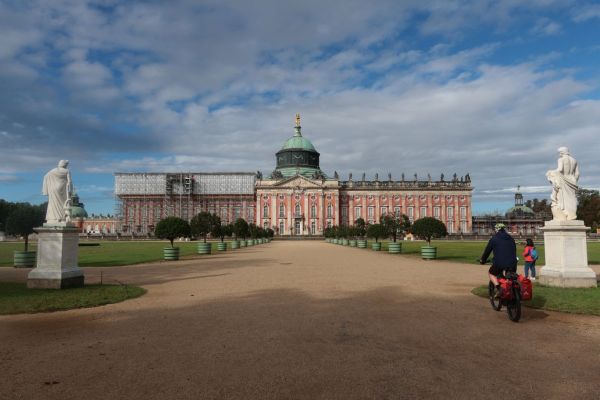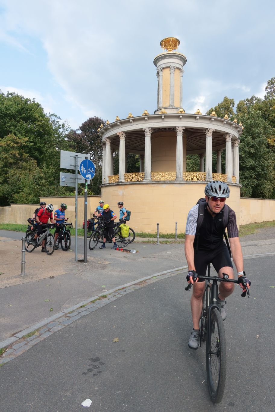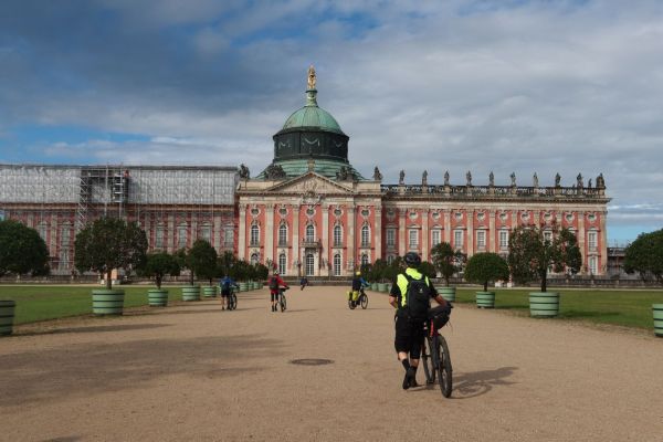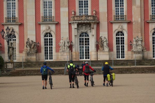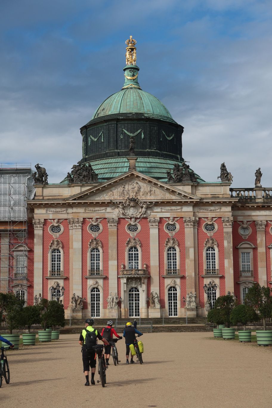 Die 2. Etappe begann mit einer kleinen Runde durch Potsdam: Stadtschloss, Alter Markt mit Nikolaikirche und dann durch das Potsdamer Brandenburger Tor. Das Kopfsteinpflaster der Altstadt forderte sein erstes Opfer: Edwin meldete einen platten Vorderreifen. Nach der Reparaturpause ging die Besichtigungstour weiter, direkt in den Schlosspark Sanssouci. Gruppenfoto vor der Freitreppe mit Schloss im Hintergrund. Die nächsten 1,5km im Park mussten wir schiebend zurücklegen. Erst beim Neuen Palais, der Sommerresidenz der preußischen Könige, konnten wir uns wieder auf den Sattel schwingen und die Tour fortsetzen. Vorbei am Orangerieschloß und der Rückseite von Schloß Sanssouci ging es zur nächsten Sehenswürdigkeit Potsdams, der russischen Kolonie Alexandrowka, die 1826 von König Friedrich Wilhelm III für die Mitglieder eines ehemaligen russisches Soldatenchors angelegt wurde.