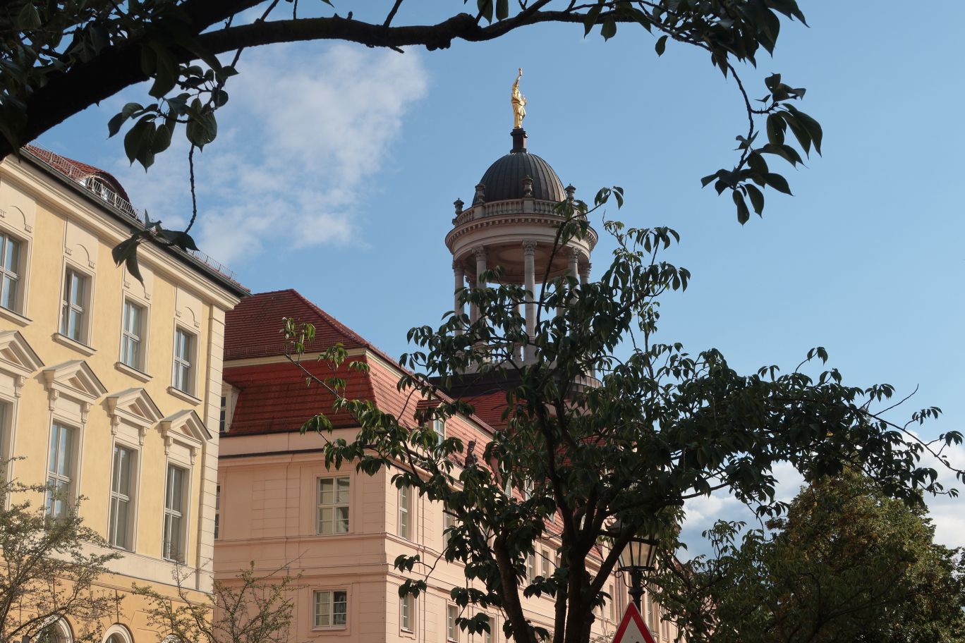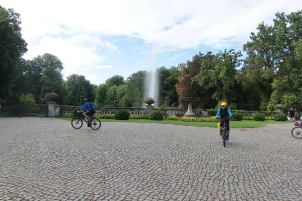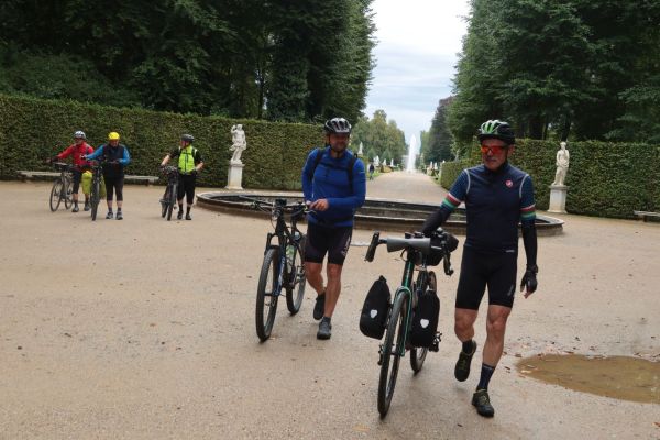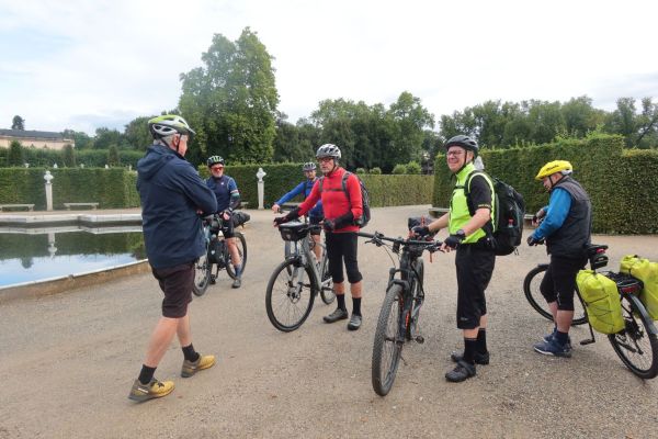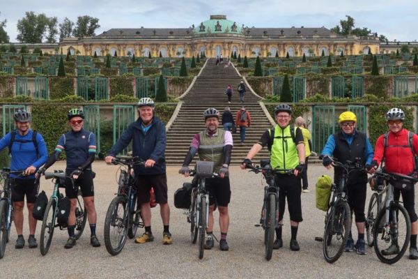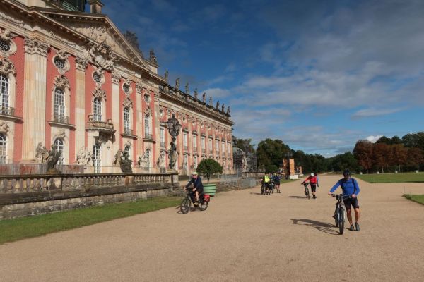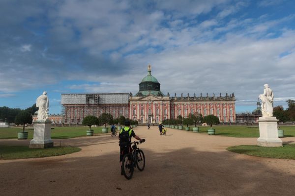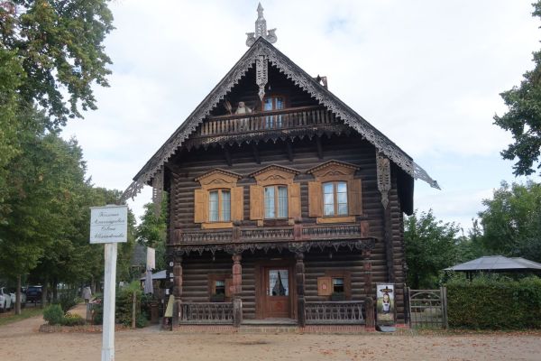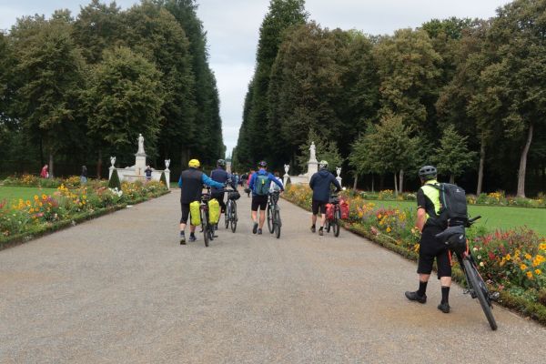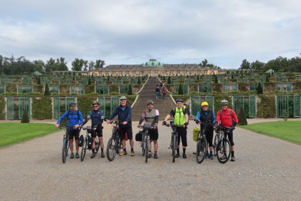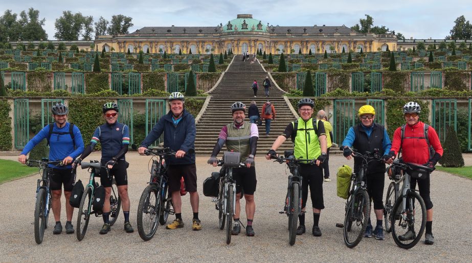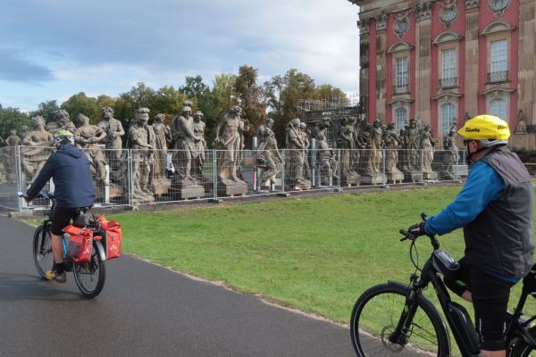Die 2. Etappe begann mit einer kleinen Runde durch Potsdam: Stadtschloss, Alter Markt mit Nikolaikirche und dann durch das Potsdamer Brandenburger Tor. Das Kopfsteinpflaster der Altstadt forderte sein erstes Opfer: Edwin meldete einen platten Vorderreifen. Nach der Reparaturpause ging die Besichtigungstour weiter, direkt in den Schlosspark Sanssouci. Gruppenfoto vor der Freitreppe mit Schloss im Hintergrund. Die nächsten 1,5km im Park mussten wir schiebend zurücklegen. Erst beim Neuen Palais, der Sommerresidenz der preußischen Könige, konnten wir uns wieder auf den Sattel schwingen und die Tour fortsetzen. Vorbei am Orangerieschloß und der Rückseite von Schloß Sanssouci ging es zur nächsten Sehenswürdigkeit Potsdams, der russischen Kolonie Alexandrowka, die 1826 von König Friedrich Wilhelm III für die Mitglieder eines ehemaligen russisches Soldatenchors angelegt wurde.